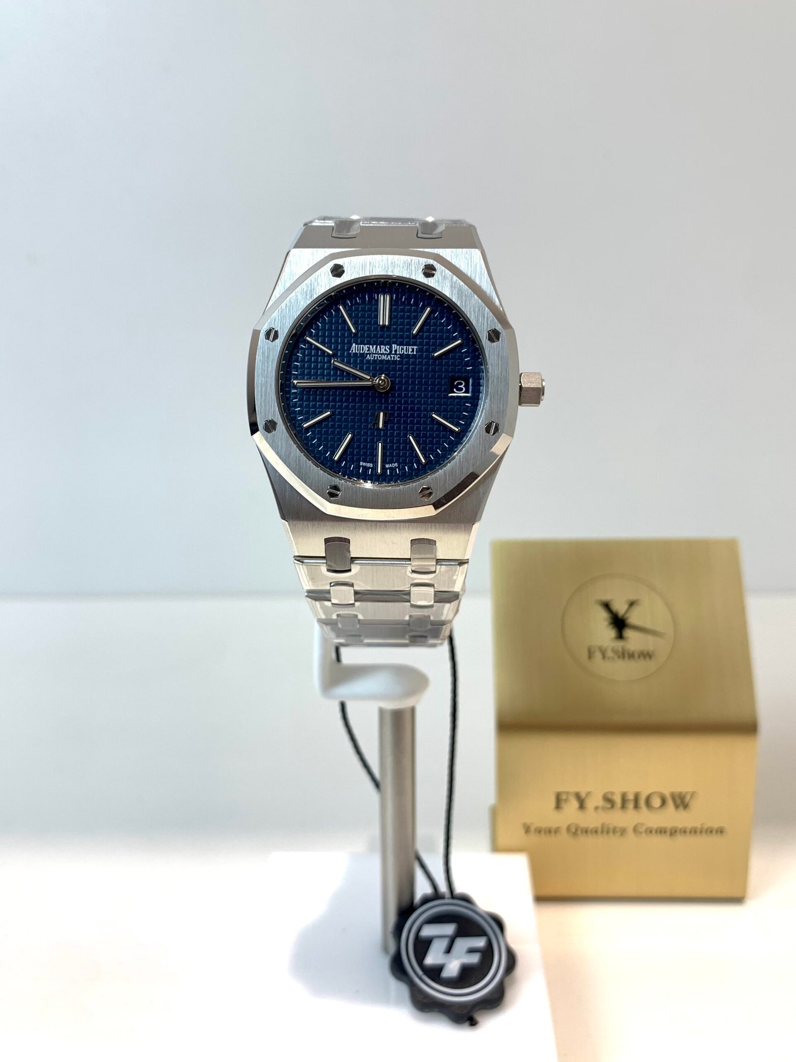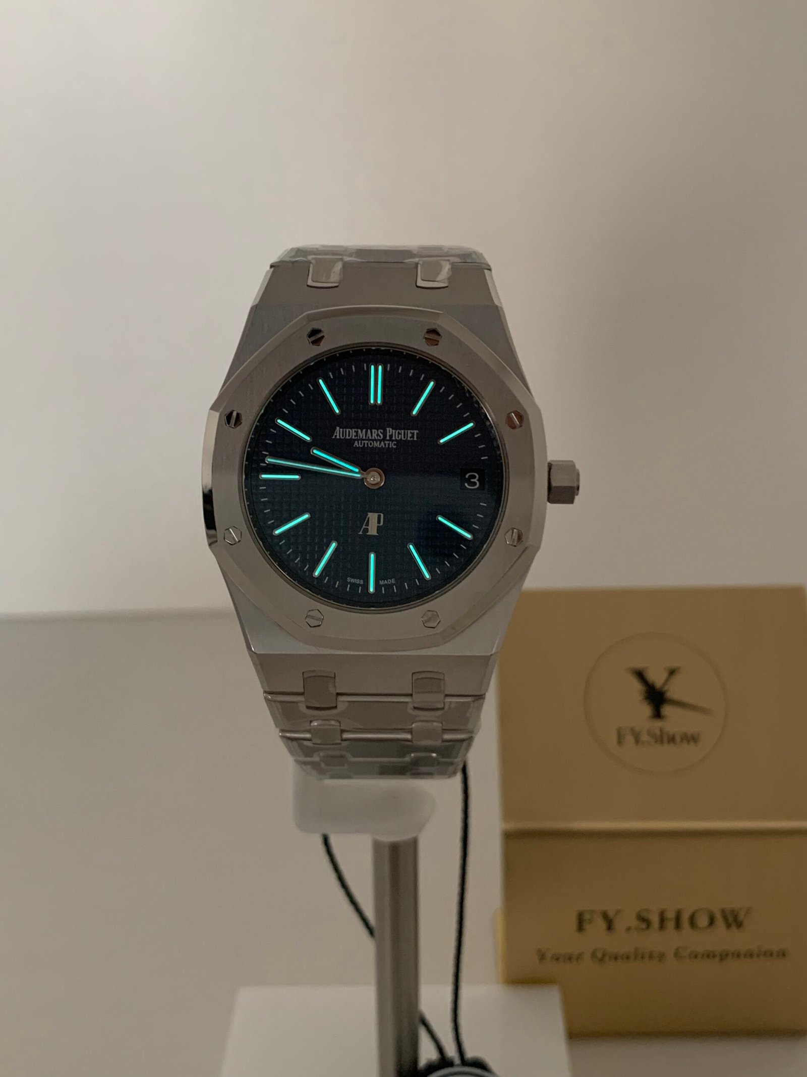The signature Petite Tapisserie small square pattern is deeply engraved with perfect symmetry and light play—matching the genuine’s texture and depth. The vibrant royal blue finish shifts from bright to deep navy in different lighting. Applied white gold luminous stick indices and Royal Oak hands are coated with Super-LumiNova for optimal legibility. The 3 o’clock date window is perfectly positioned and sized, with crisp printing.