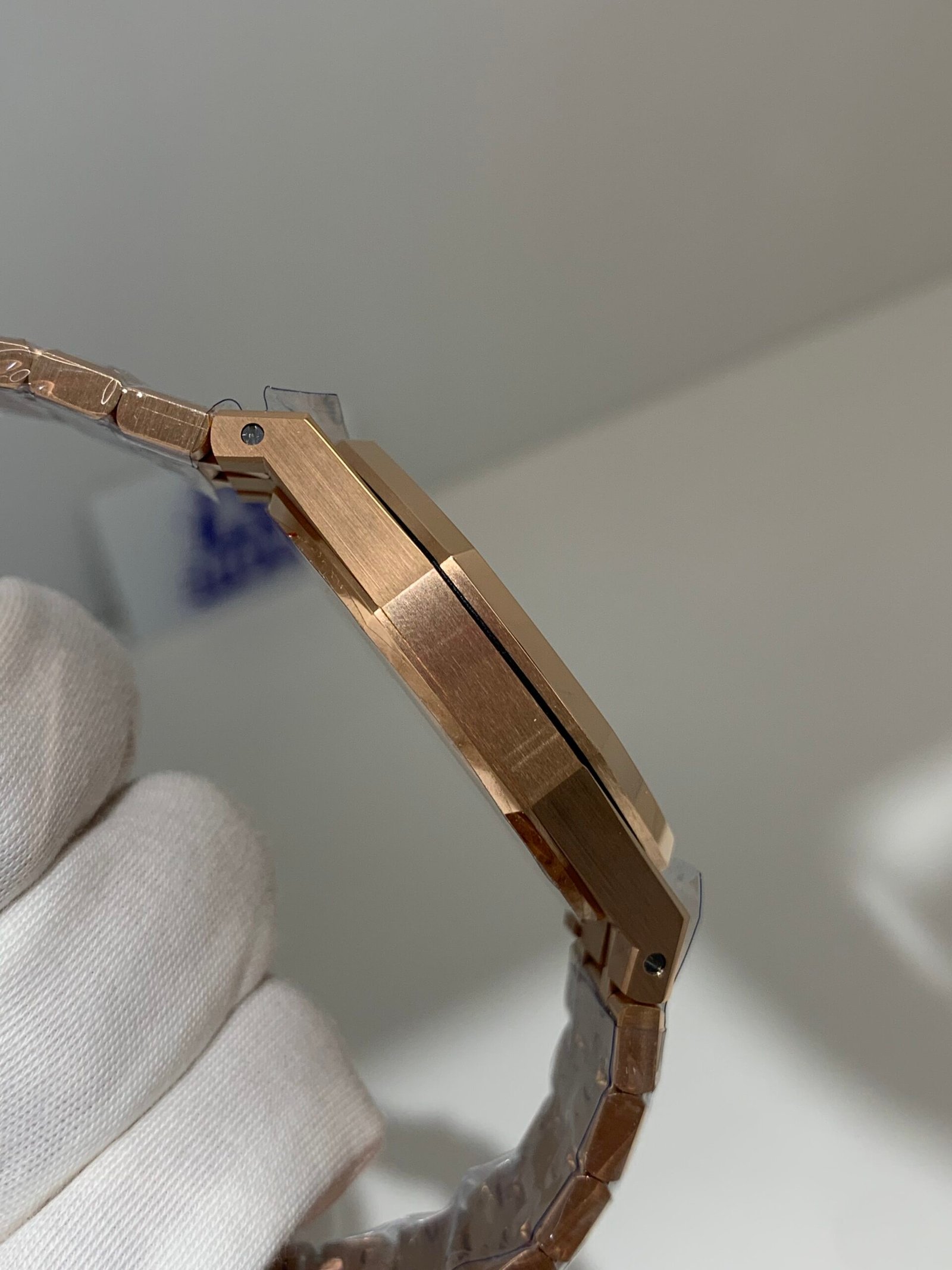 Vertical brushing on the face with sharp, high-polish beveled edges. The 8 hexagonal rose gold screws are perfectly recessed and aligned to genuine spec.