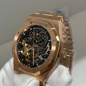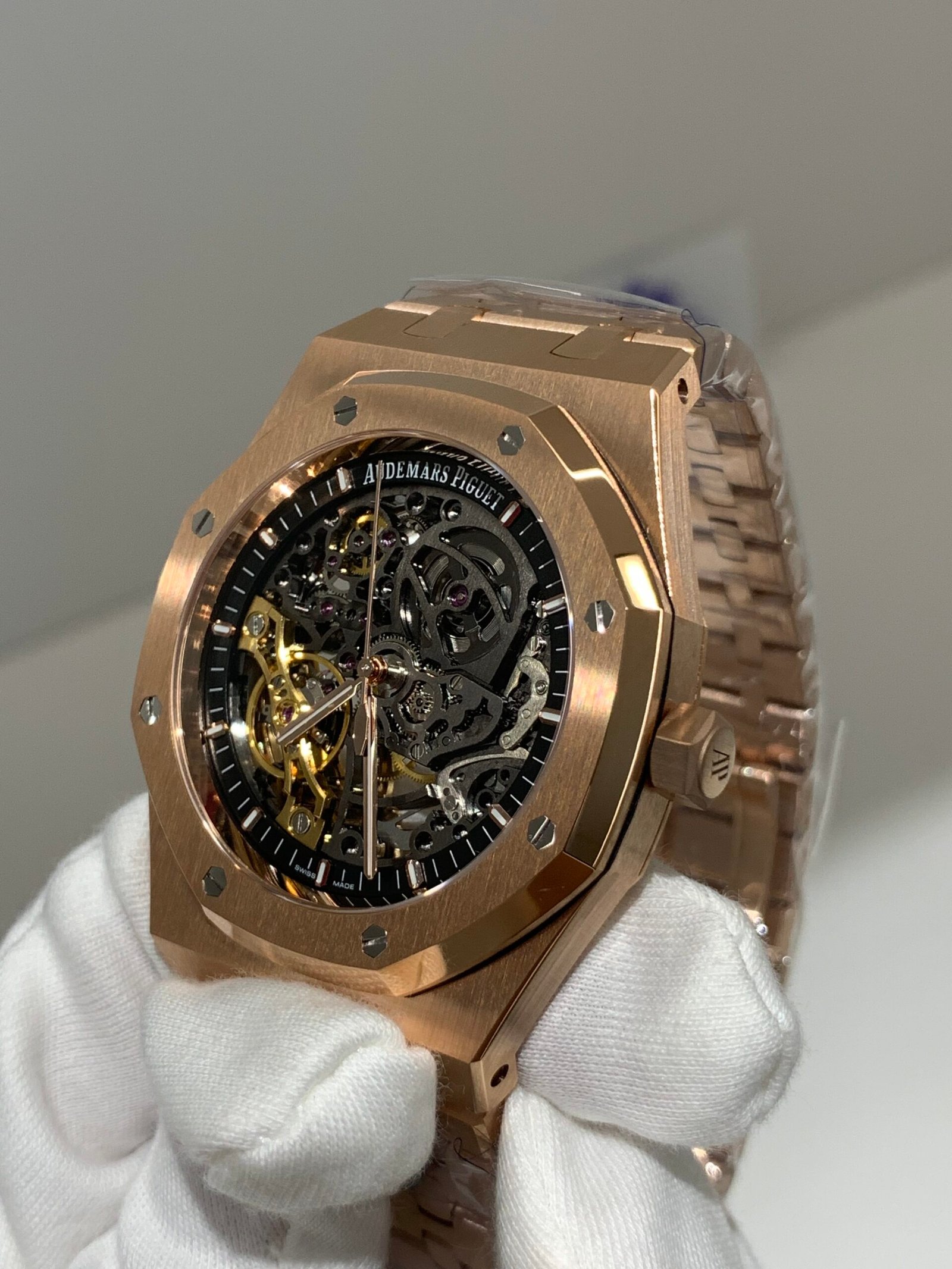 The ultimate expression of mechanical artistry and luxury, featuring the iconic double balance wheel system and skeletonized dial that reveals AP’s horological mastery, with factory-perfect dimensions and finishing.