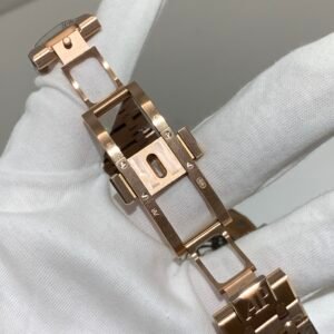 Constructed from 316L stainless steel with heavy, durable 18k rose gold plating (5 mils). The brushing and polishing on the case, bezel and integrated bracelet are executed to exact factory standards, with razor-sharp edges, clean lines and perfect light reflection that mimics the luster of solid rose gold.