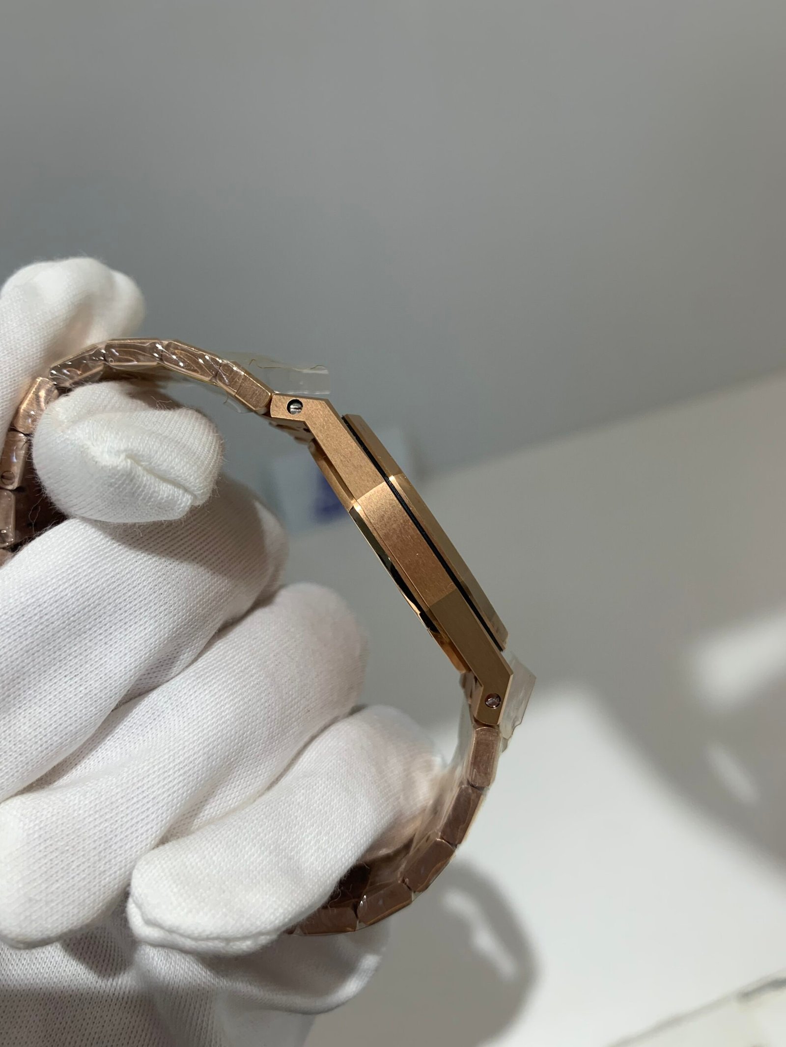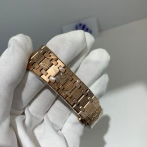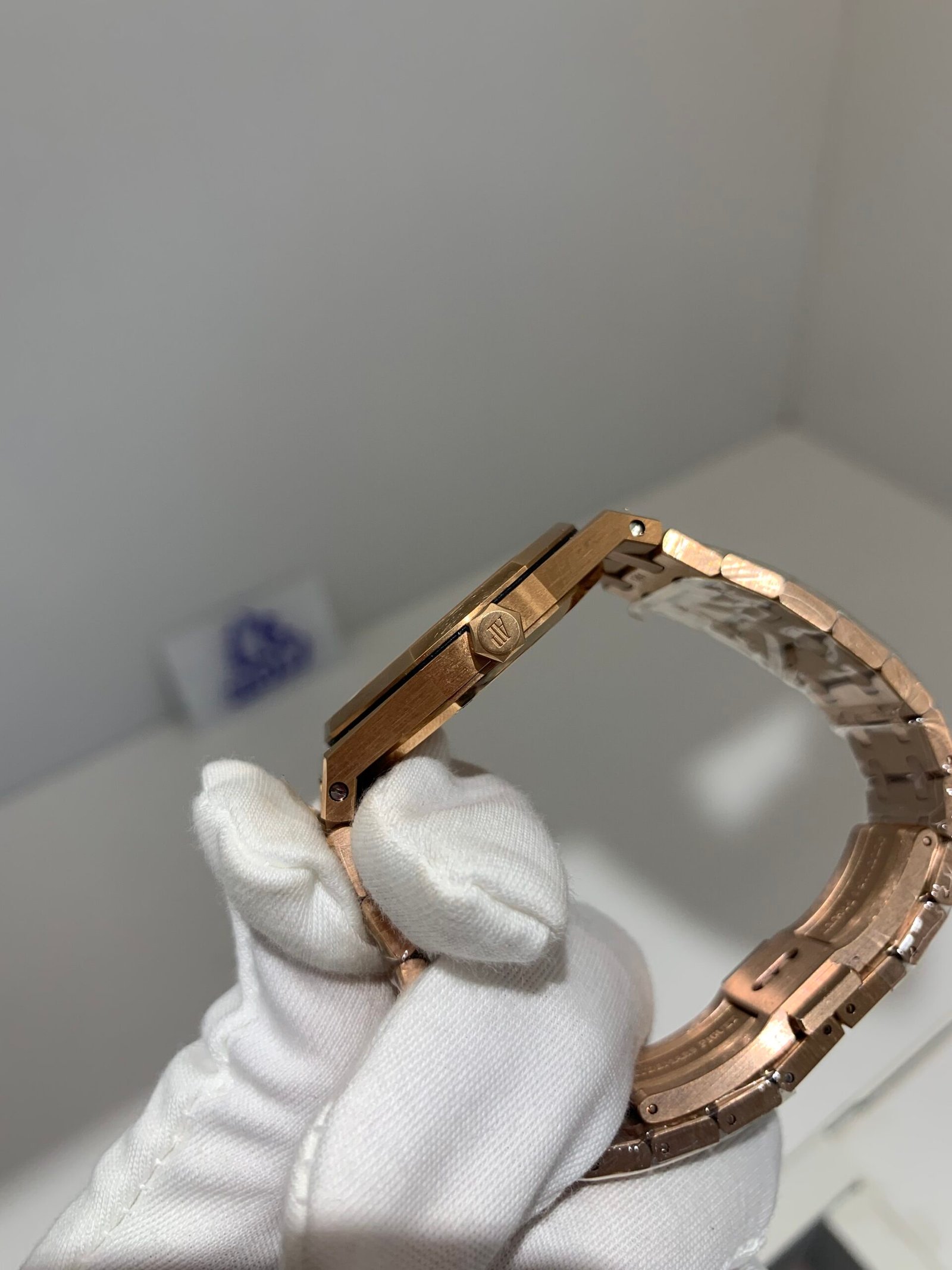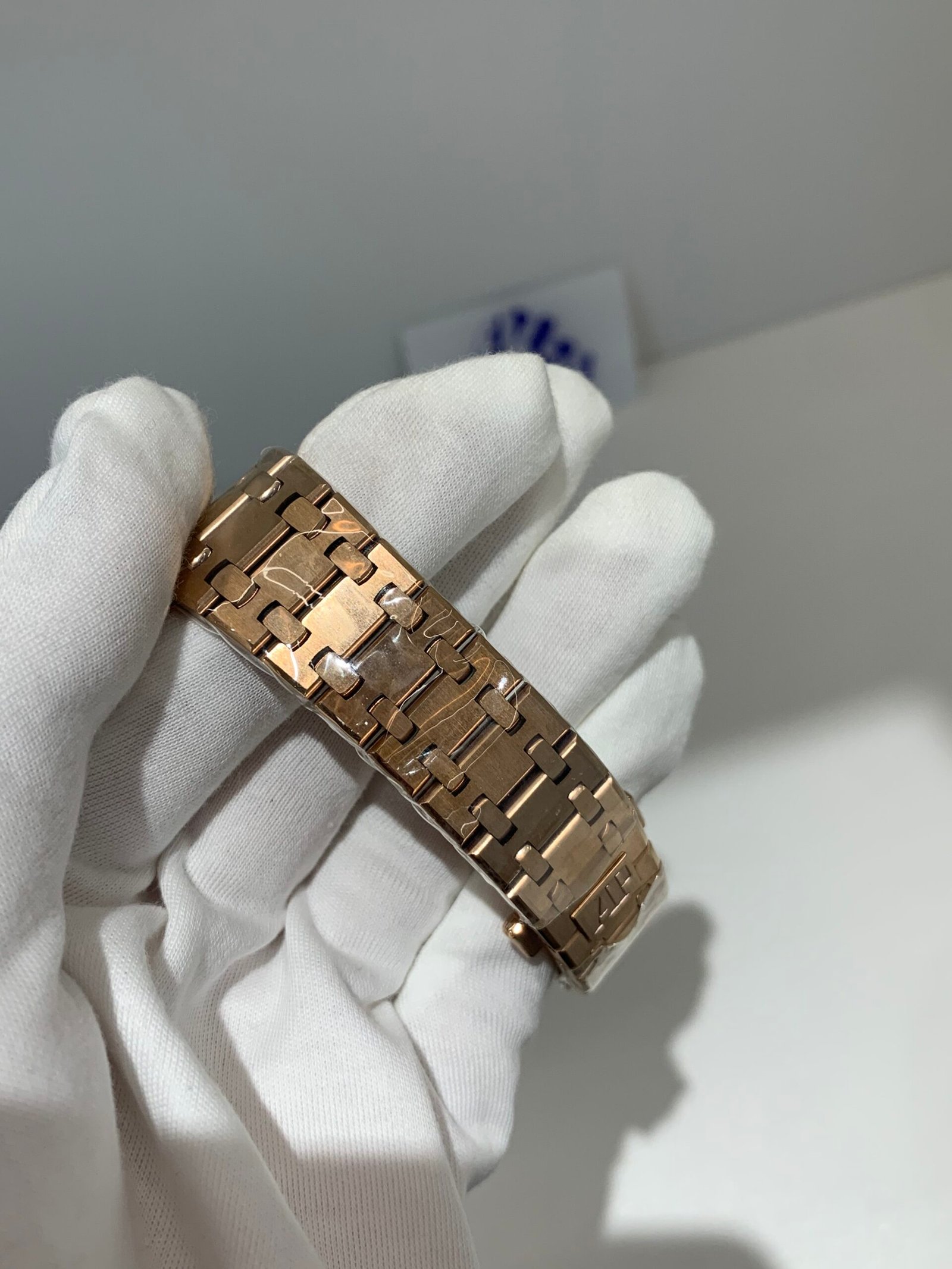 Constructed from 316L stainless steel with heavy 18k rose gold plating (5 mils). The brushing direction on the case and bracelet links is razor-sharp, matching the genuine Royal Oak’s signature finish. The integrated bracelet features the iconic “brick” pattern with polished inner surfaces for exceptional comfort.