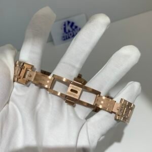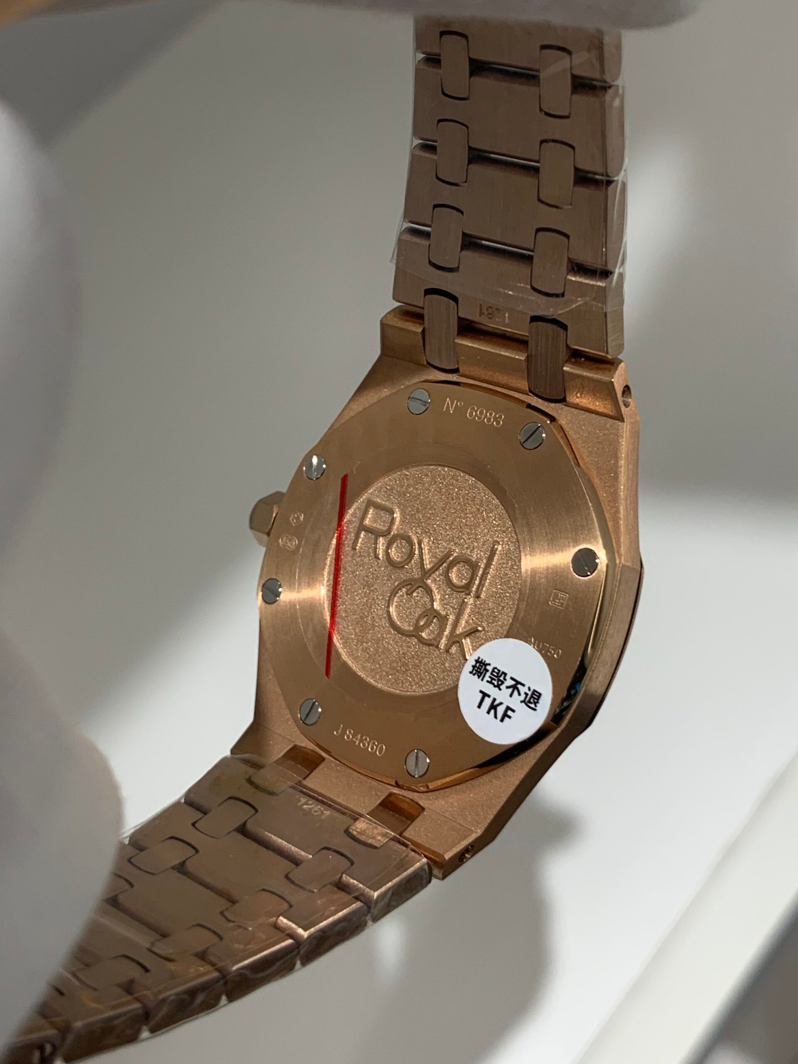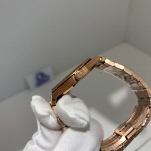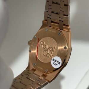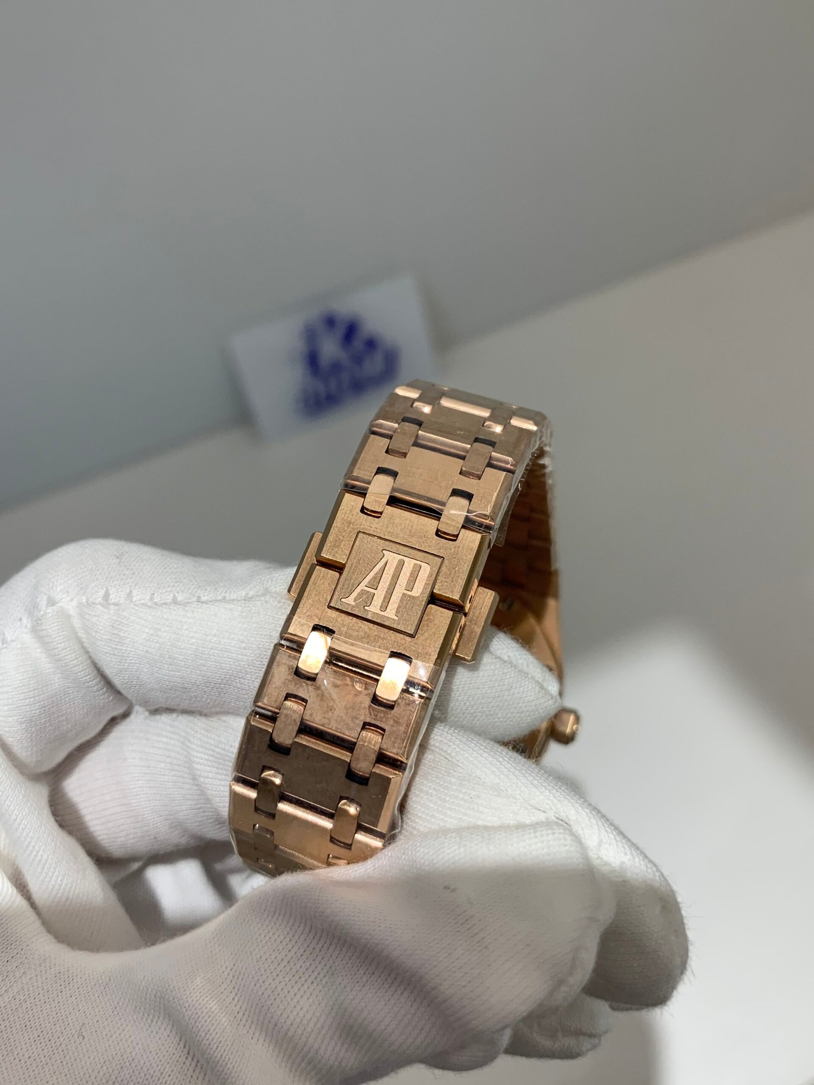 Constructed from 316L stainless steel with heavy 18k rose gold plating (5 mils). The brushing direction on the case and bracelet links is razor-sharp, matching the genuine Royal Oak’s signature finish. The integrated bracelet features the iconic “brick” pattern with polished inner surfaces for exceptional comfort.