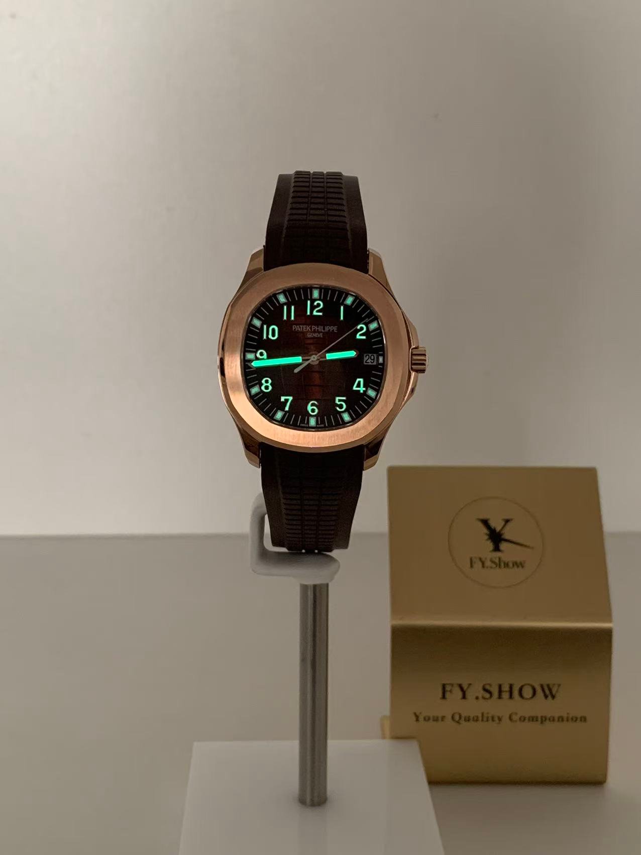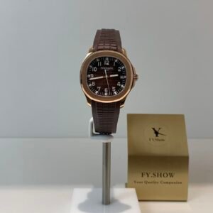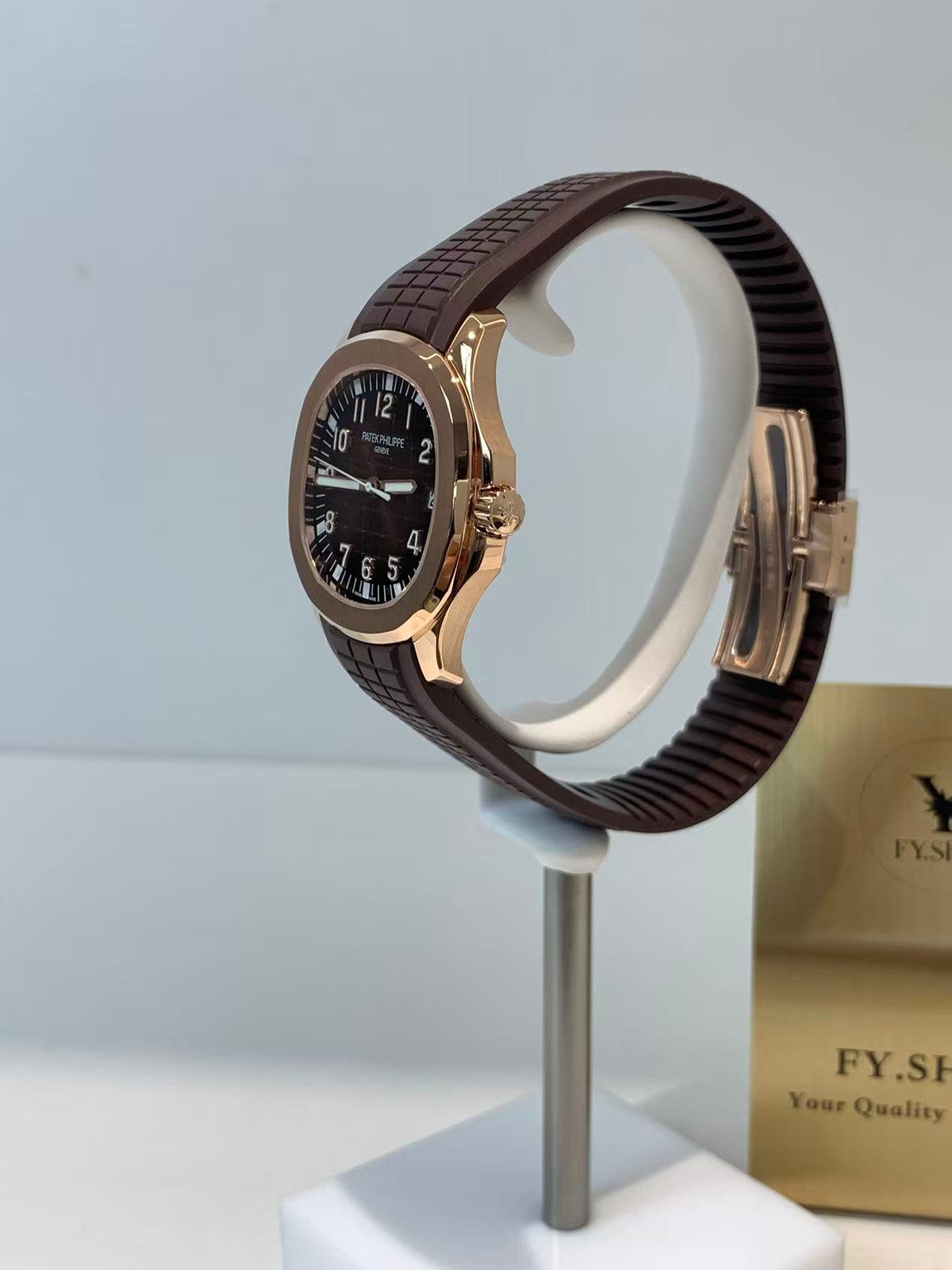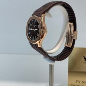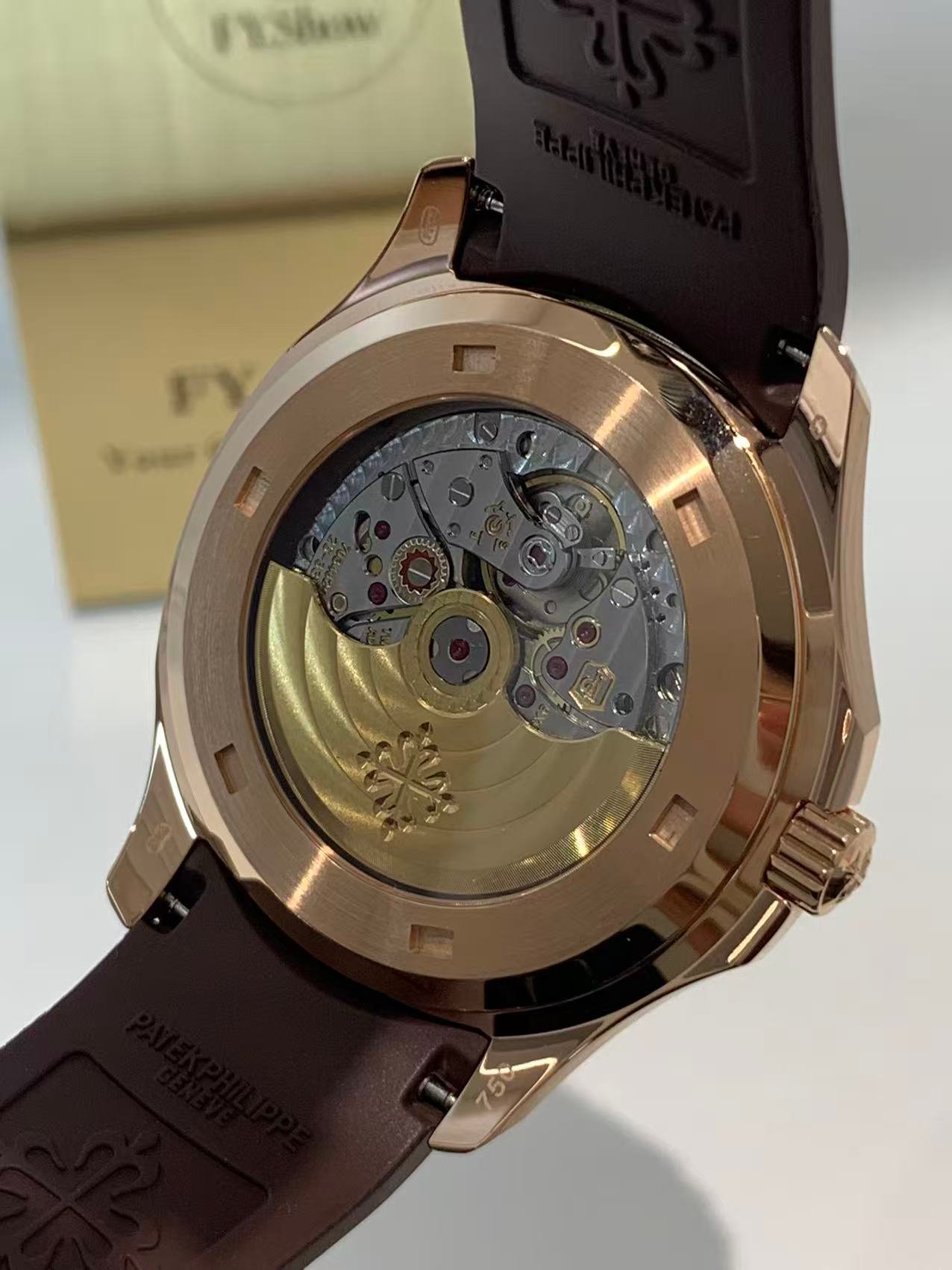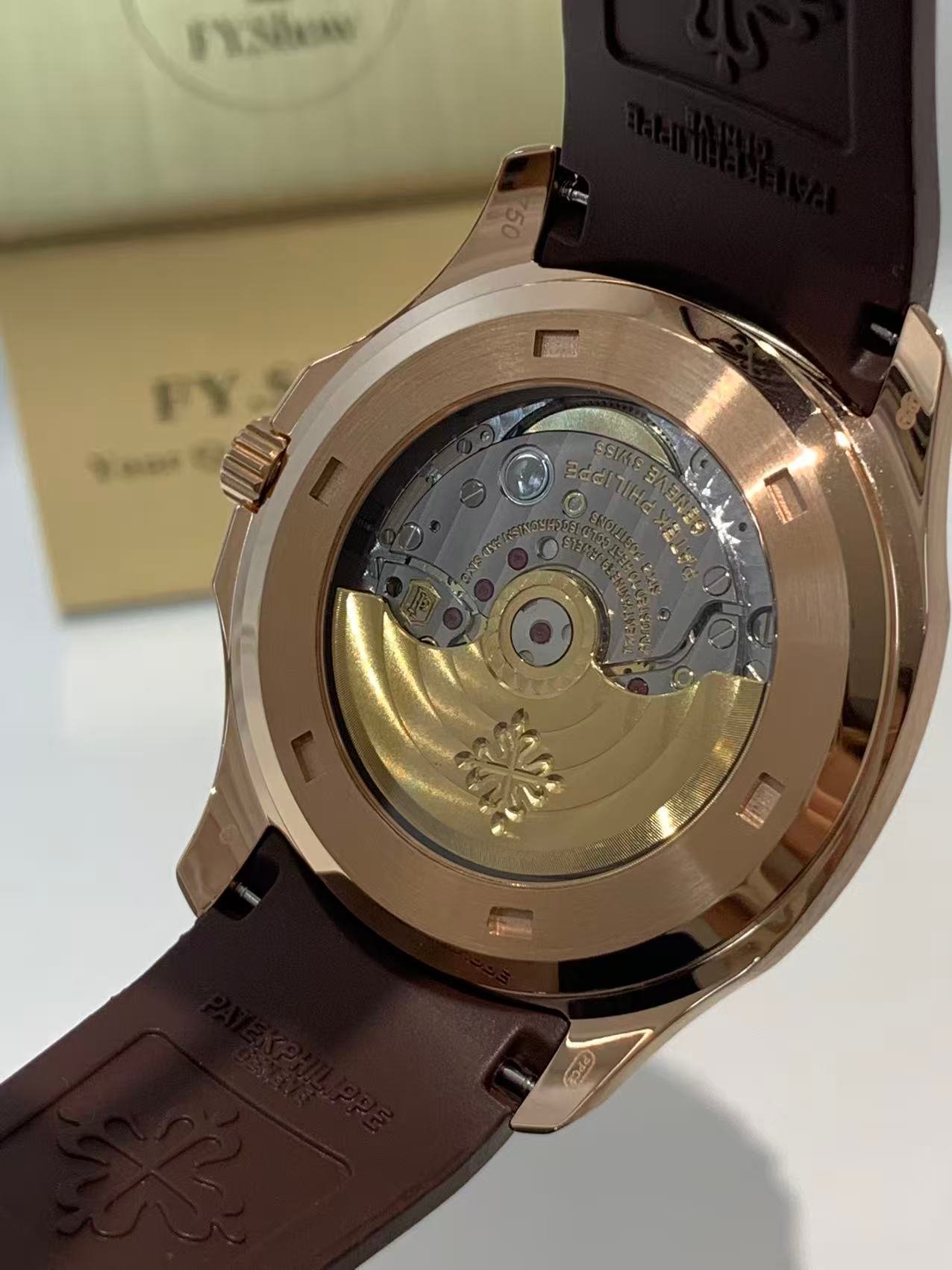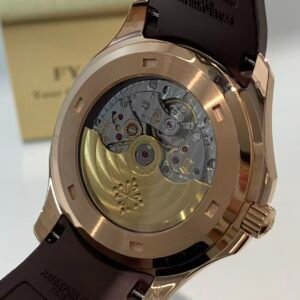Sunburst brown dial with a black-gradient rim, featuring the embossed Aquanaut “checkerboard” patternPatek Philippe. Applied rose gold-style Arabic numerals and baton hands are coated with Super-LumiNova for low-light visibilityPatek Philippe. Date window at 3 o’clock is perfectly aligned and unobtrusive.