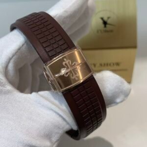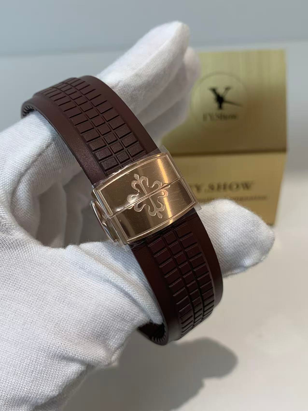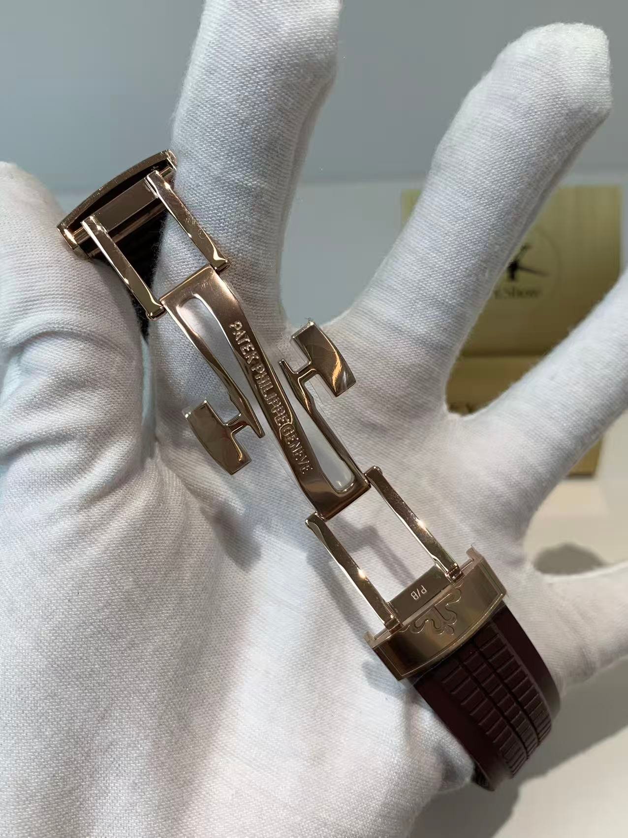 3KF’s signature soft and flexible composite material strap. Finished with the iconic Aquanaut patented fold-over clasp in rose gold PVD, engraved with the Patek Philippe logoPatek Philippe.