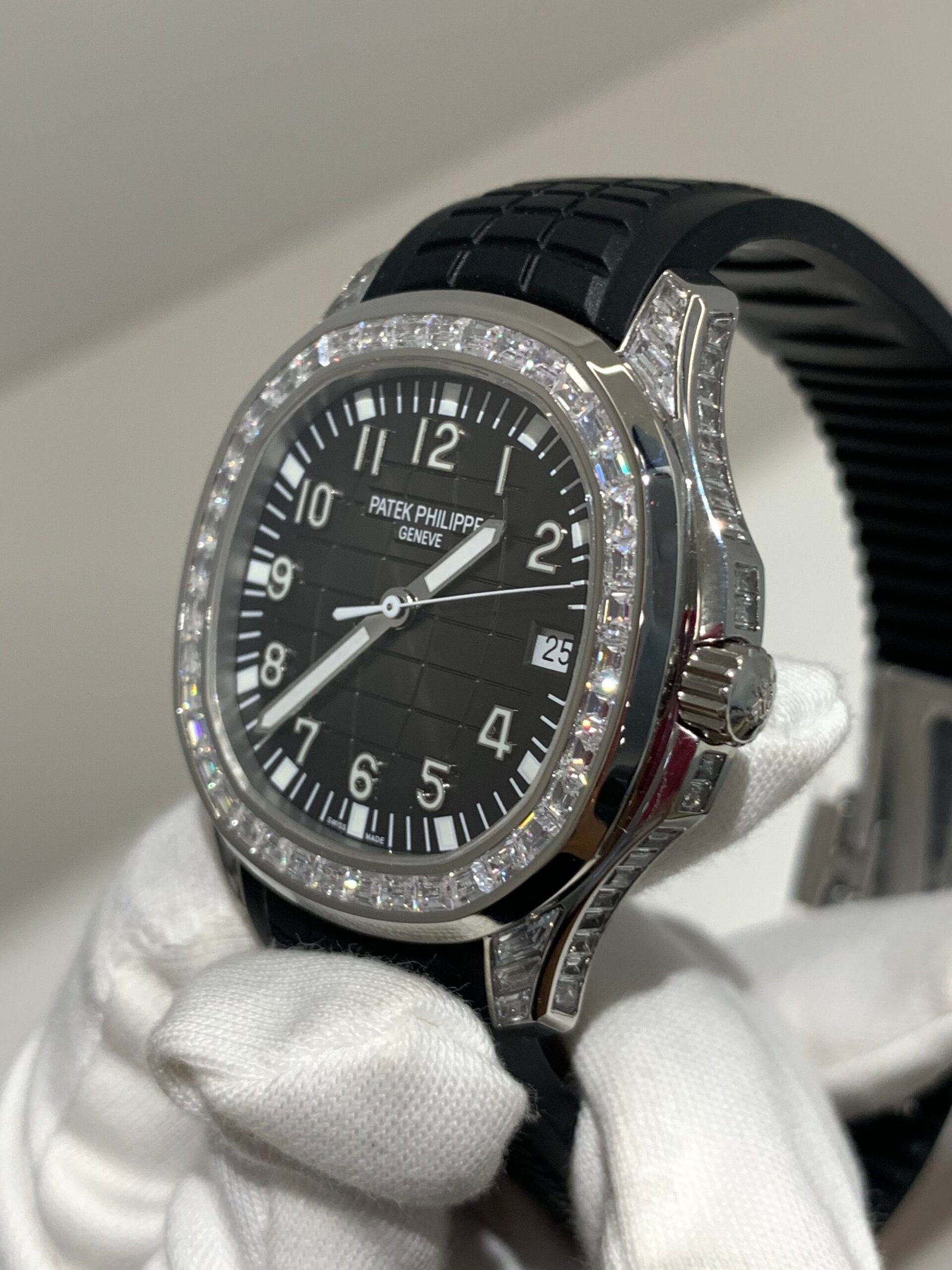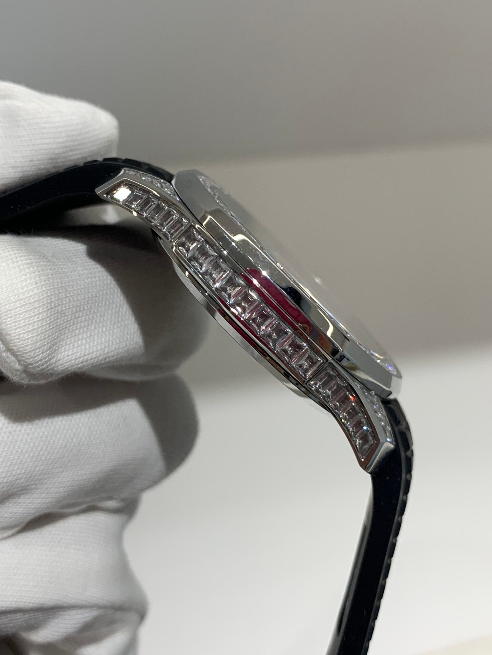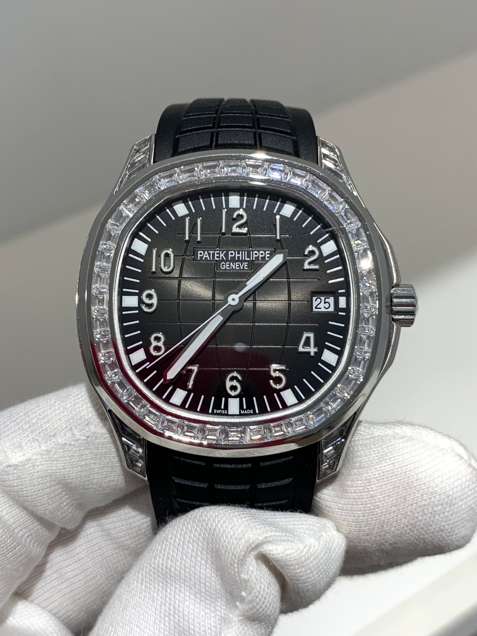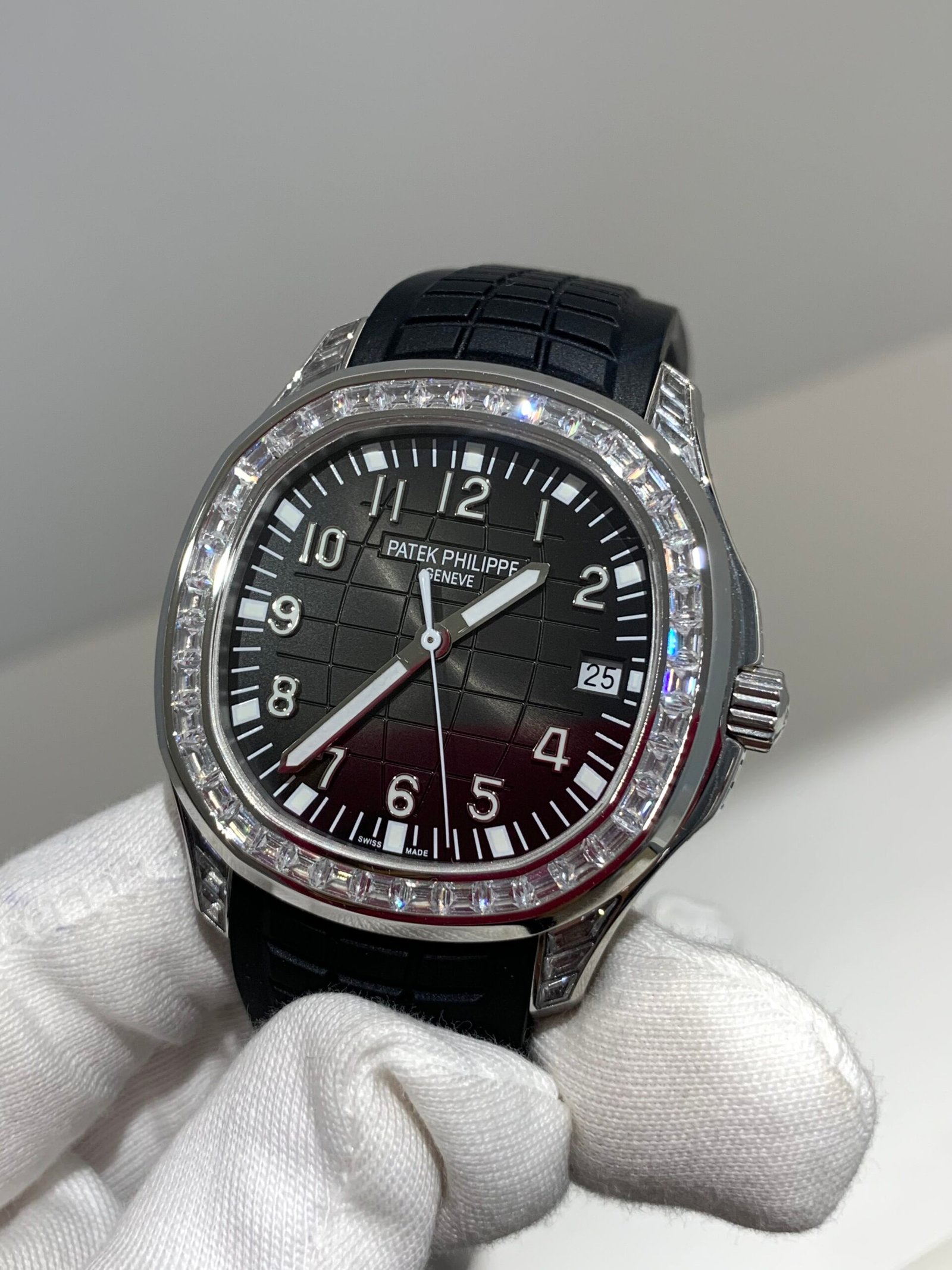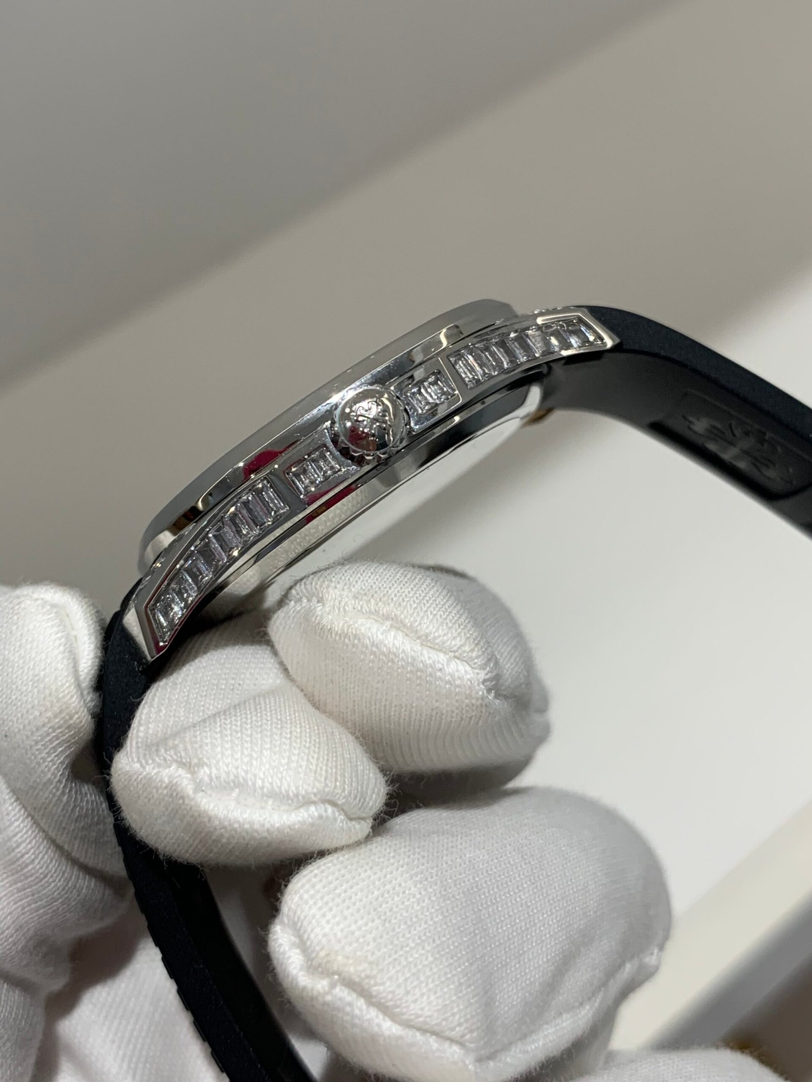 The iconic waffle-pattern bezel features uniform brushed surfaces, a signature design of the Aquanaut. The transition between the bezel and case is sharp and precise, with no gaps—mirroring the genuine’s hand-finished craftsmanship.