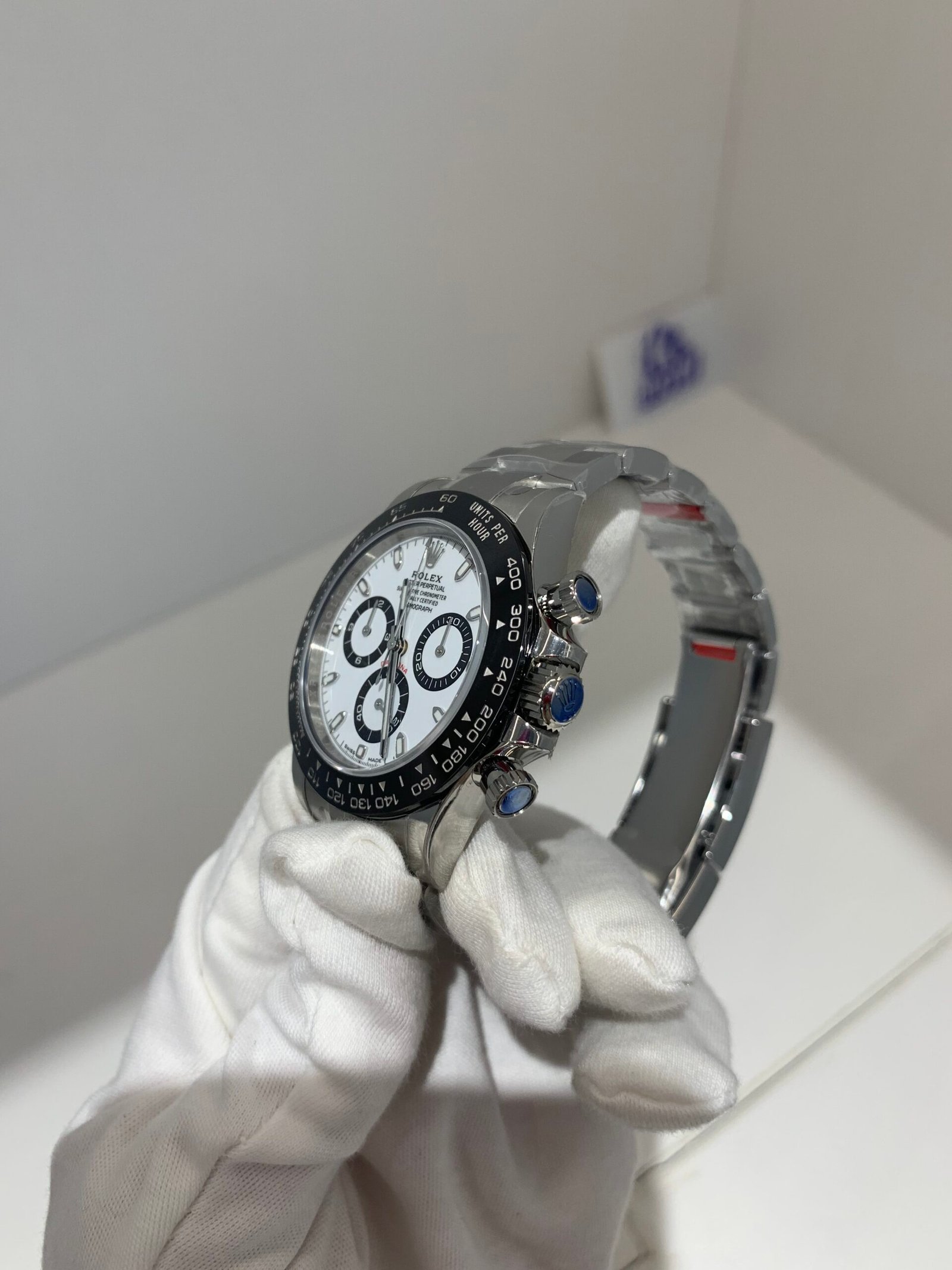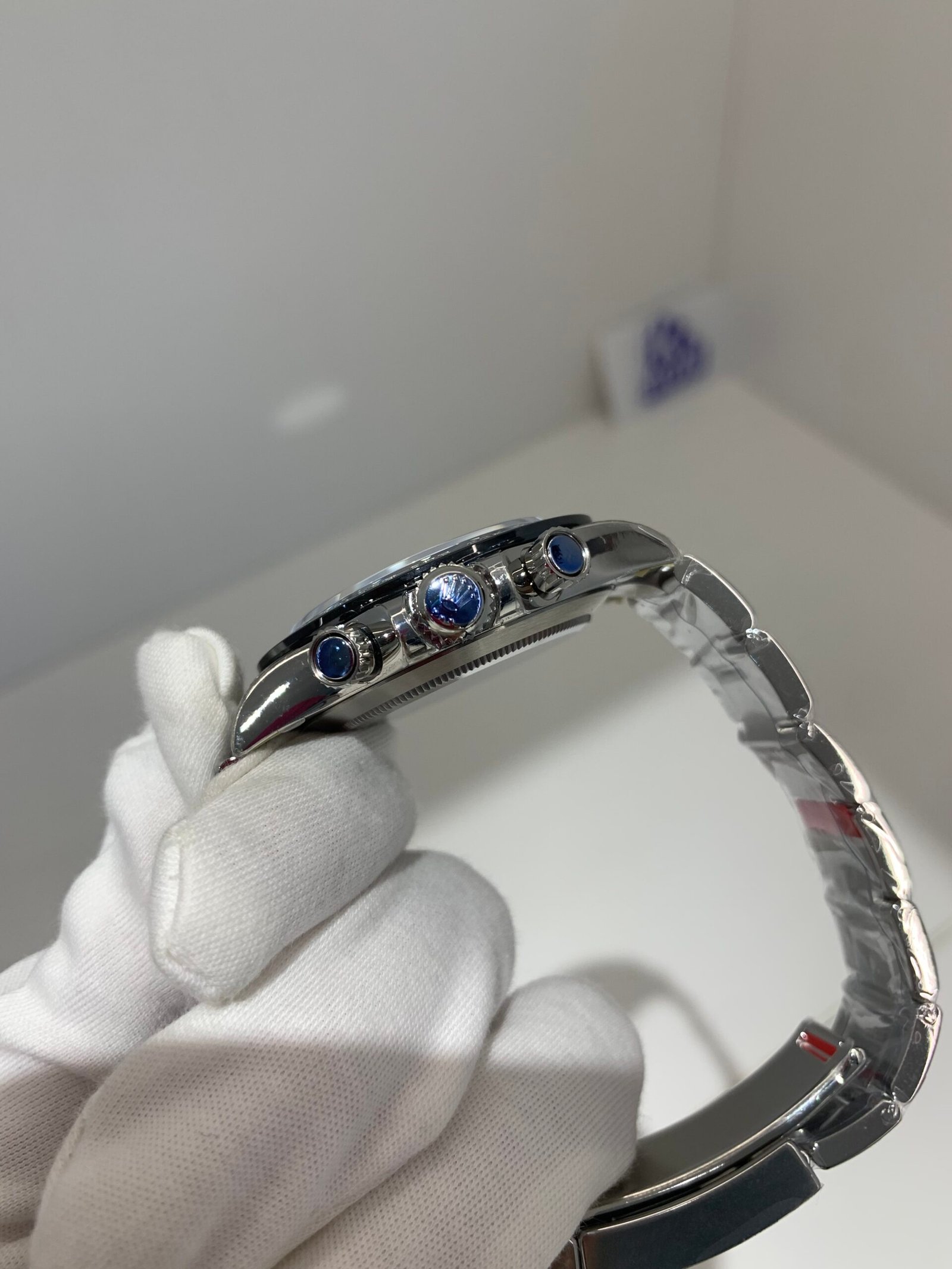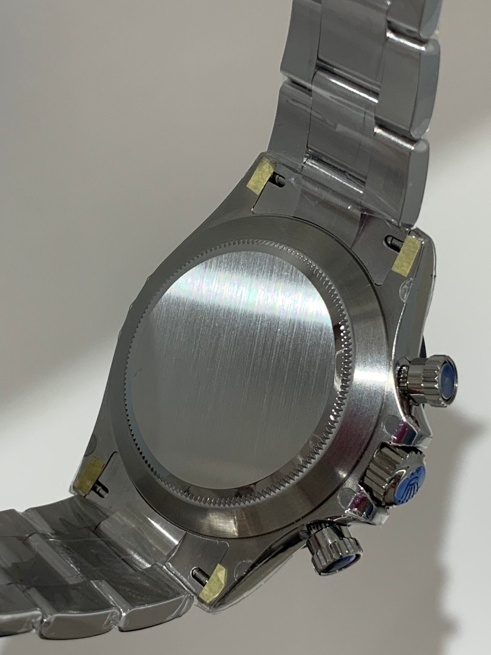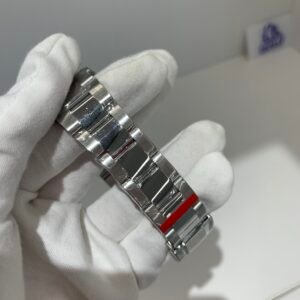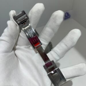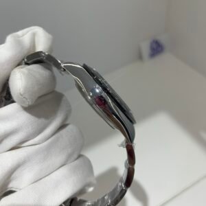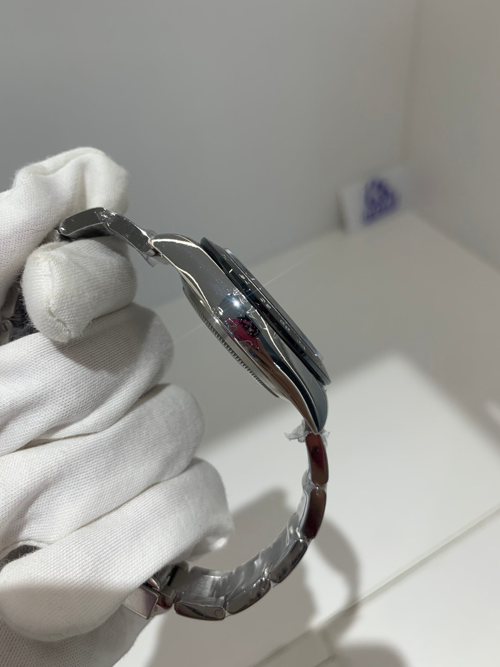 The sapphire crystal is perfectly flat with correct anti-reflective coating—no milky white edge, and sits flush with the bezel at the exact height as genuine. The crystal’s curvature and edge polish are indistinguishable from the original.