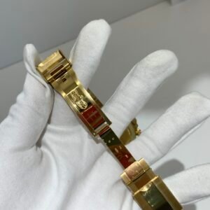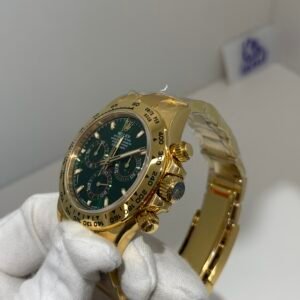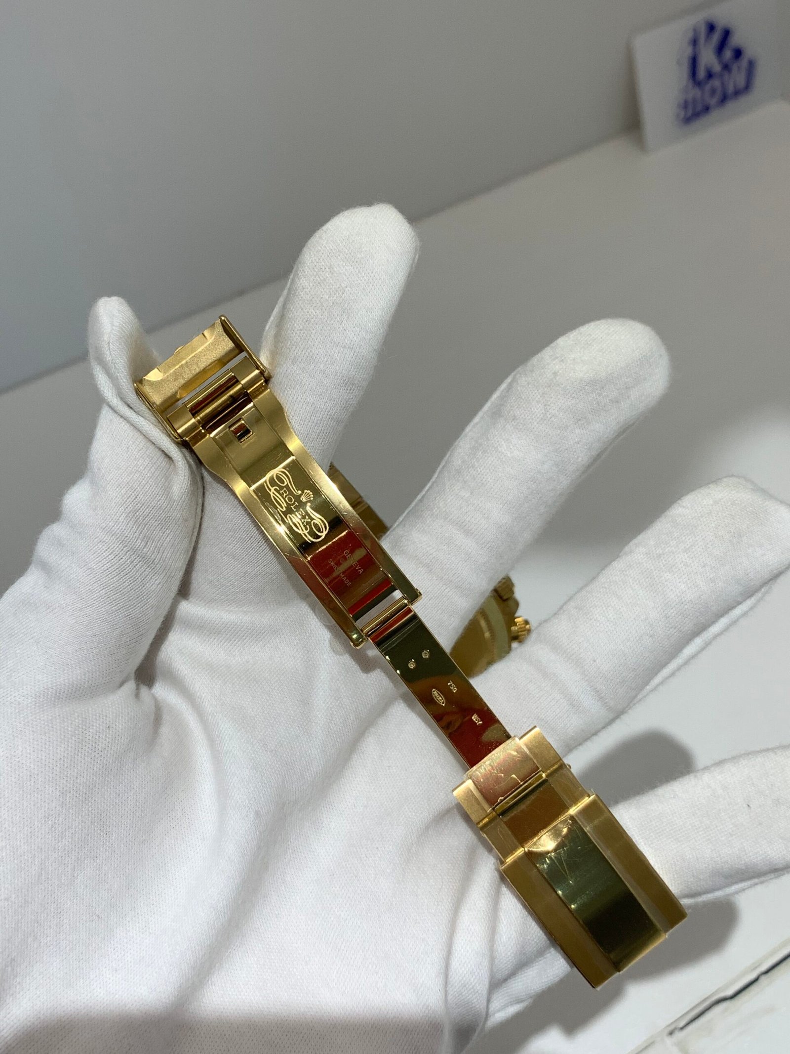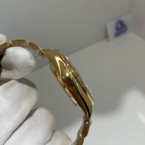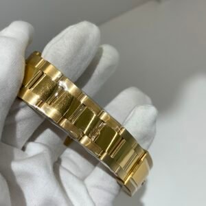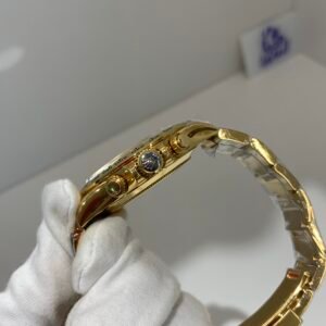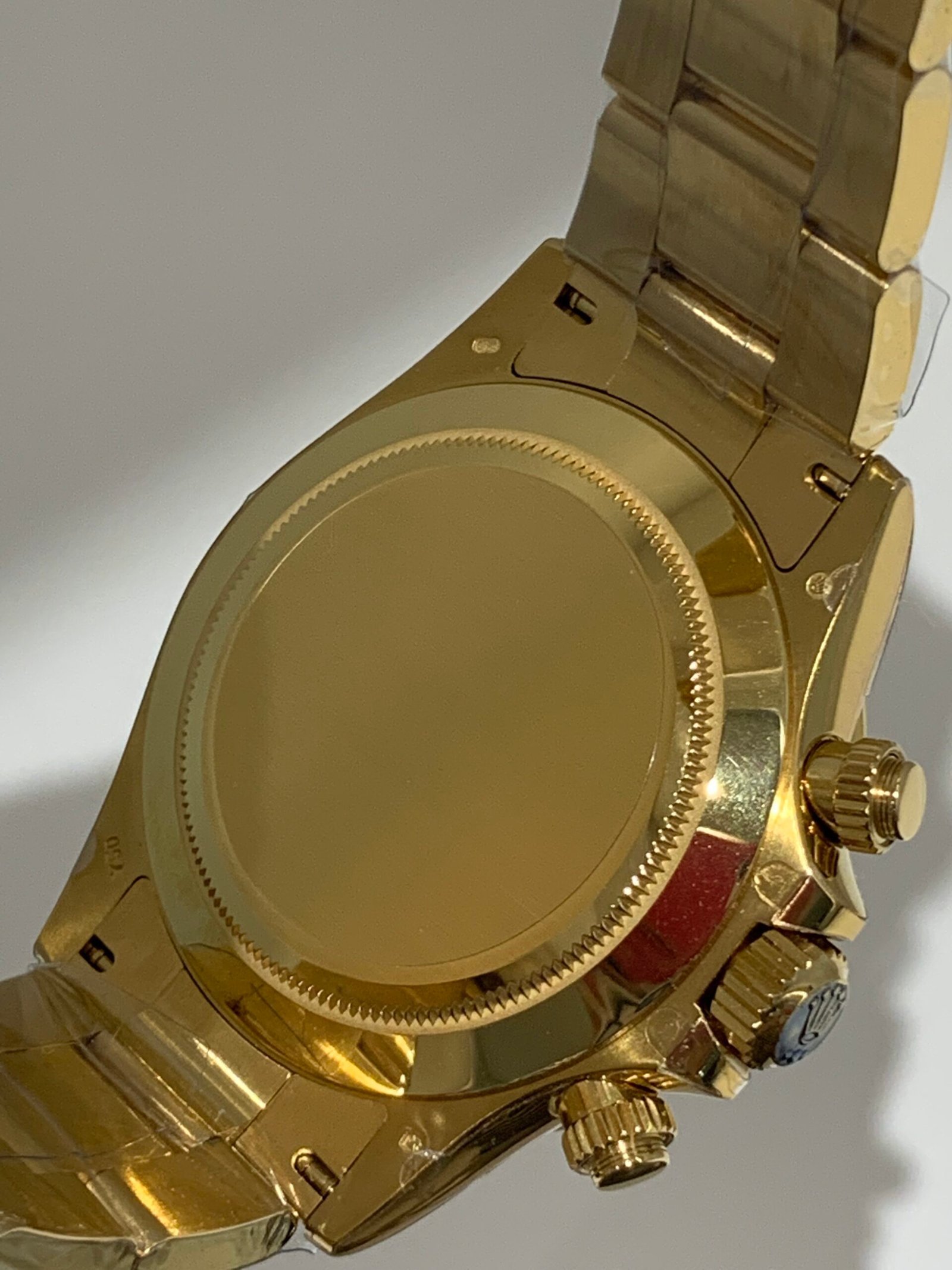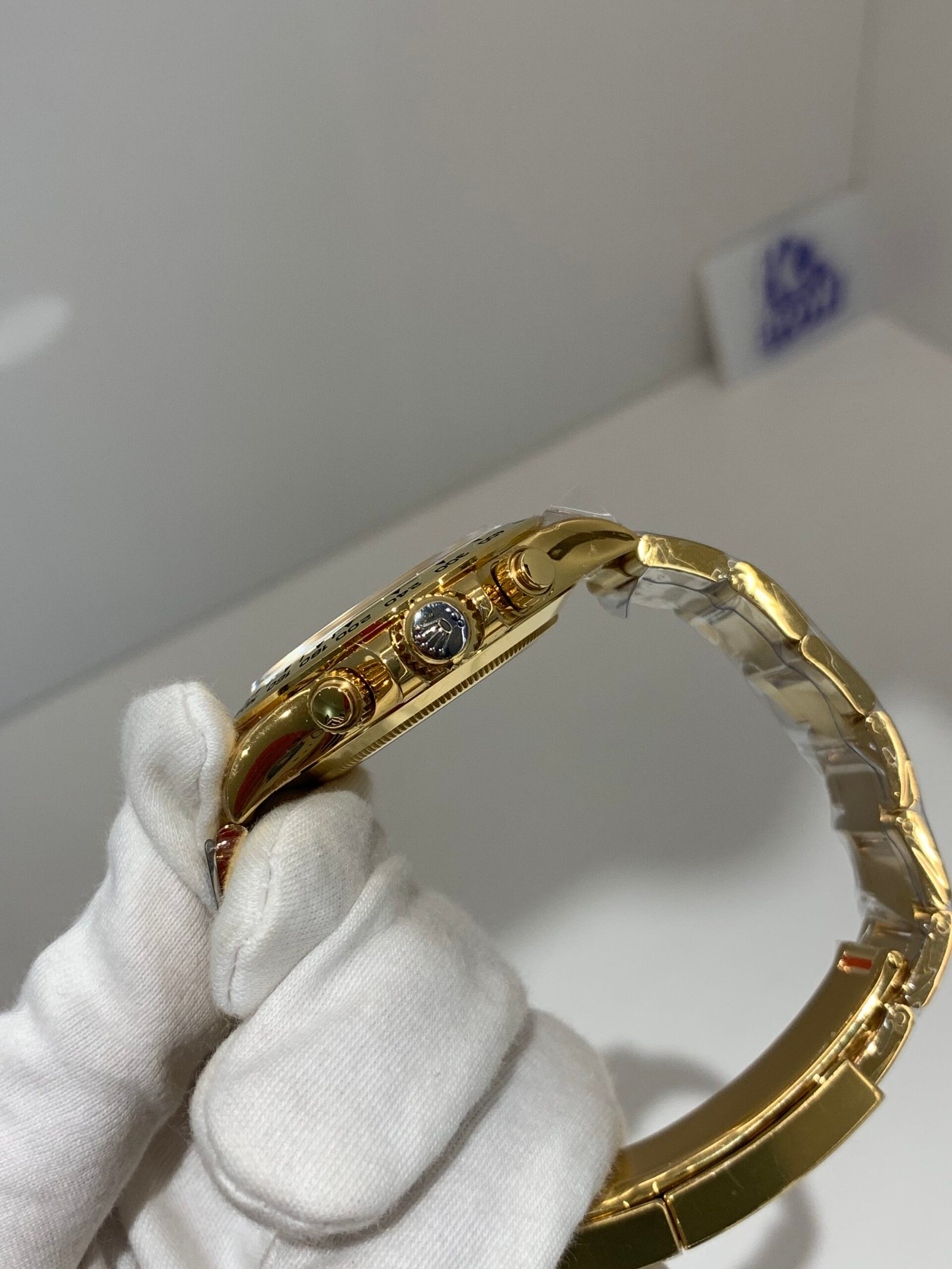 Polished 18K Yellow Gold BezelA signature design element of the M116508-0013, the bezel is crafted from 18K yellow gold plating and polished to a mirror shine, with precise engraved white tachymeter scale—used to measure speed over a known distance, a core function of Daytona racing chronographs. Each engraving is precisely cut to match the genuine’s proportions, maintaining the correct curvature relative to the 40mm mid-case, framing the elegant champagne dial and diamond markers perfectly. The 18K yellow gold bezel enhances the watch’s luxury texture, perfectly matching the case and bracelet, and complementing the black sub-dials and diamond markers for a more noble and exquisite look, just like the genuine model—interpreting the classic charm of yellow gold in watchmaking craftsmanship.