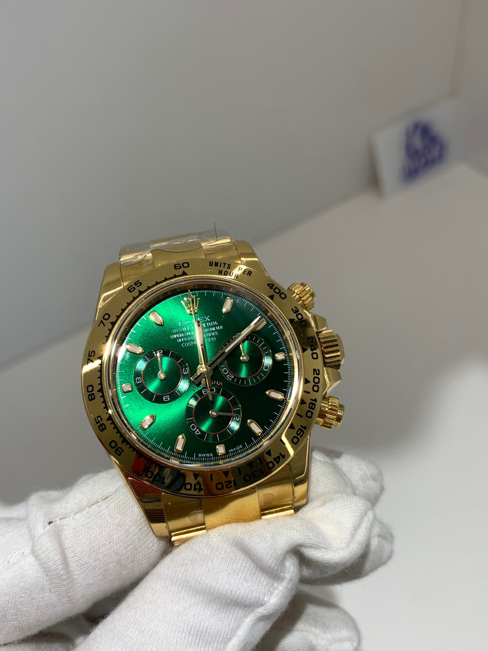 MODEL REFERENCE M116508-0013 FACTORY / VERSION VSF (VS Factory) Latest Batch MOVEMENT VS4130 Super Clone (72h Reserve) CASE MATERIAL 18K Yellow Gold-Plated (Full Gold Appearance) CRYSTAL Sapphire w/ Clear AR Coating BEZEL: Polished 18K Yellow Gold (White Tachymeter Scale) BRACELET: Oyster (Three-Link, 18K Yellow Gold-Plated) DIAL: Champagne Dial with Diamond Hour Markers & Black Sub-Dials DIMENSIONS 40mm x 12.4mm WATER RESISTANCE: 100m (Simulated) FUNCTION: 3-Function Chronograph (30min/12hr/Small Second) (May be slight errors in the measurements. If you have any concerns, please contact service for confirmation)