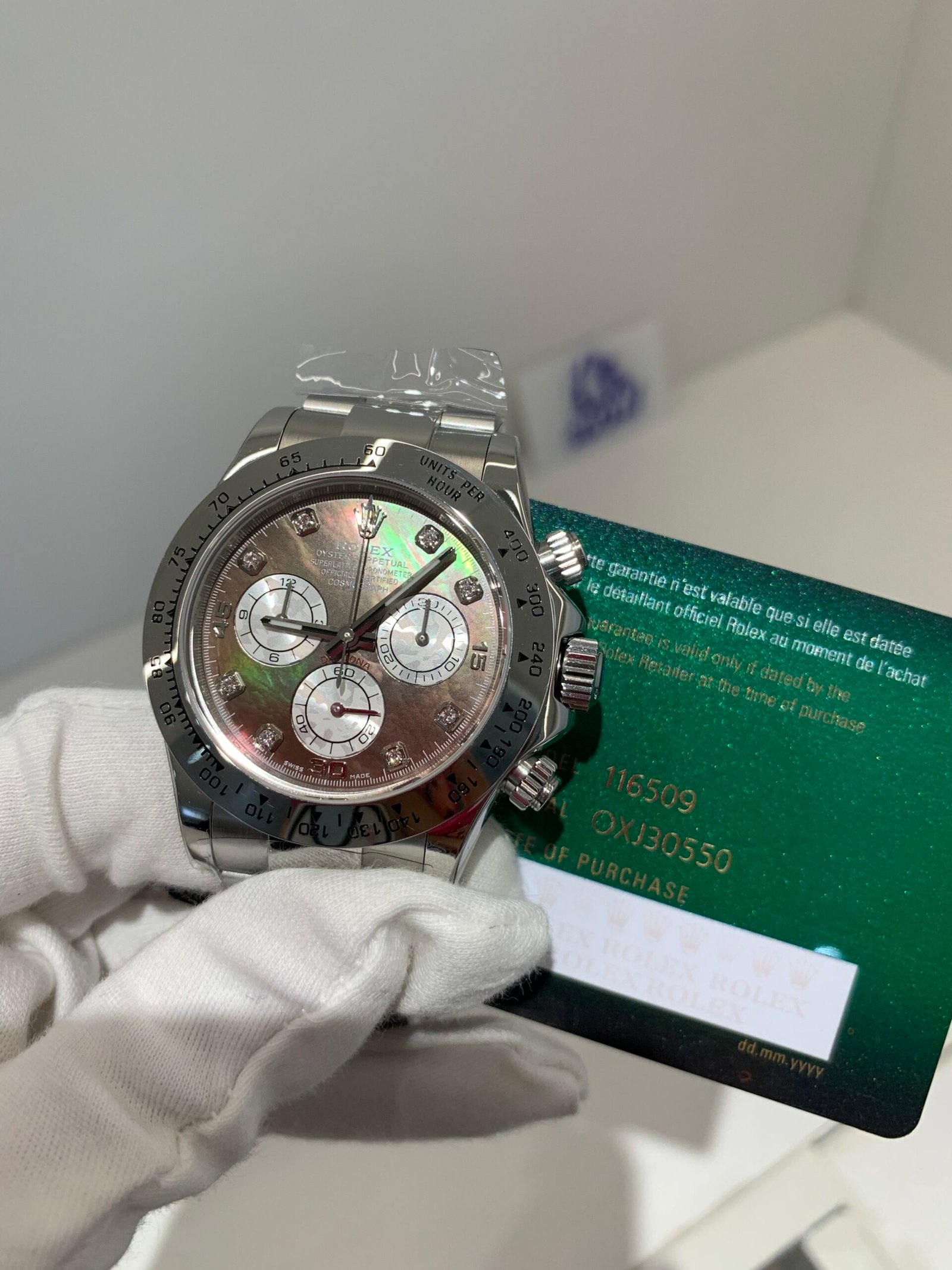 A legendary luxurious sporty chronograph masterpiece powered by the true-to-gen VS4130 movement, delivering flawless chronograph functionality and featuring the unique meteorite dial with black sub-dials, paired with a polished 18K white gold case/bezel and Oyster bracelet that embodies Rolex Daytona’s racing heritage and precious metal luxury.