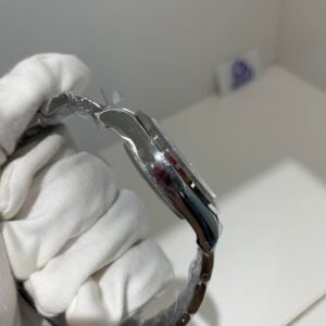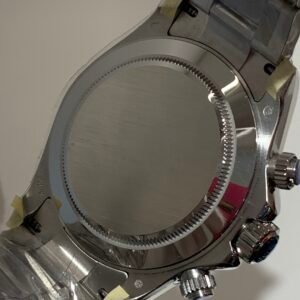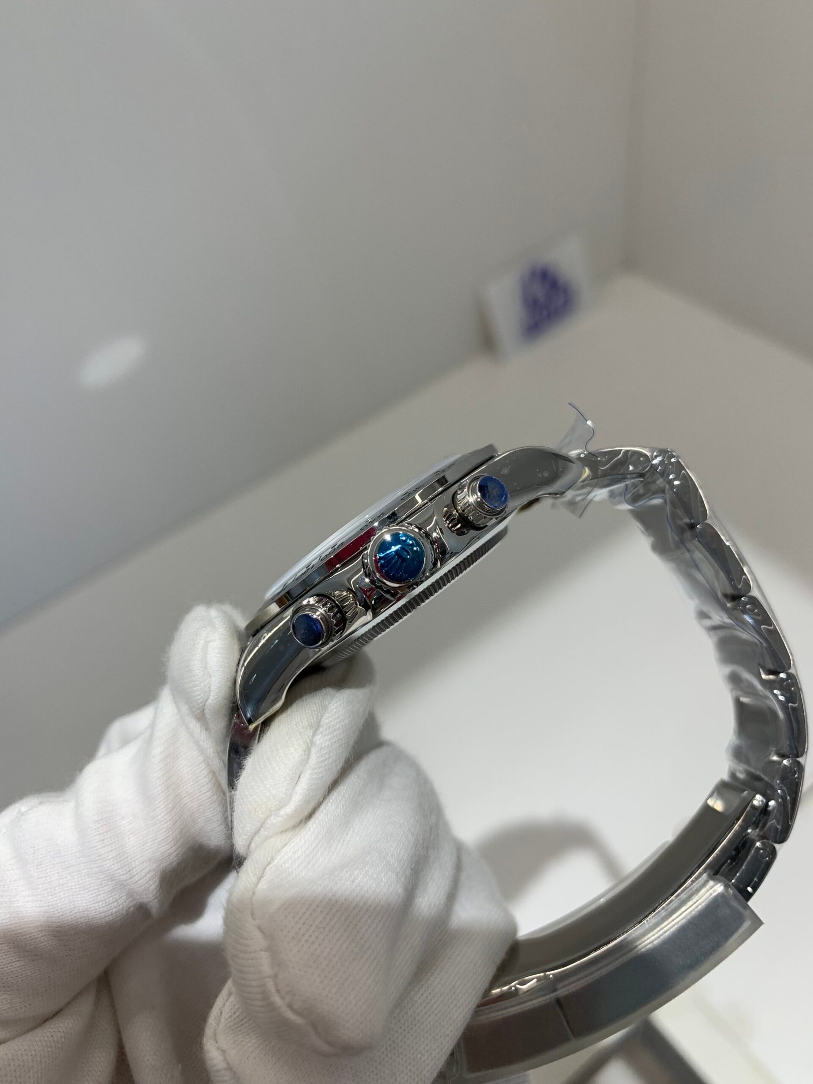 Polished 18K White Gold BezelA signature design element of the M116509-0044, the bezel is crafted from 18K white gold plating and polished to a mirror shine, with precise engraved white tachymeter scale—used to measure speed over a known distance, a core function of Daytona racing chronographs. Each engraving is precisely cut to match the genuine’s proportions, maintaining the correct curvature relative to the 40mm mid-case, framing the unique meteorite dial perfectly. The 18K white gold bezel enhances the watch’s luxury texture, perfectly matching the case and bracelet, and complementing the black sub-dials for a more refined and noble look, just like the genuine model—interpreting the classic charm of white gold in high-end watchmaking craftsmanship.