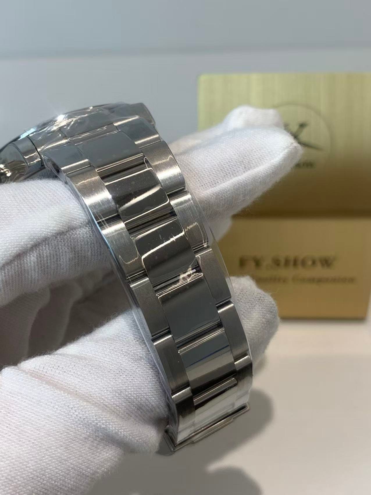 Polished 18k White Gold with Engraved Tachymeter Scale. A smooth domed bezel with deeply engraved, black-filled 测速计 markings that won’t fade. Perfectly aligned with the case, it adds to the watch’s streamlined profile without overshadowing the dial.
