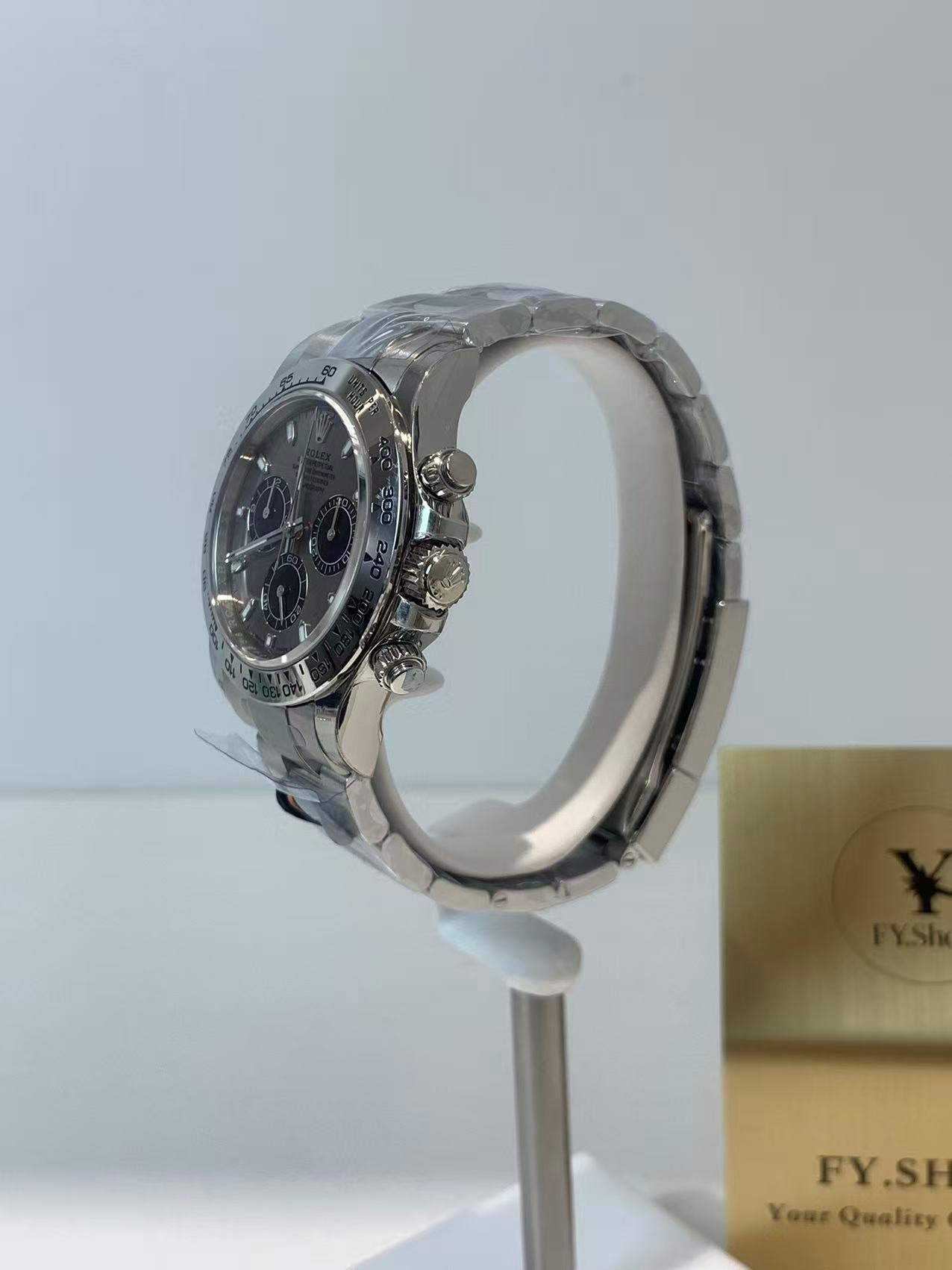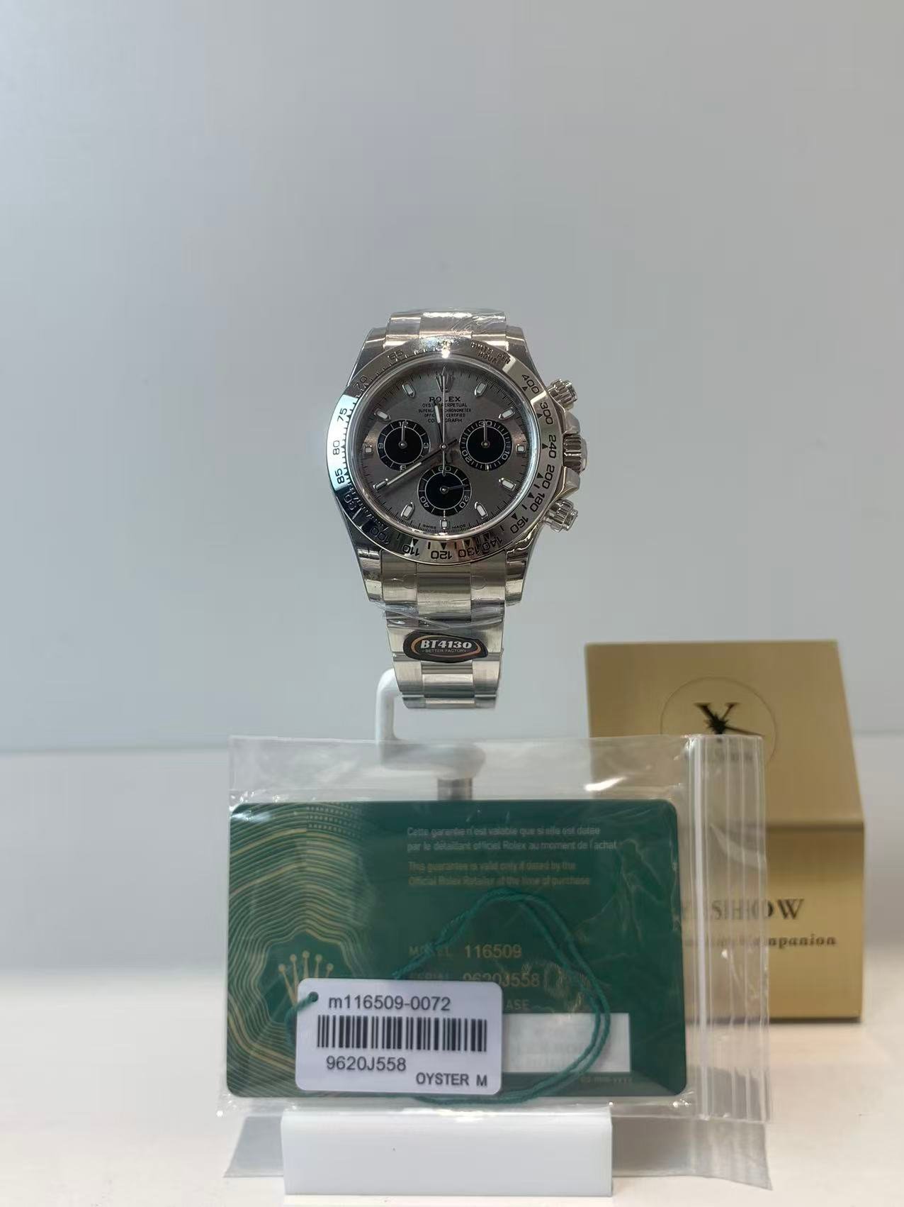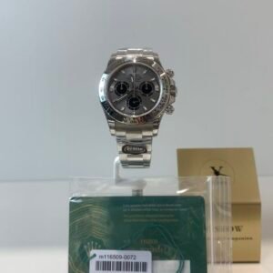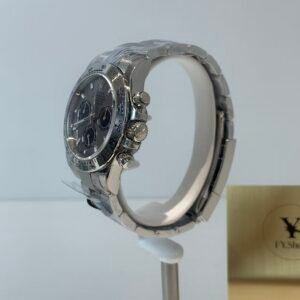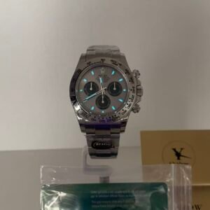 A luxurious sport-chic masterpiece powered by Rolex’s legendary Cal.4130 in-house chronograph movement, defined by its iconic silver-gray (cement gray) dial and full 18k white gold construction— a modern classic that balances racing heritage with understated opulence.