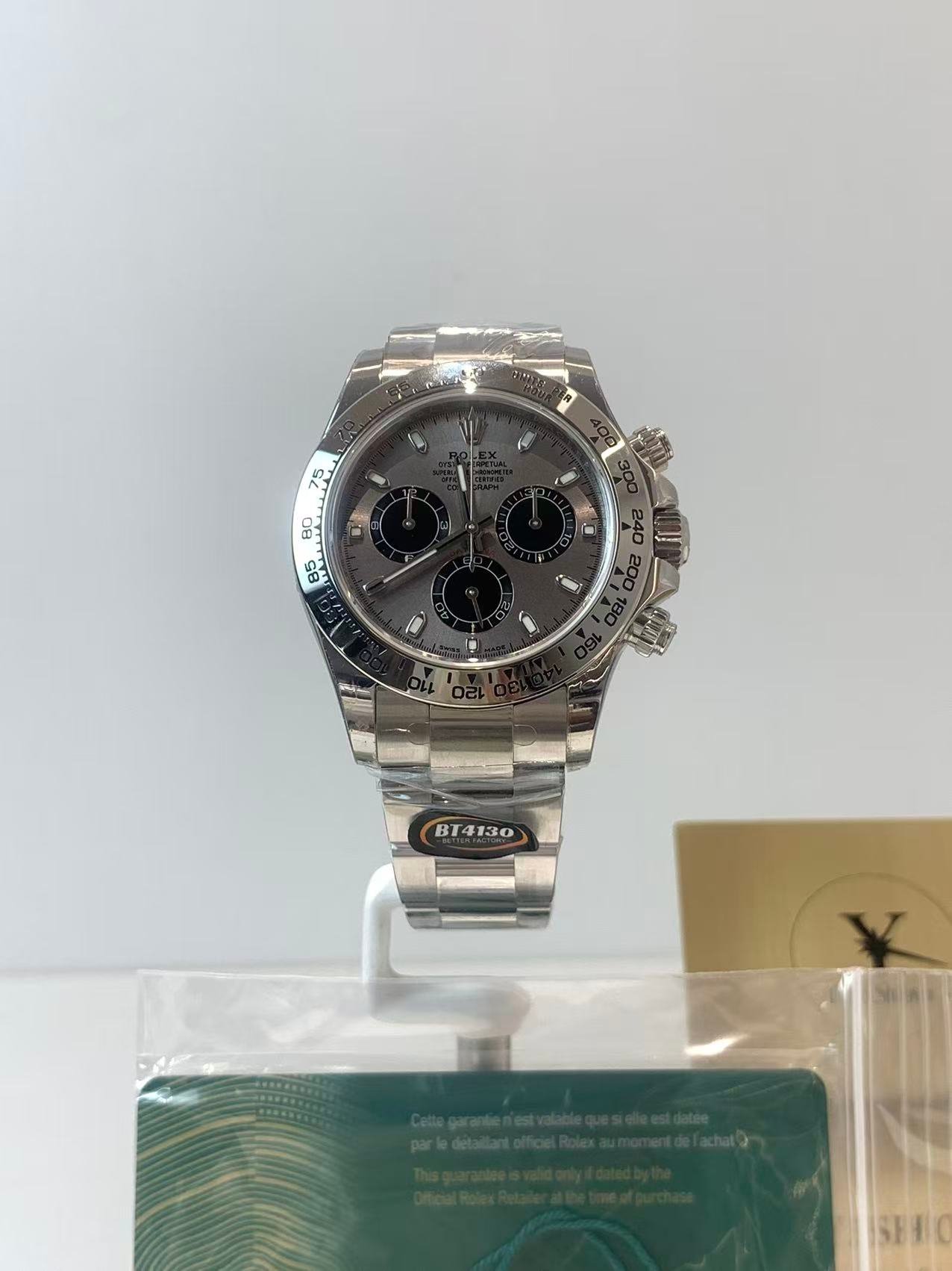 This is the Daytona that collectors crave beyond the standard 熊猫 (Panda) dials. Unlike steel alternatives, the 18k white gold case delivers a cooler, more refined sheen, while the cement gray dial with black sub-dials creates a sophisticated contrast that stands out in any collection. The Cal.4130 is Rolex’s benchmark chronograph movement—vertical clutch, column wheel, no “jump” on chrono start, and peerless long-term reliability.