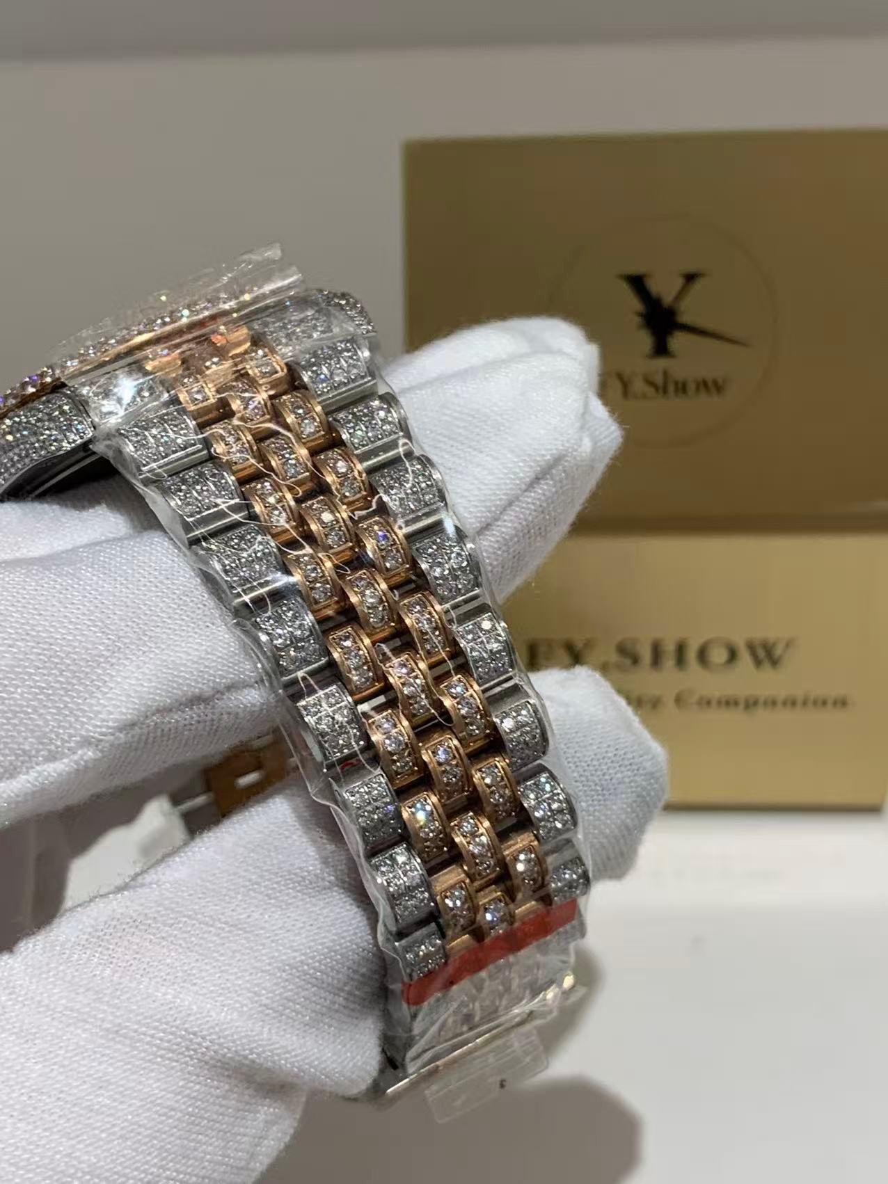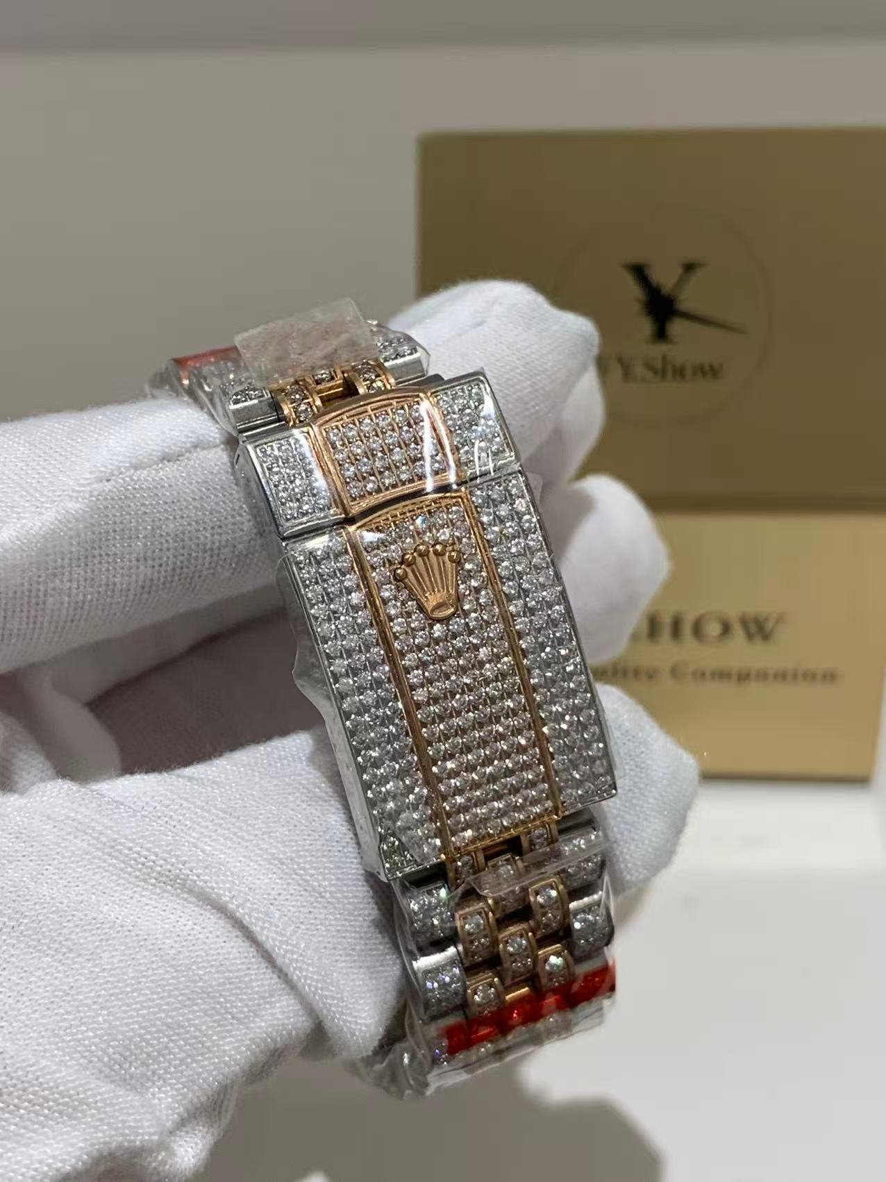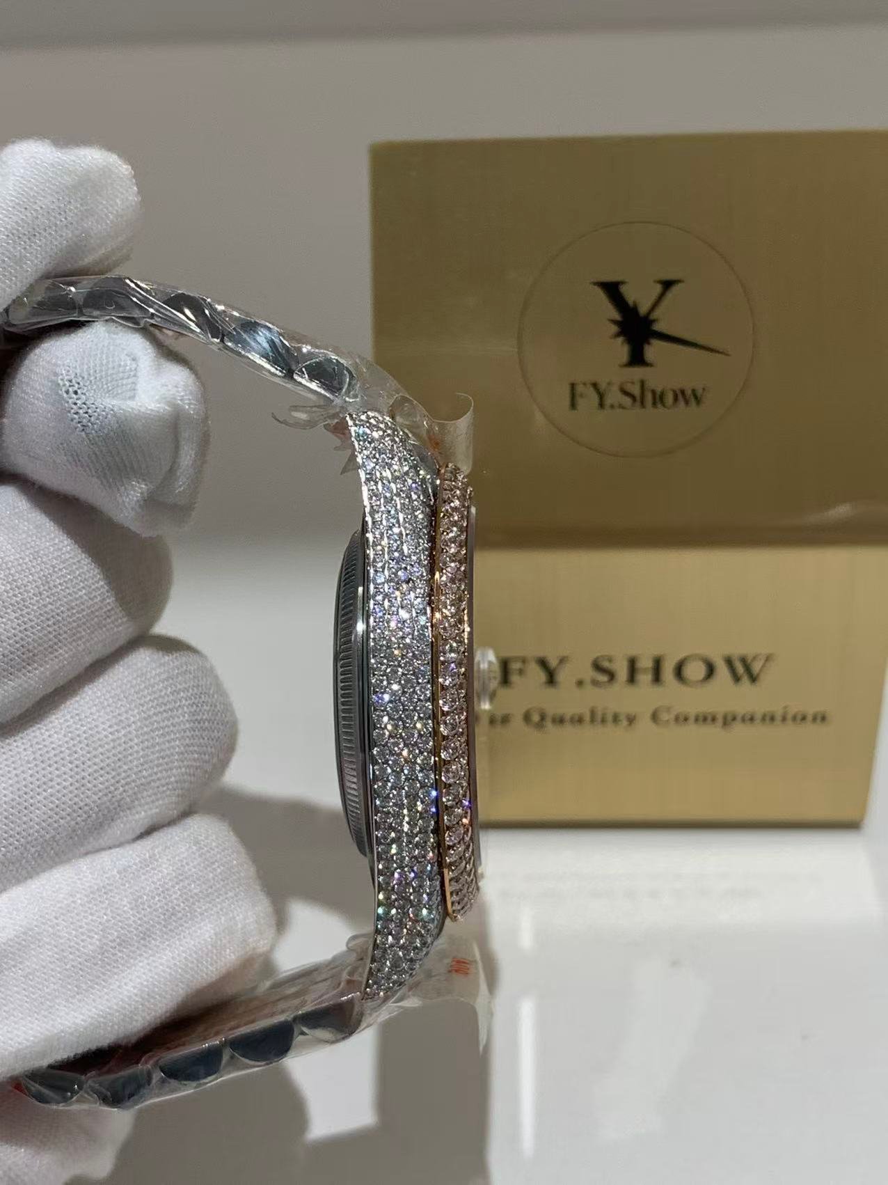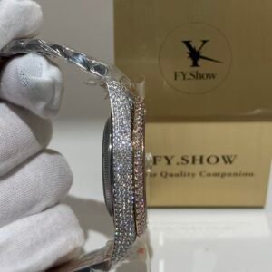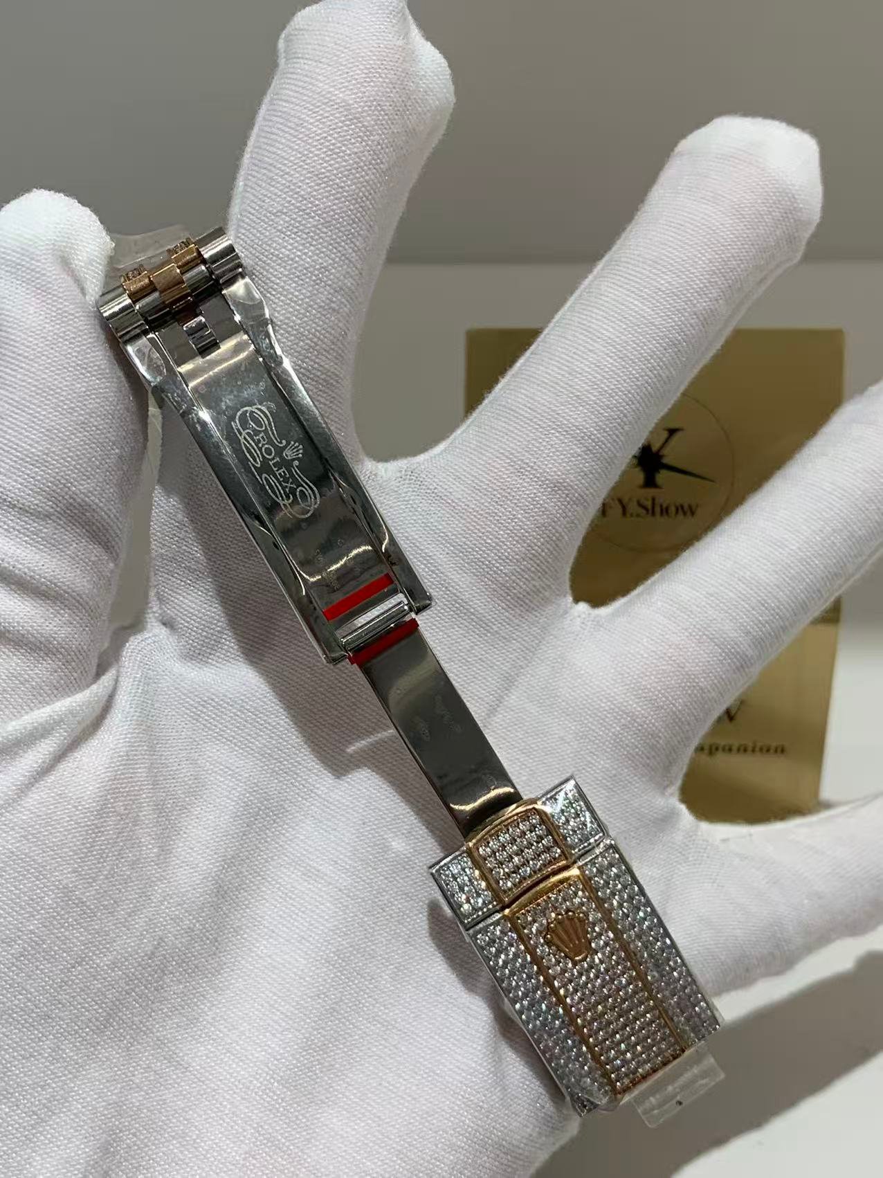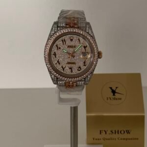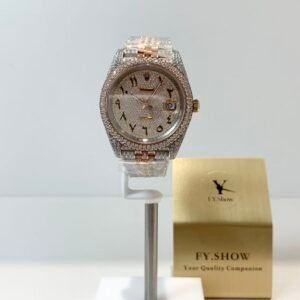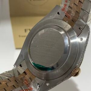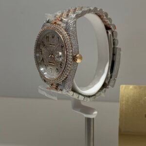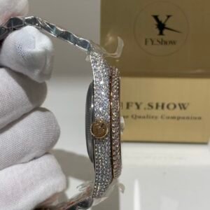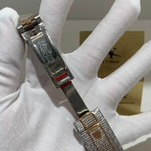 A classic fluted rose gold bezel, polished to a mirror-like shine that elevates the watch’s elegance. The fluting is meticulously crafted to match the genuine Rolex proportions, ensuring every groove and curve aligns perfectly— a testament to VSF’s attention to detail. It frames the diamond dial beautifully, balancing luxury with timeless design.