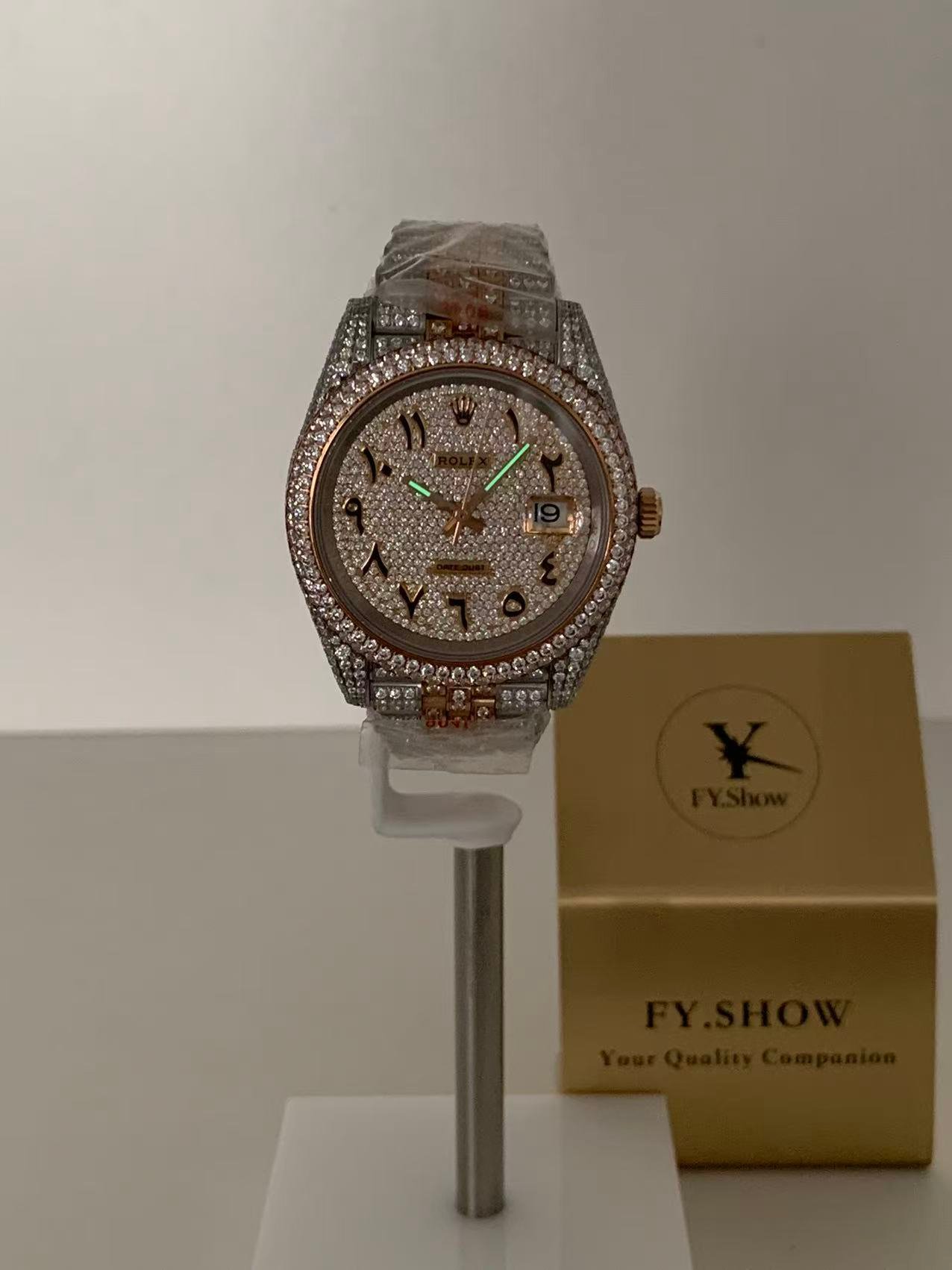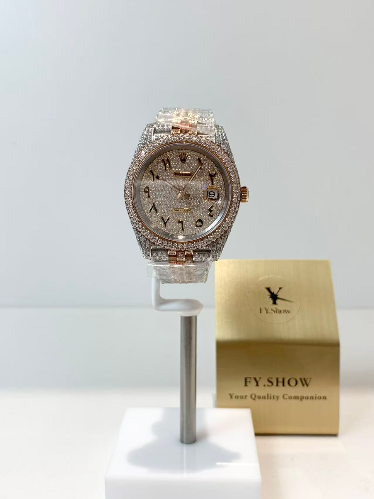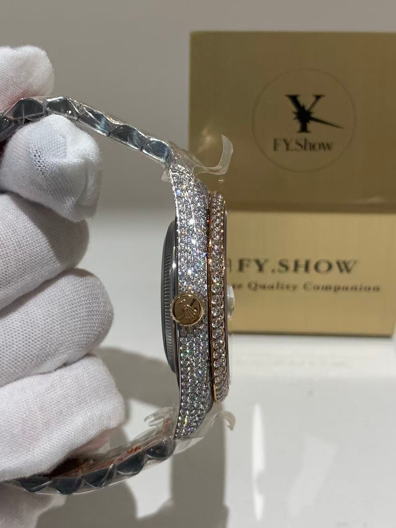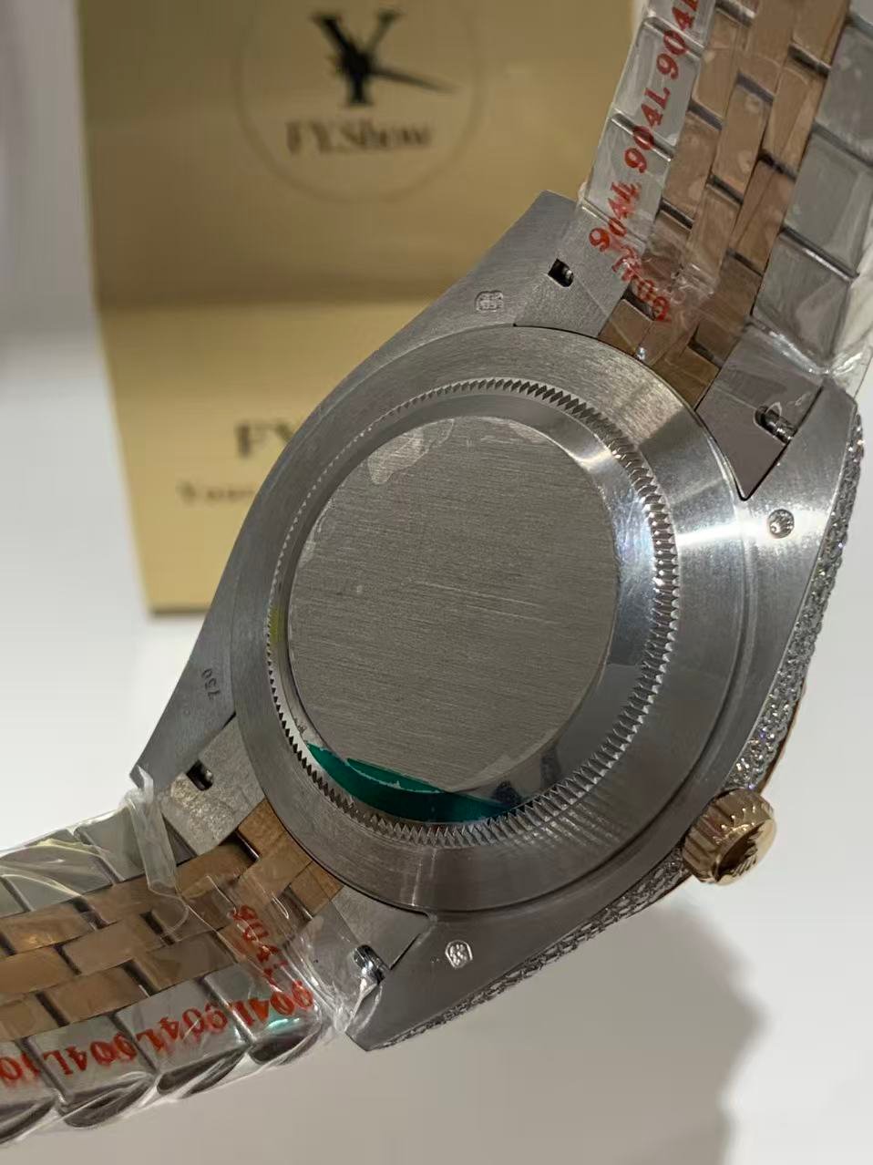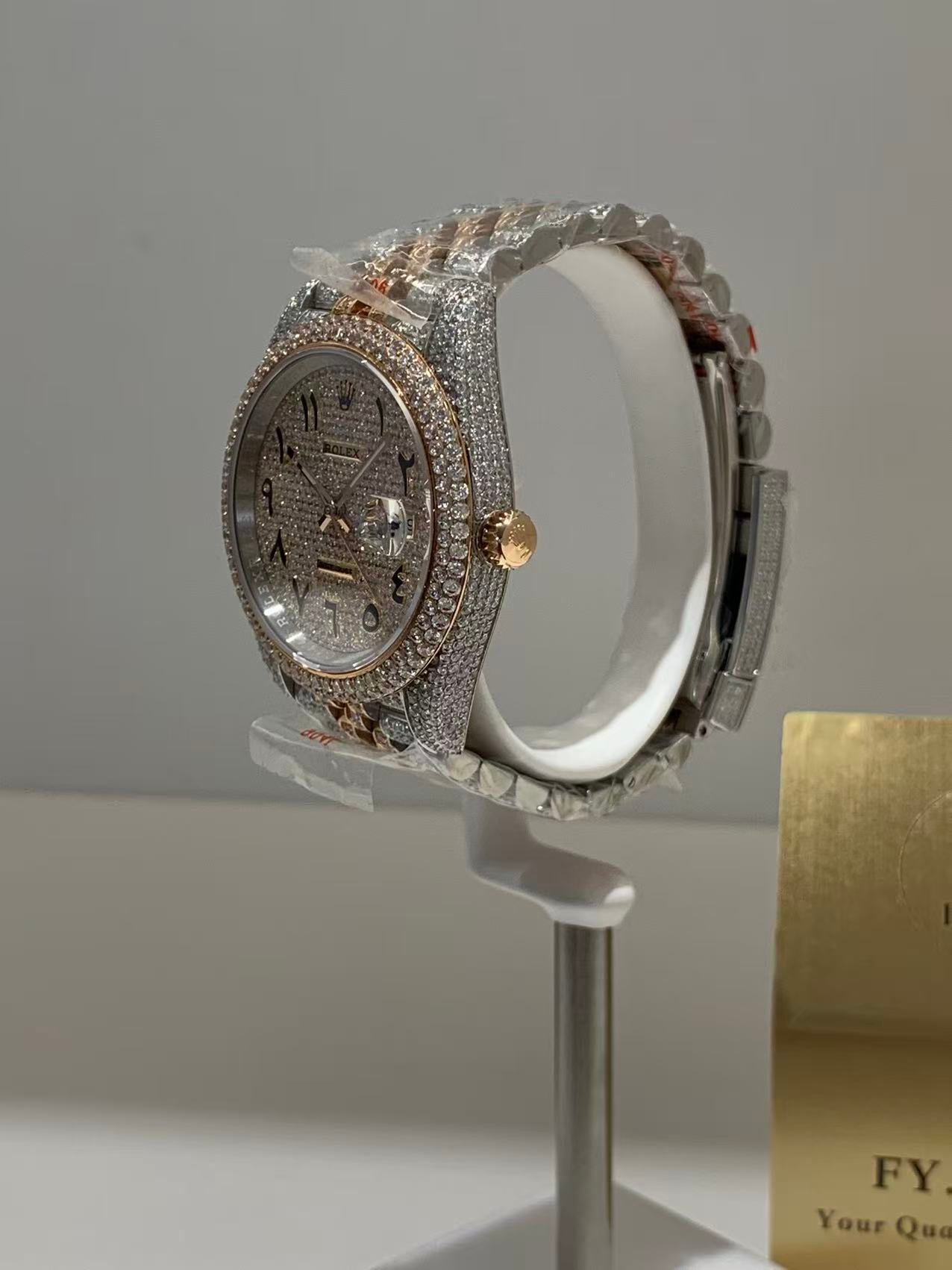 A classic fluted rose gold bezel, polished to a mirror-like shine that elevates the watch’s elegance. The fluting is meticulously crafted to match the genuine Rolex proportions, ensuring every groove and curve aligns perfectly— a testament to VSF’s attention to detail. It frames the diamond dial beautifully, balancing luxury with timeless design.