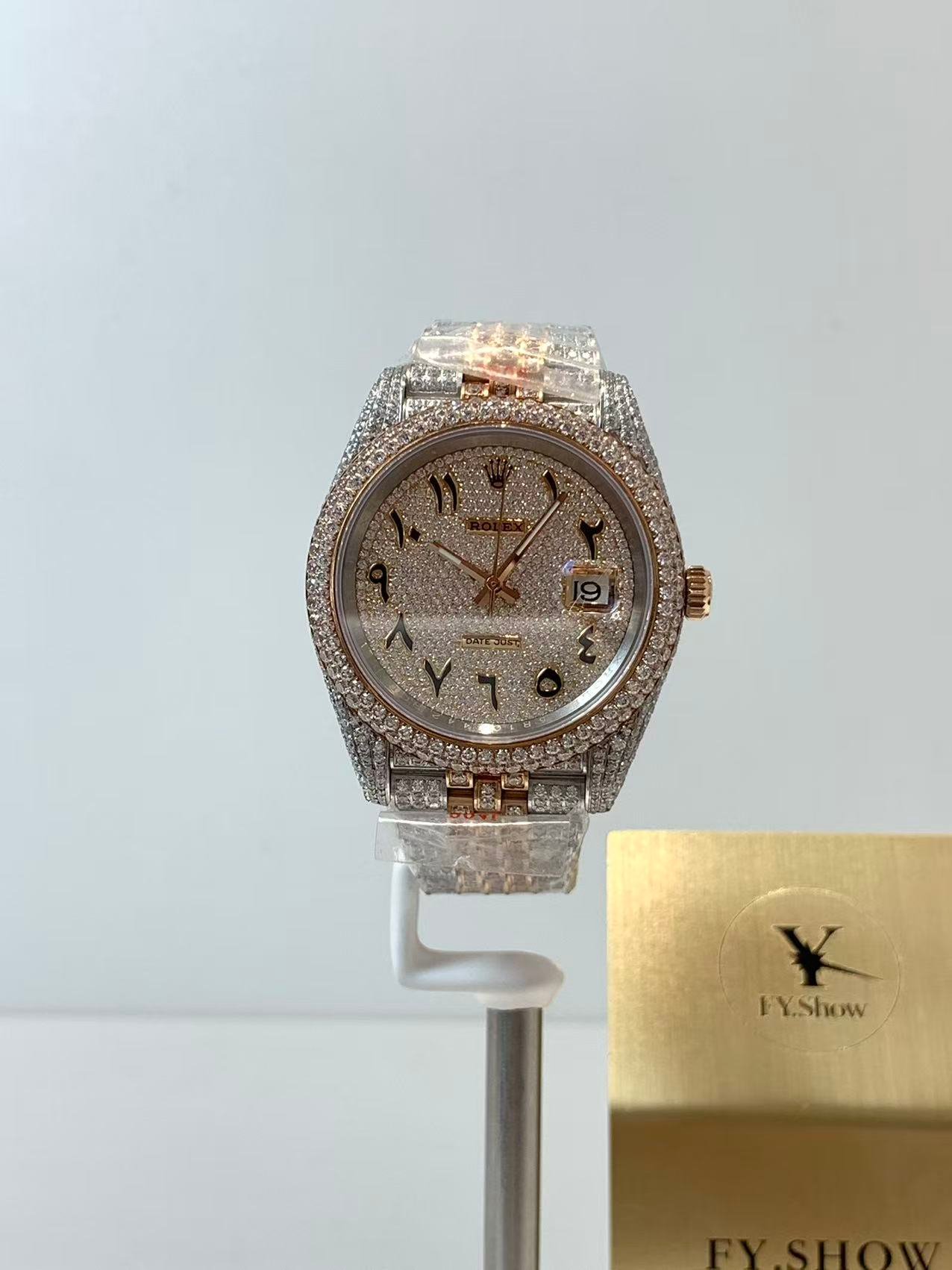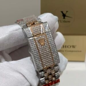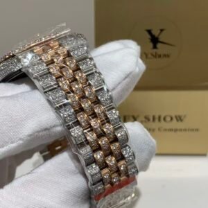 The star of the show is the lavish full diamond dial. Each stone is hand-set with precision, creating a seamless, glittering surface that catches the light from every angle. The soft pinkish hue of the rose gold hardware complements the diamond sparkle perfectly, adding a romantic, sophisticated vibe that stands out without being ostentatious. The iconic date window, framed by a Cyclops lens, remains crystal clear for easy reading.
