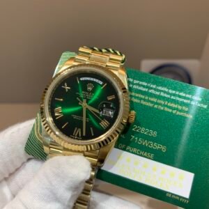 The showstopping dial transitions seamlessly from bright green at the center to a deep, rich forest green at the edges, creating a captivating “smoky” effect that changes with light. Applied yellow gold Roman hour markers and hands are filled with long-lasting Chromalight lume, ensuring exceptional readability in all conditions. The day and date windows are perfectly positioned with crisp white text on black backgrounds for maximum contrast.