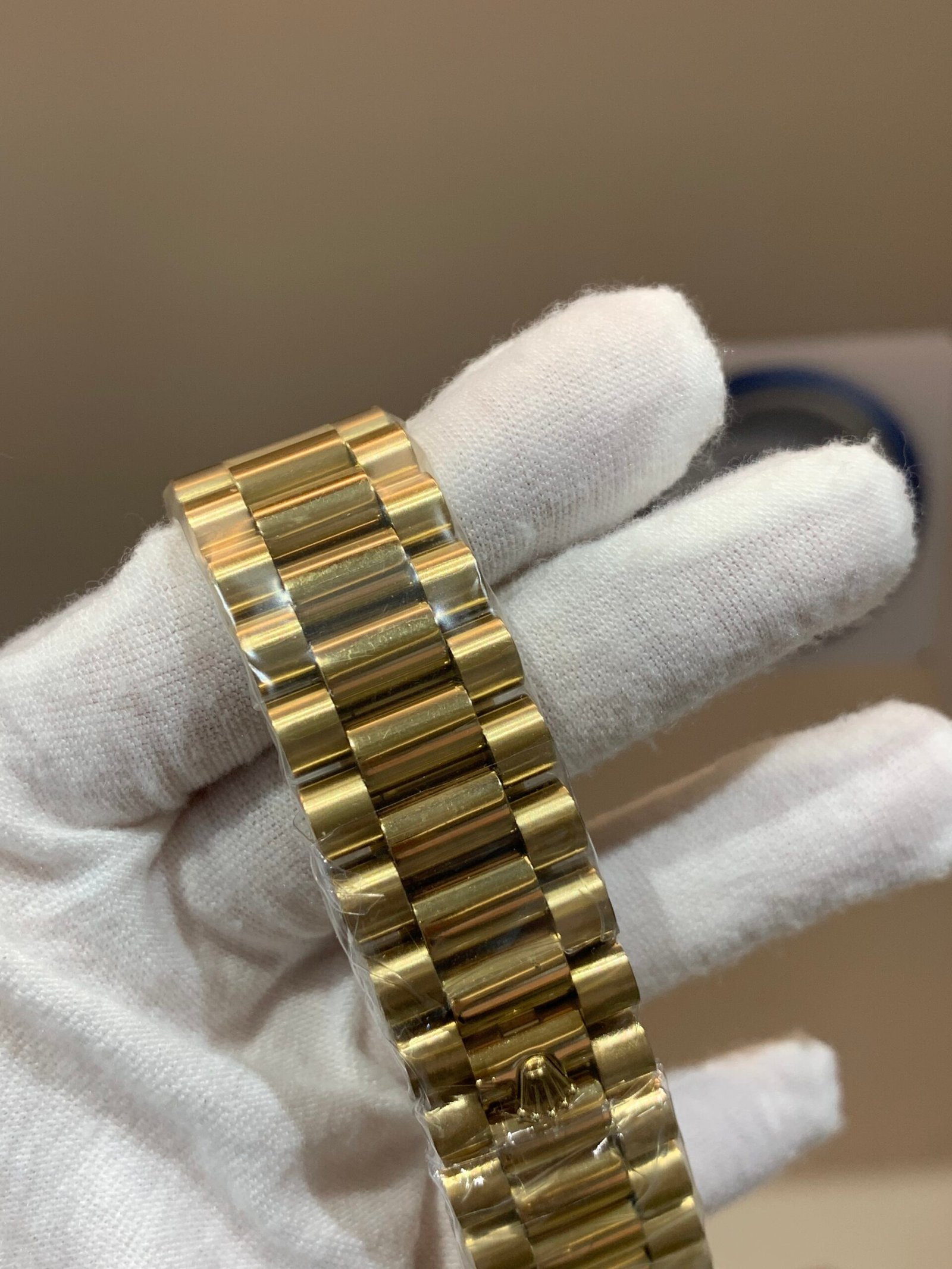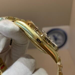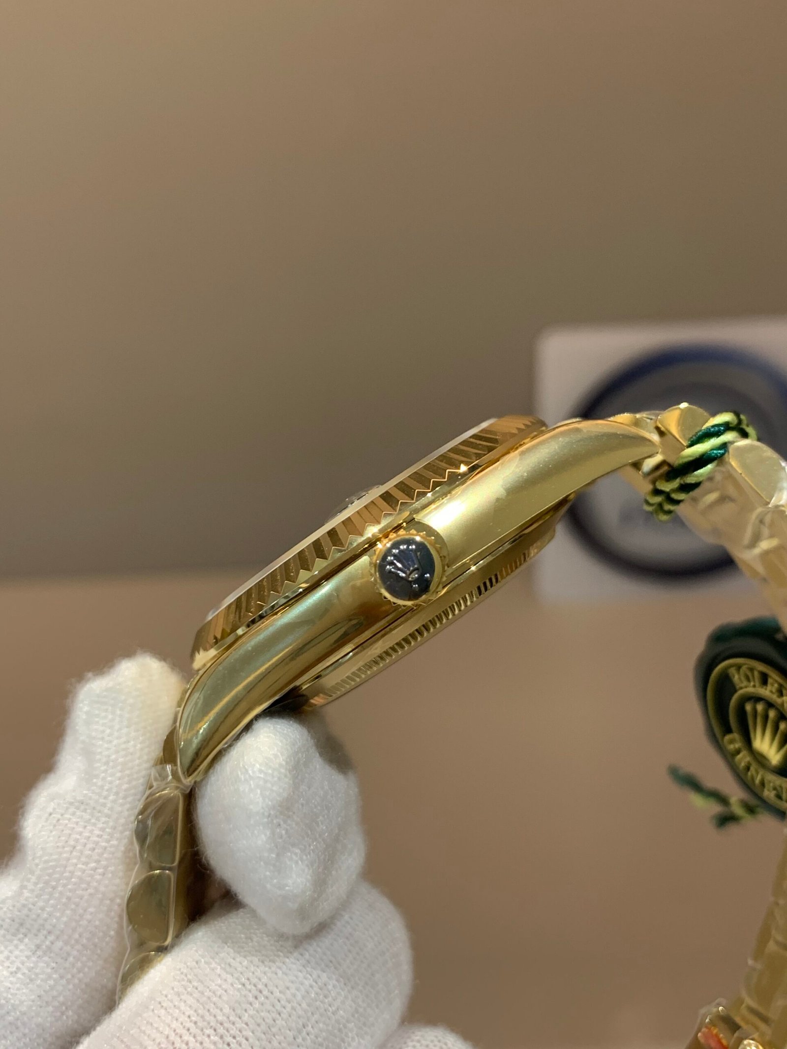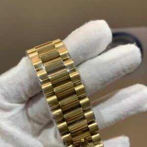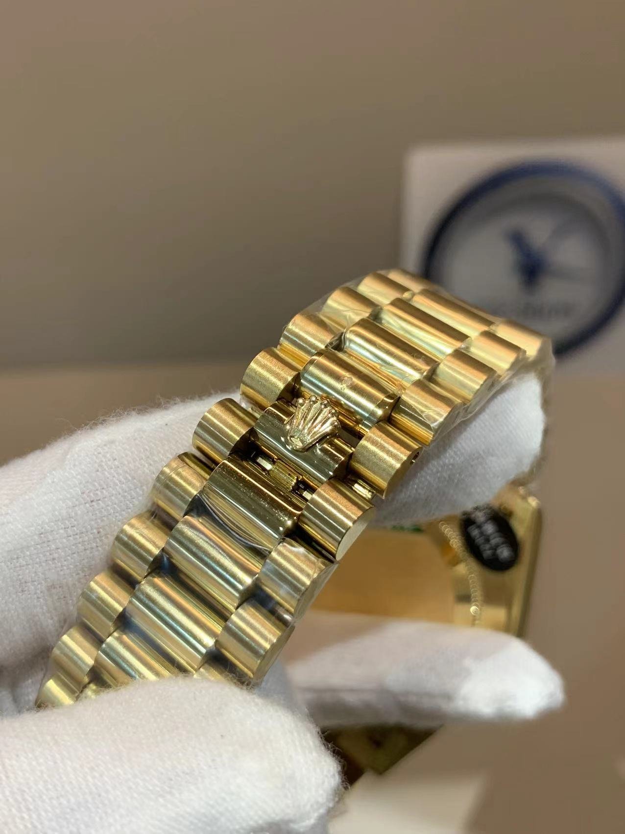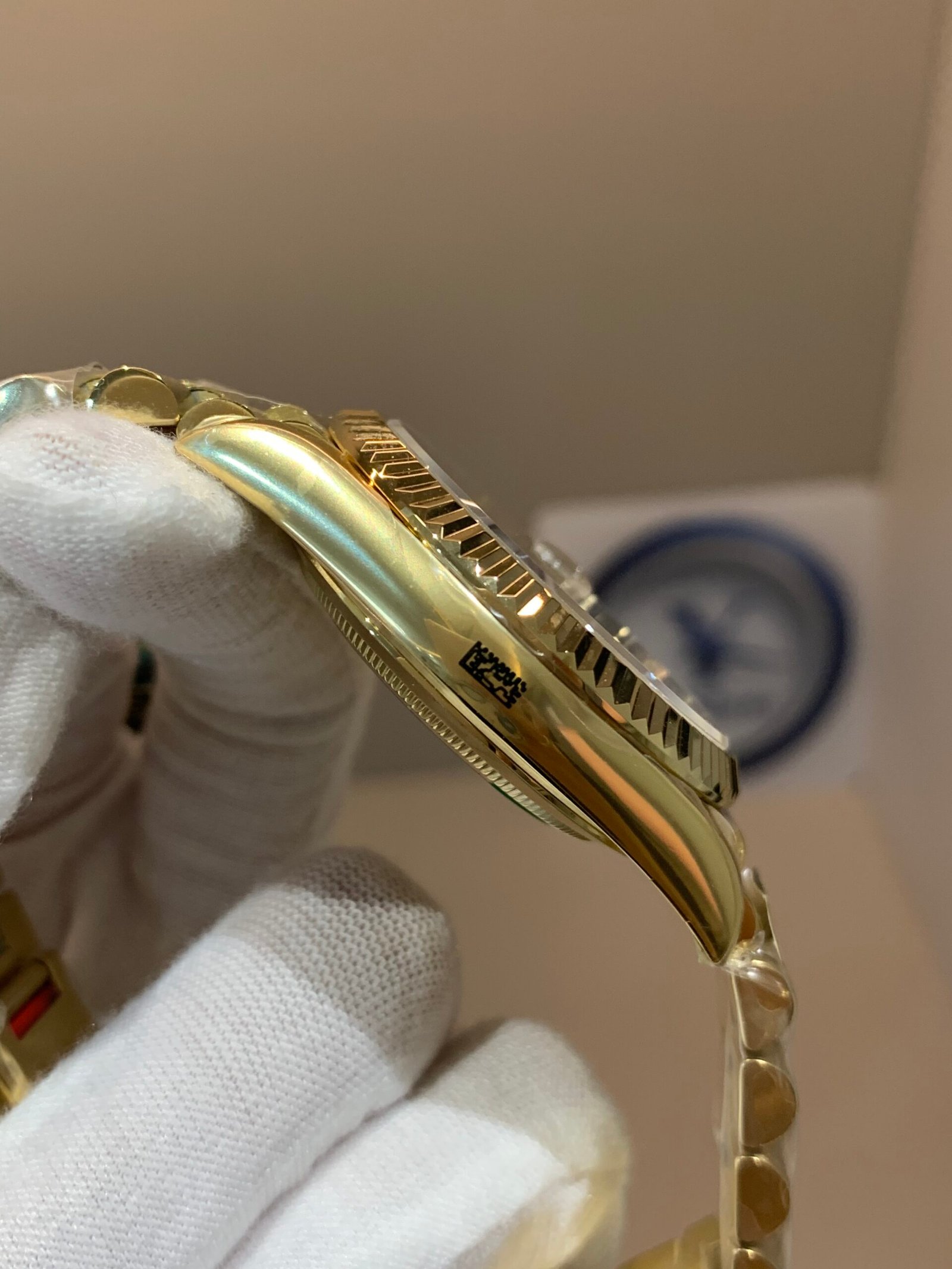 The classic fluted bezel is masterfully crafted in 18K yellow gold, with sharp, even grooves that catch light beautifully and create the signature Day-Date profile. Each flute is precisely cut to match the genuine Rolex specifications, adding depth and dimensionality to the watch’s appearance.