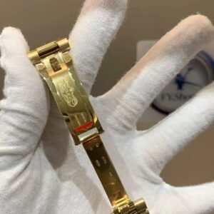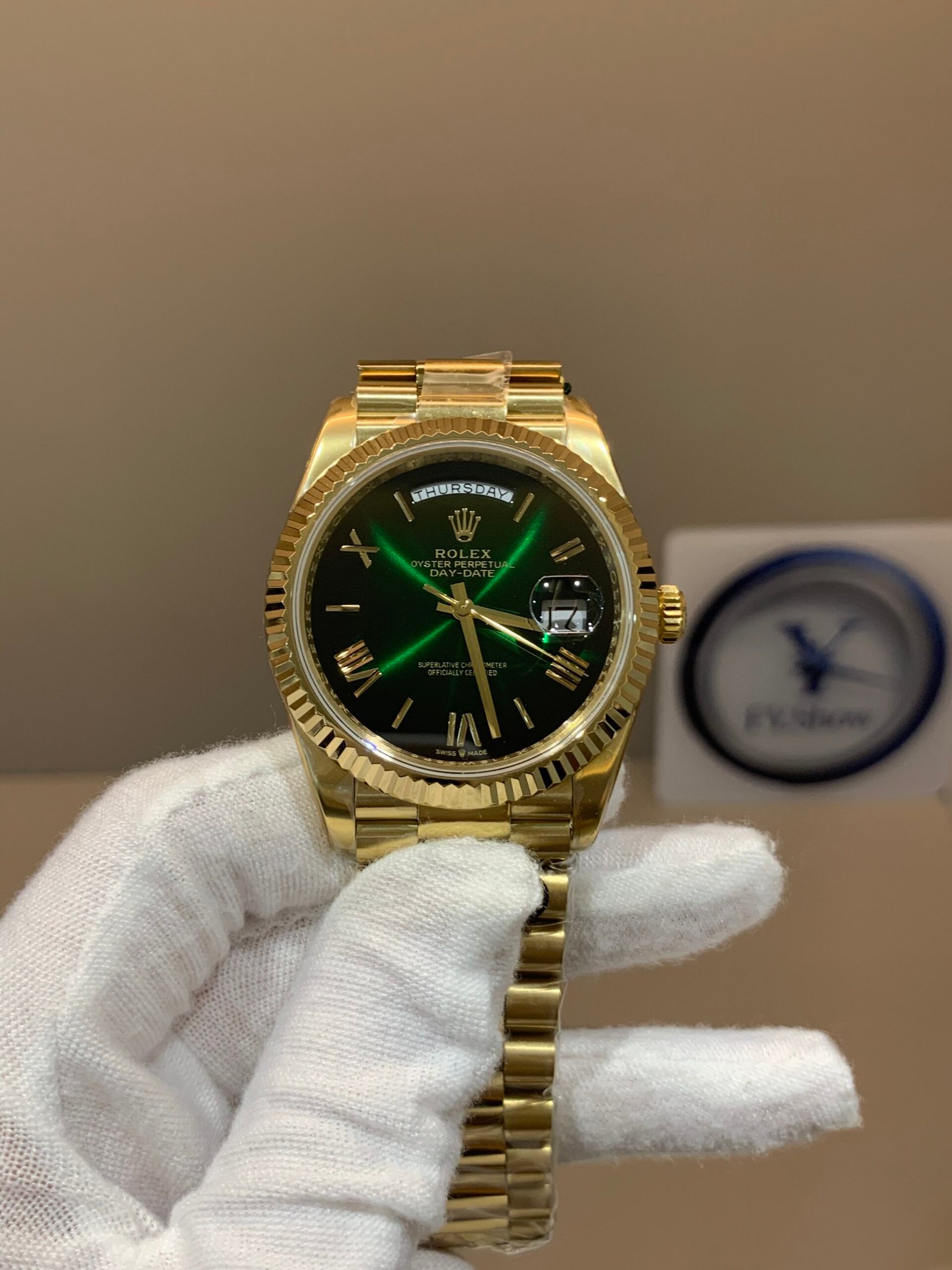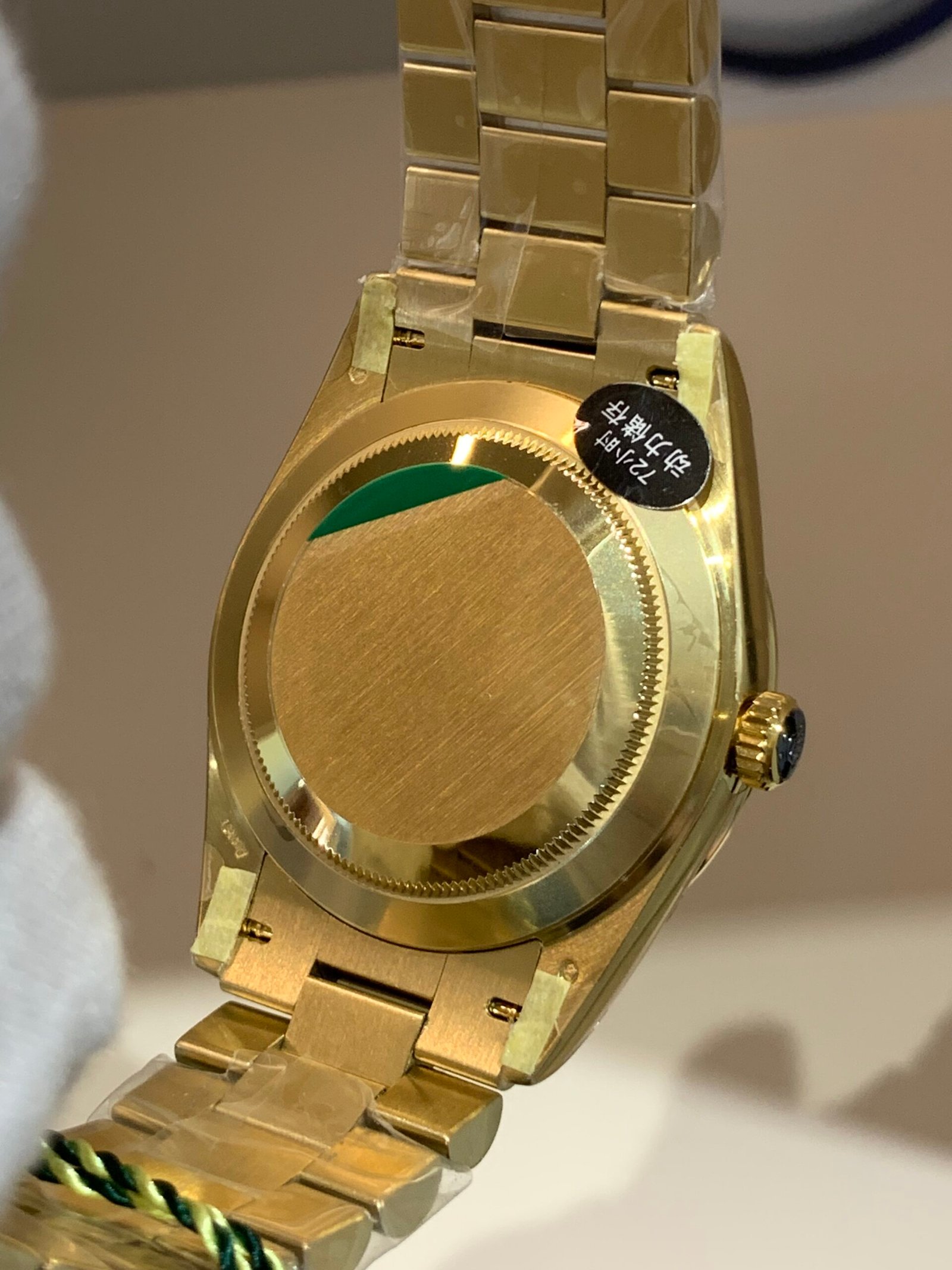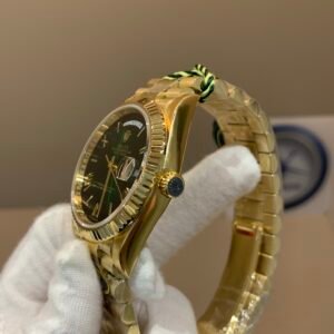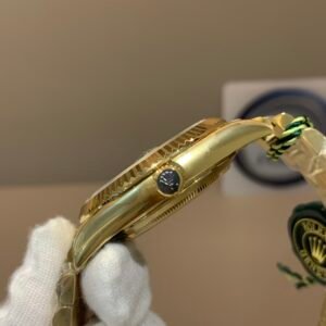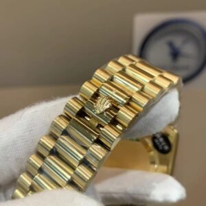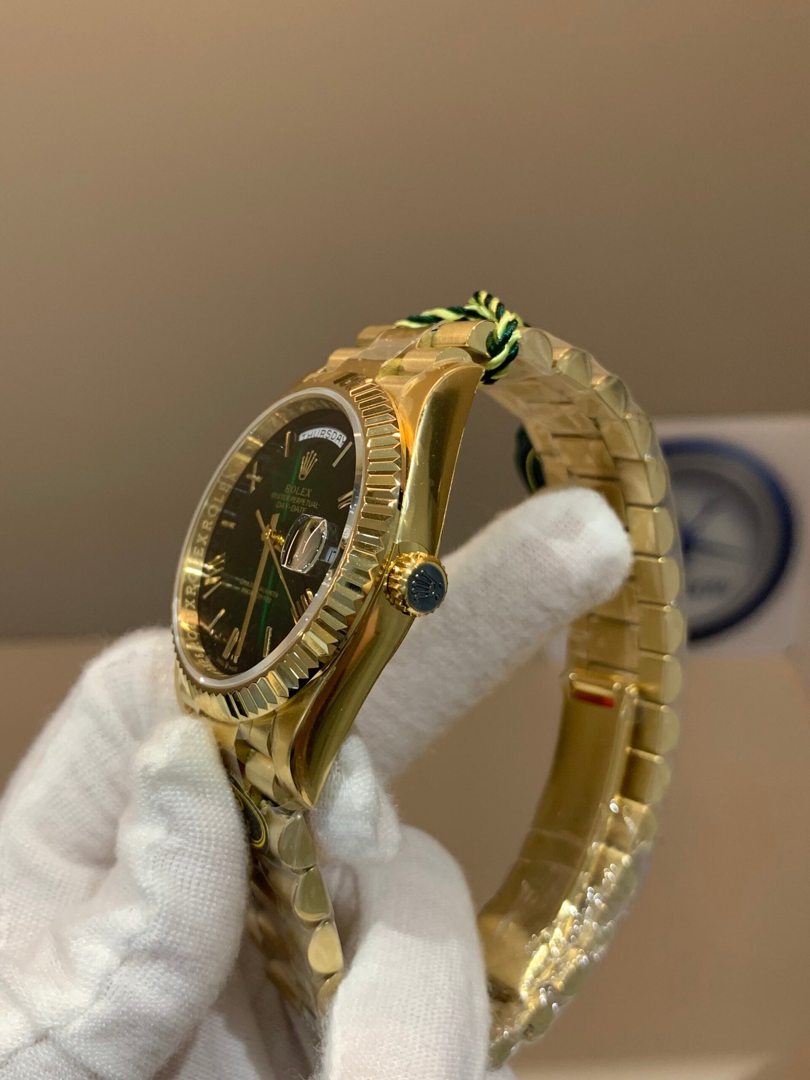 The classic fluted bezel is masterfully crafted in 18K yellow gold, with sharp, even grooves that catch light beautifully and create the signature Day-Date profile. Each flute is precisely cut to match the genuine Rolex specifications, adding depth and dimensionality to the watch’s appearance.