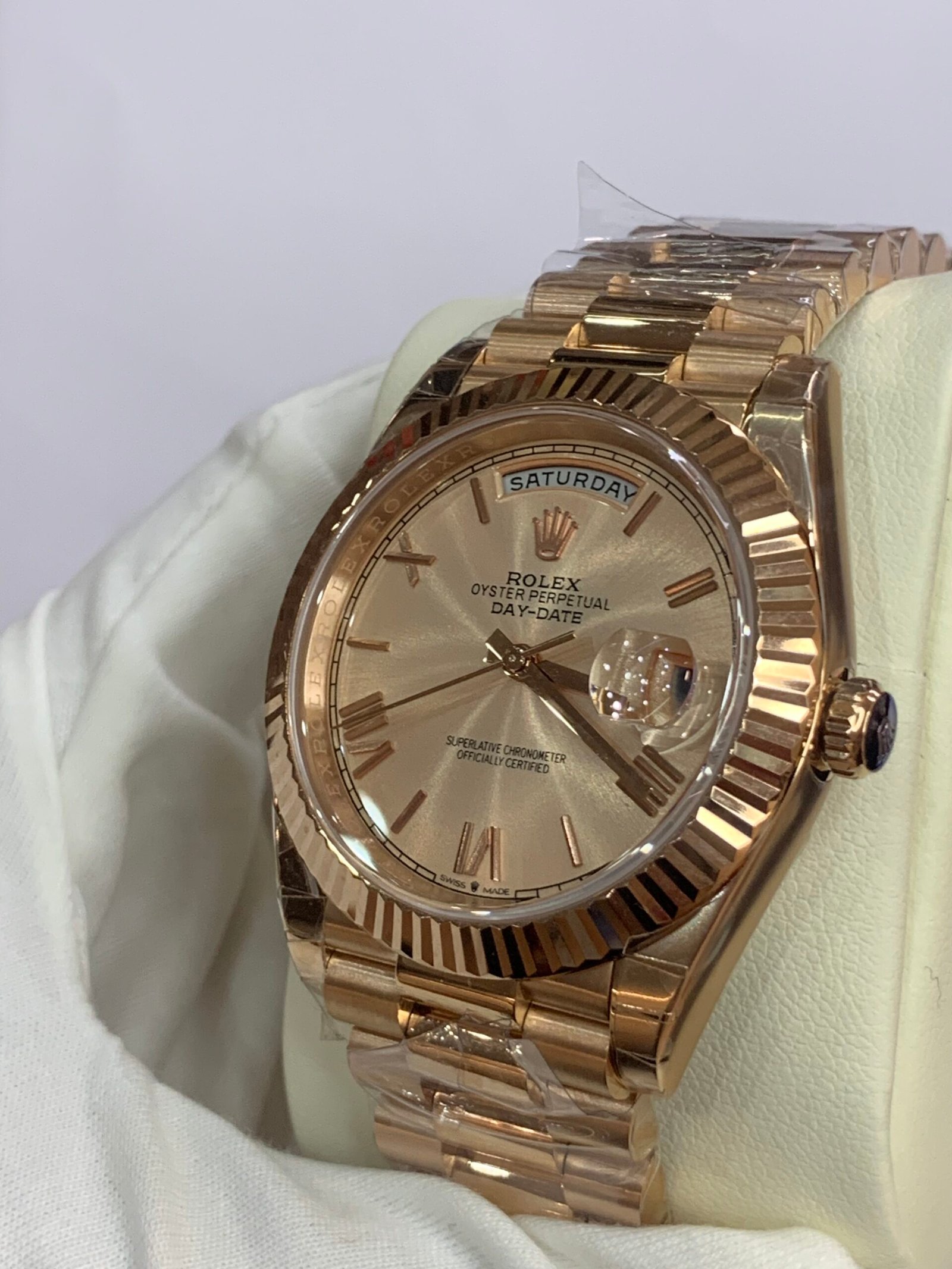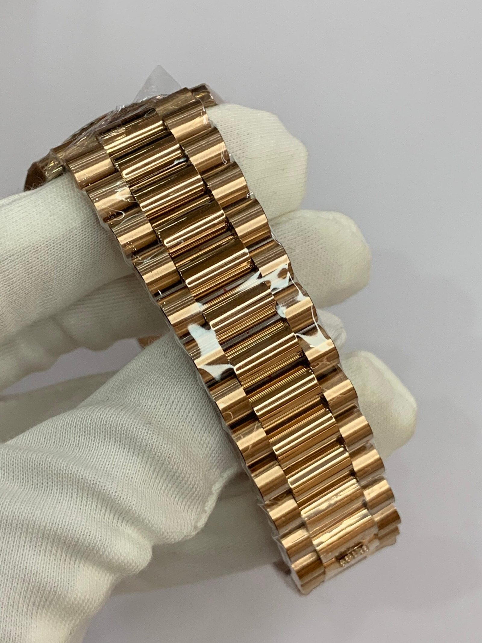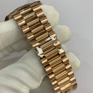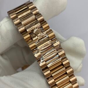 18K Yellow Gold 40mm Oyster Case. VSF’s master‑level machining: perfectly polished fluted bezel, crisp brushing on the lugs, solid end links for the President bracelet, and Twinlock double‑waterproof screw‑down crown with deep engravings. Monobloc middle case, screw‑down case back for 100m water resistanceRolex.