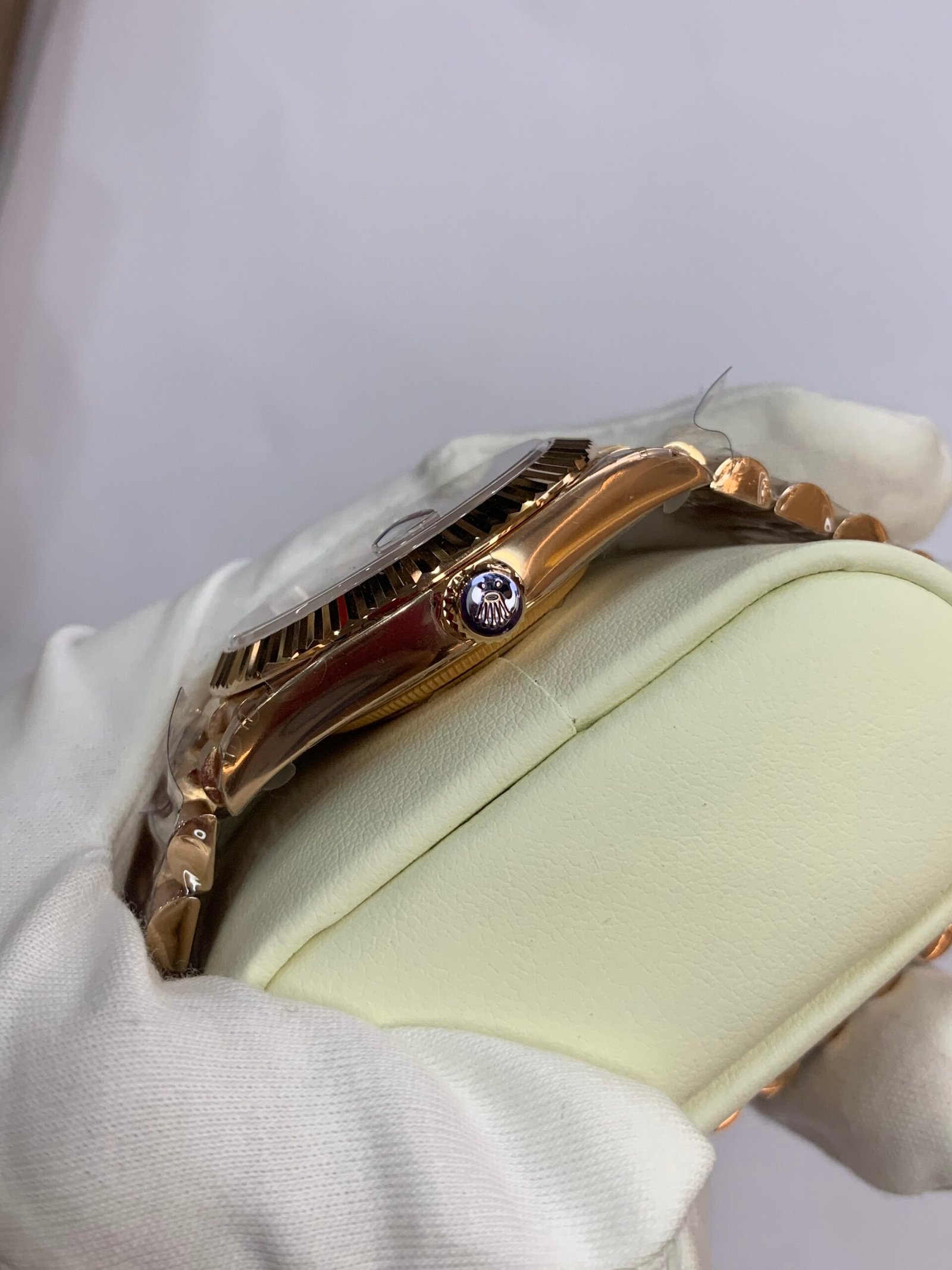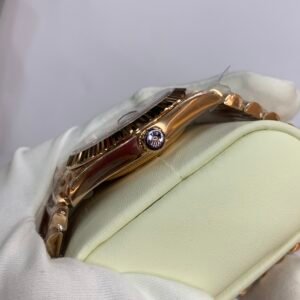 Fluted 18K Gold Bezel. Rolex’s signature—precision‑cut vertical fluting, mirror‑polished to a brilliant shine, framing the dial with timeless opulence. Correct curvature relative to the mid‑case, no gaps or misalignmentRolex.