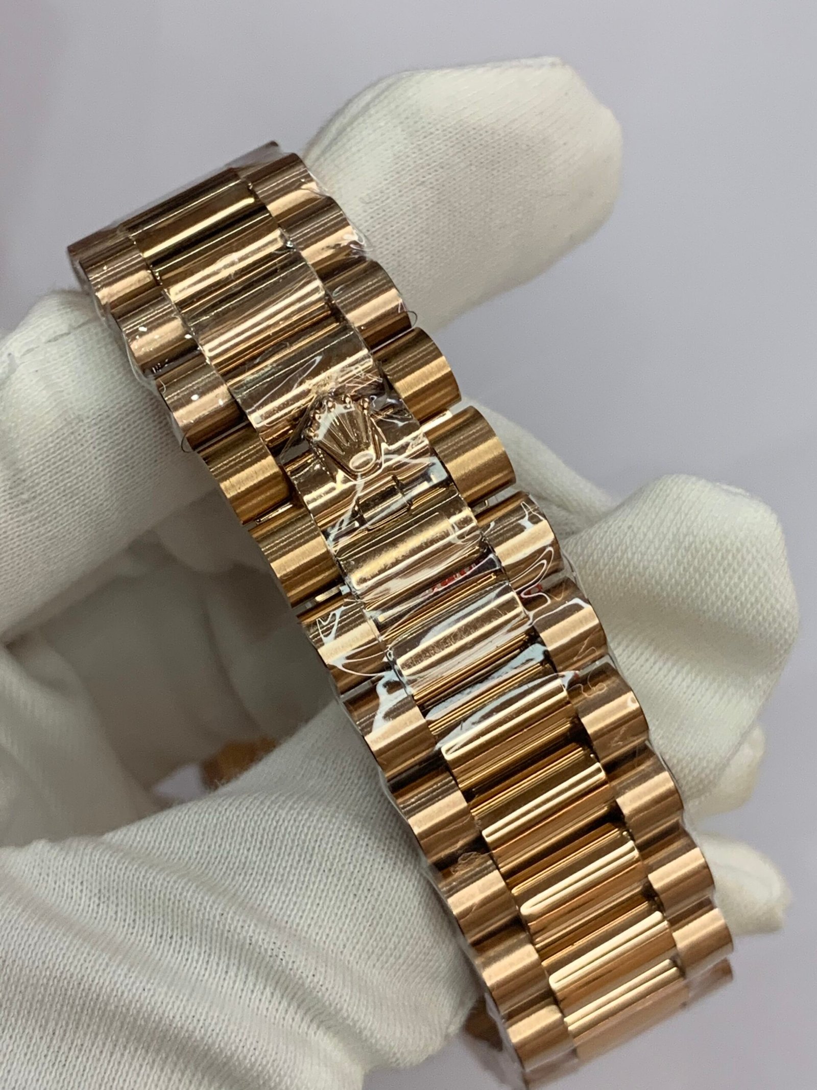 18K Gold President Bracelet. Semi‑circular three‑piece links, hand‑polished for exceptional comfort. Hidden Crown folding clasp with easy micro‑adjustment, matching the gold case and bezel in finish and weightRolex.