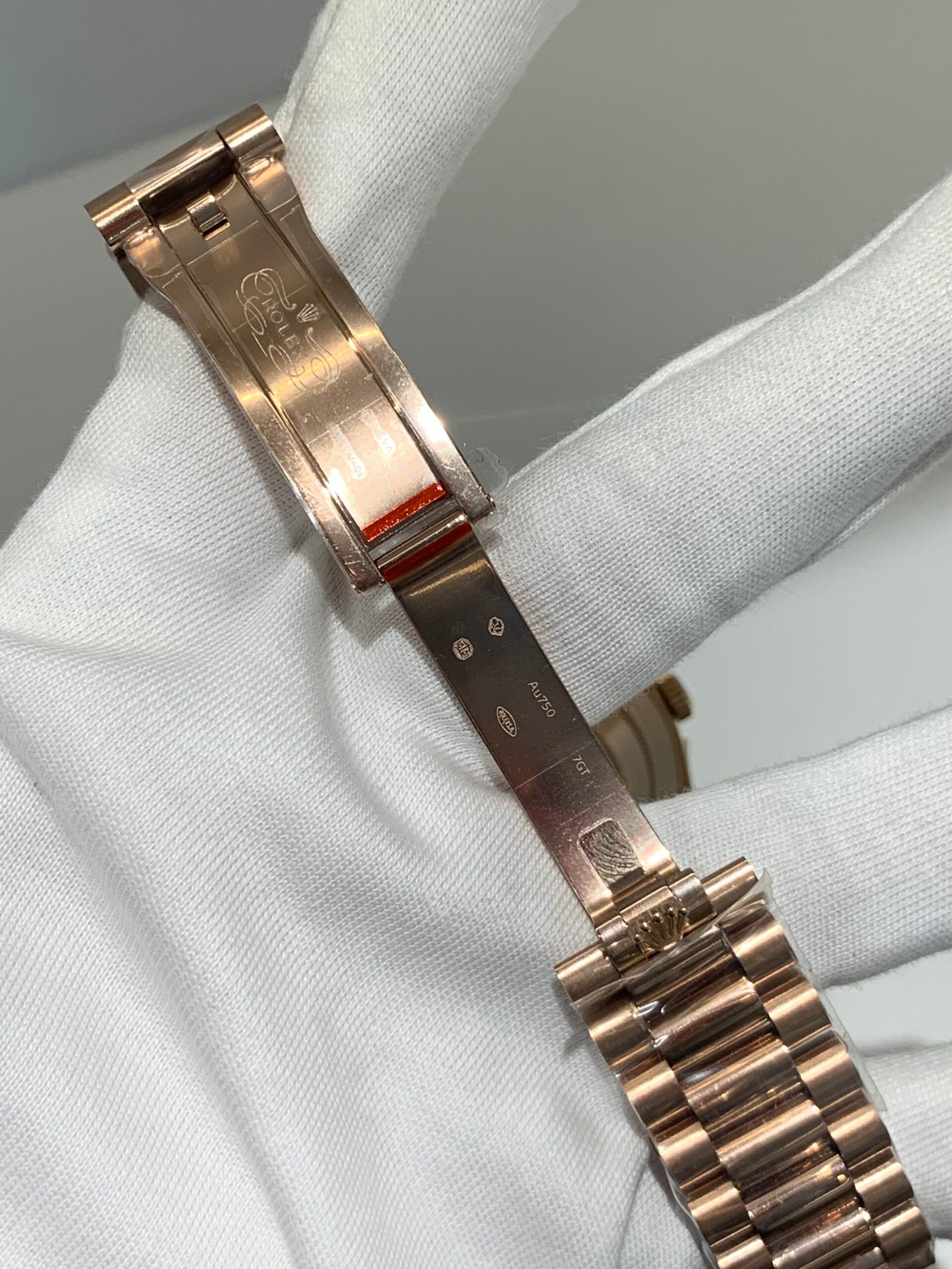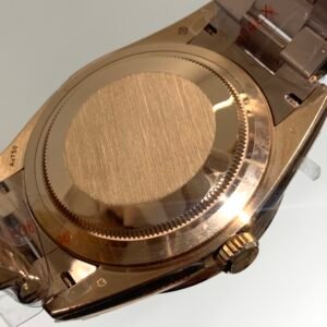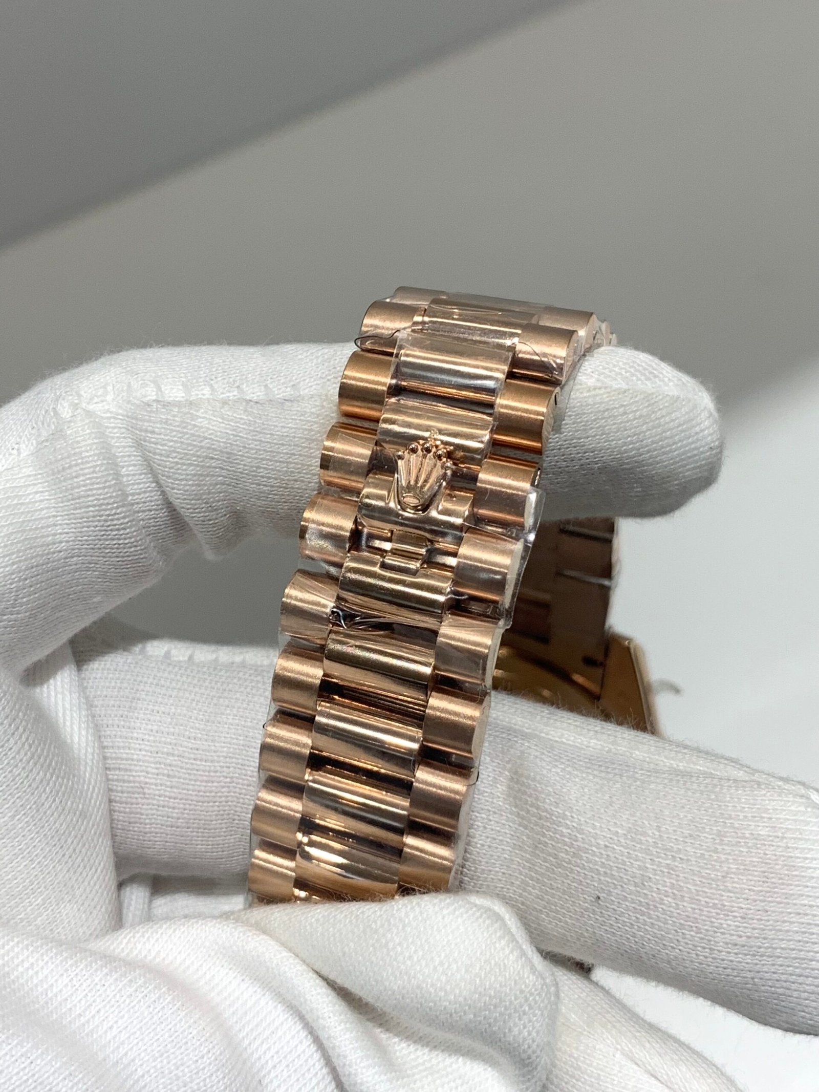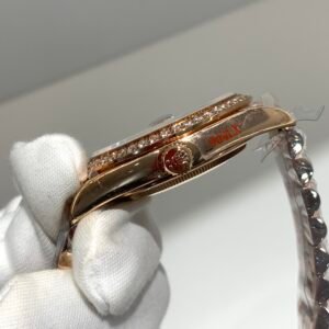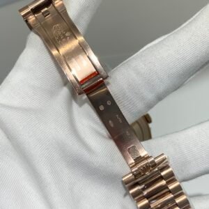 Polished 18K Everose Gold Fluted Bezel A classic fluted bezel crafted from 18K Everose gold, perfectly polished to a mirror shine—an iconic Rolex signature exclusive to Day-Date models. It frames the smoky green dial without distraction and maintains the correct curvature relative to the mid-case, embodying the genuine’s distinguished and modern design.