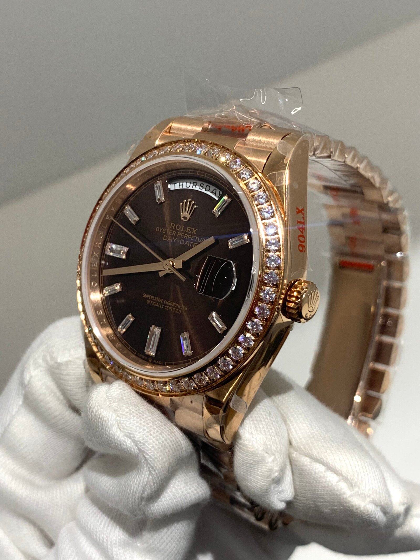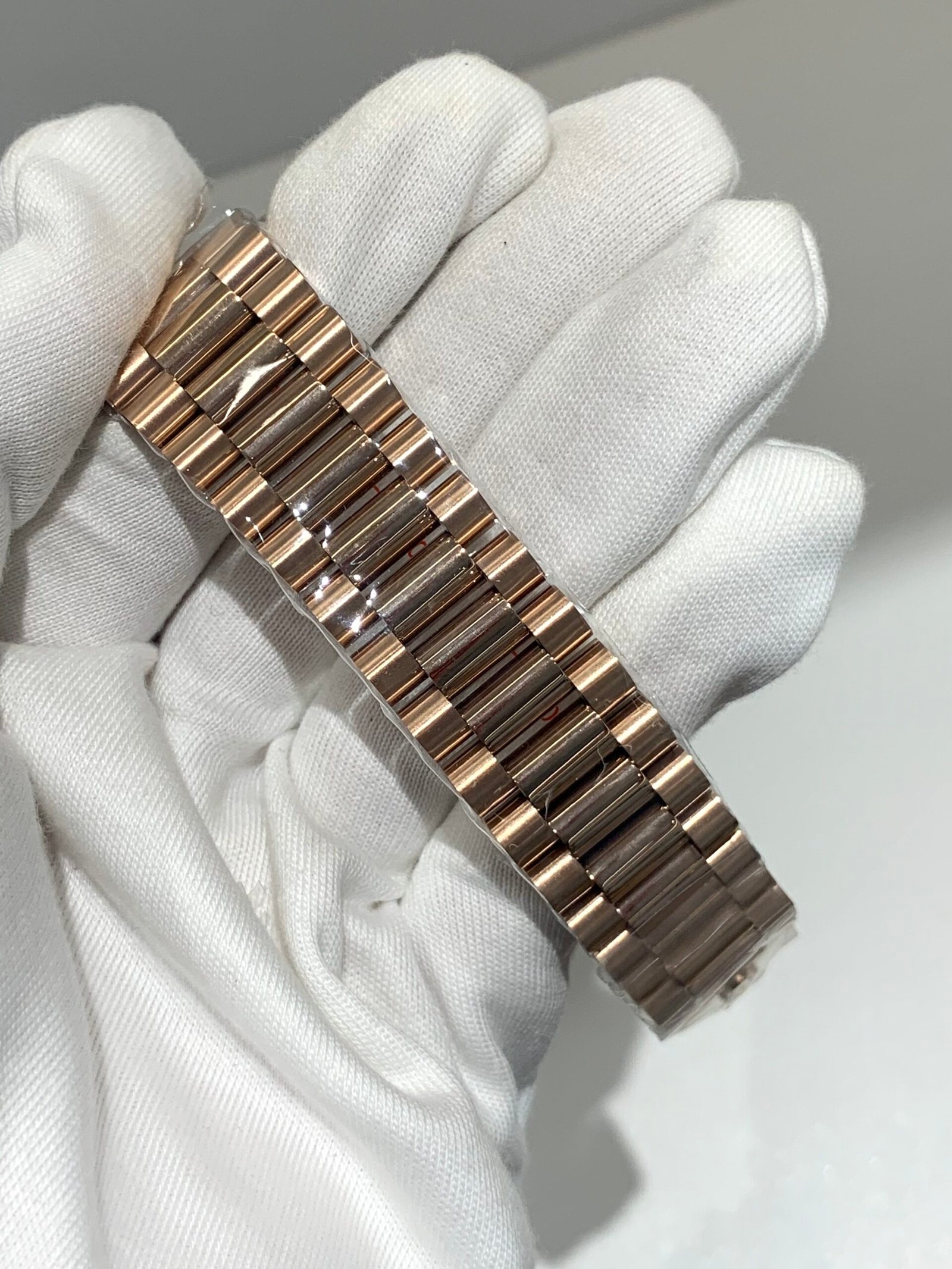 18K Everose Gold & 904L Oystersteel Finish VSF continues its dominance in case machining. The combination of 18K Everose gold and 904L stainless steel features industry-leading brushing on the steel lugs and polished rose gold accents, with a buttery smooth President bracelet taper that feels identical to the genuine article on the wrist, embodying the model’s warm luxury and comfortable wearing experience.