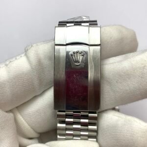 The silver sunray base exudes refined elegance, with a subtle radiant finish that shifts beautifully in light. Applied hour markers are polished to a mirror shine, filled with Swiss-grade luminous material for reliable low-light readability. VSF’s dial printing is razor-sharp—Rolex coronet, “Oyster Perpetual,” and “Superlative Chronometer” text are perfectly sized and aligned, outperforming lesser factories.