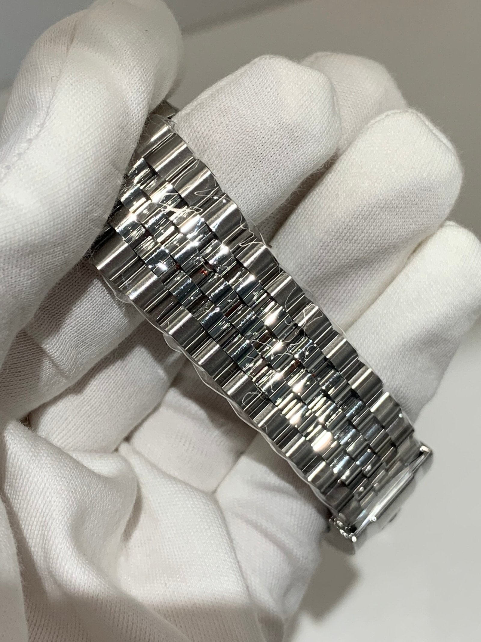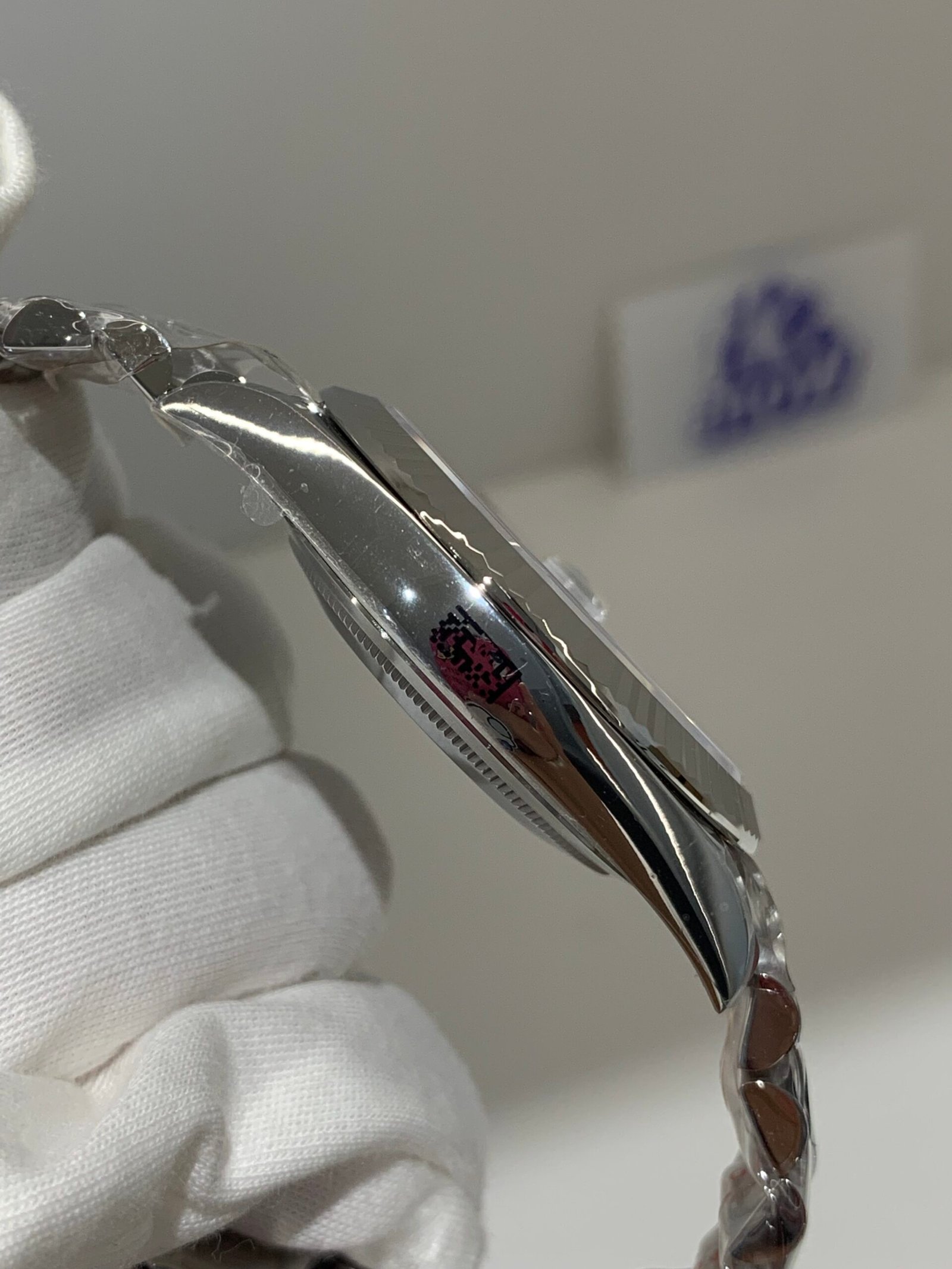 The silver sunray base radiates refined elegance, with a subtle luminous finish that shifts beautifully in light. Applied hour markers are set with sparkling Swarovski crystals, polished to a brilliant shine, with Swiss-grade luminous fill in the gaps for reliable low-light readability. VSF’s dial printing is razor-sharp—Rolex coronet, “Oyster Perpetual,” and “Superlative Chronometer” text are perfectly sized and aligned, outclassing lesser factories.