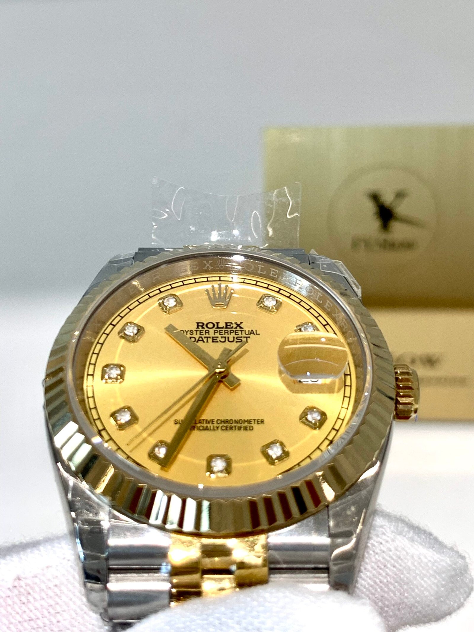 Warm, rich champagne sunray finish that radiates light at every angle. Applied diamond hour markers with genuine-style settings, clean gold hands, and Chromalight blue lume for legibility. Date window at 3 o’clock with sharp printing and correct spacing.