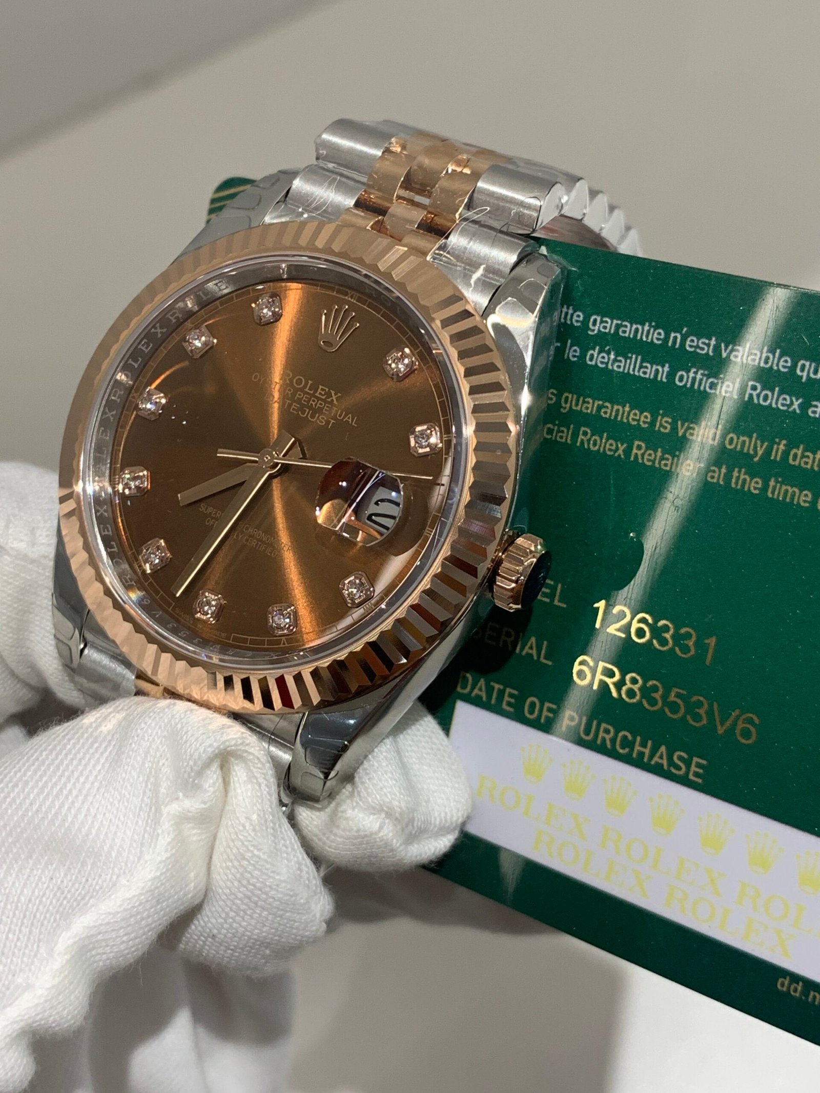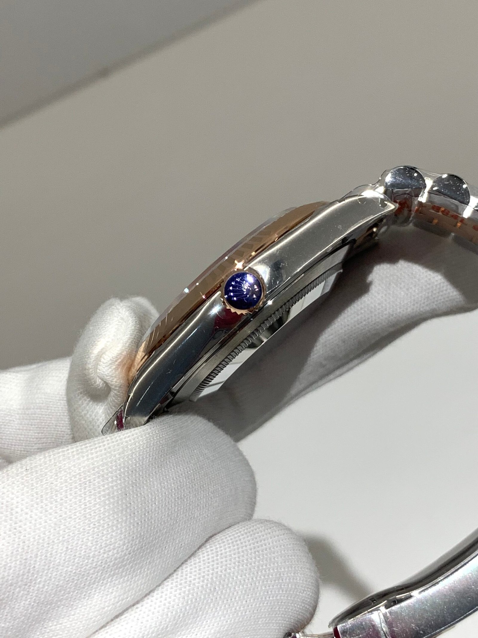 Crystal Clarity VSF is unrivaled in crystal production. The sapphire is incredibly clear, with no milky ring effect (white edge) and correct internal AR coating, making the silver sunburst dial pop in any lighting. The crystal’s domed shape and date magnifier are true to genuine, with precise edge polishing, ensuring optimal readability in all environments while complementing the Everose gold details.