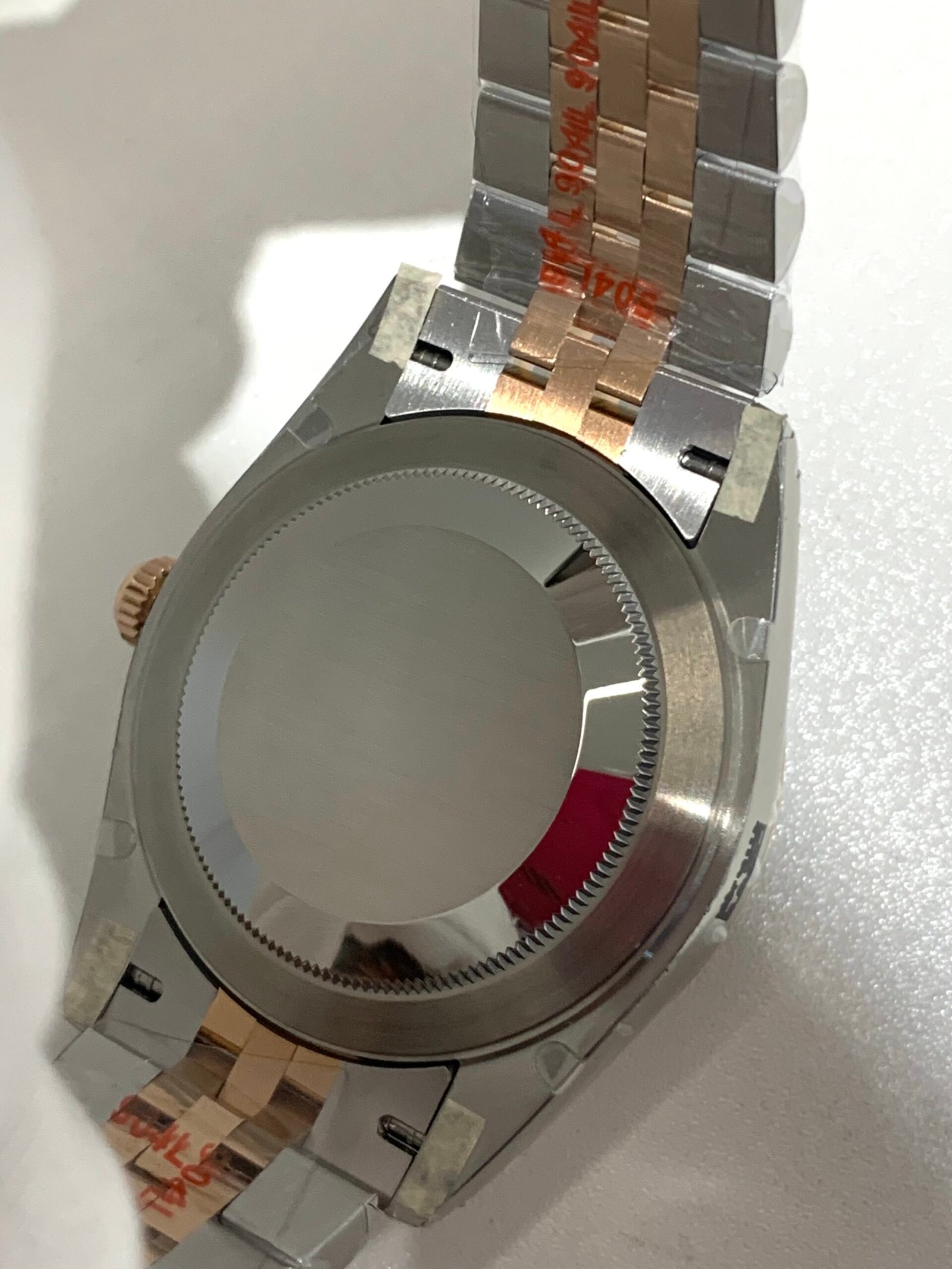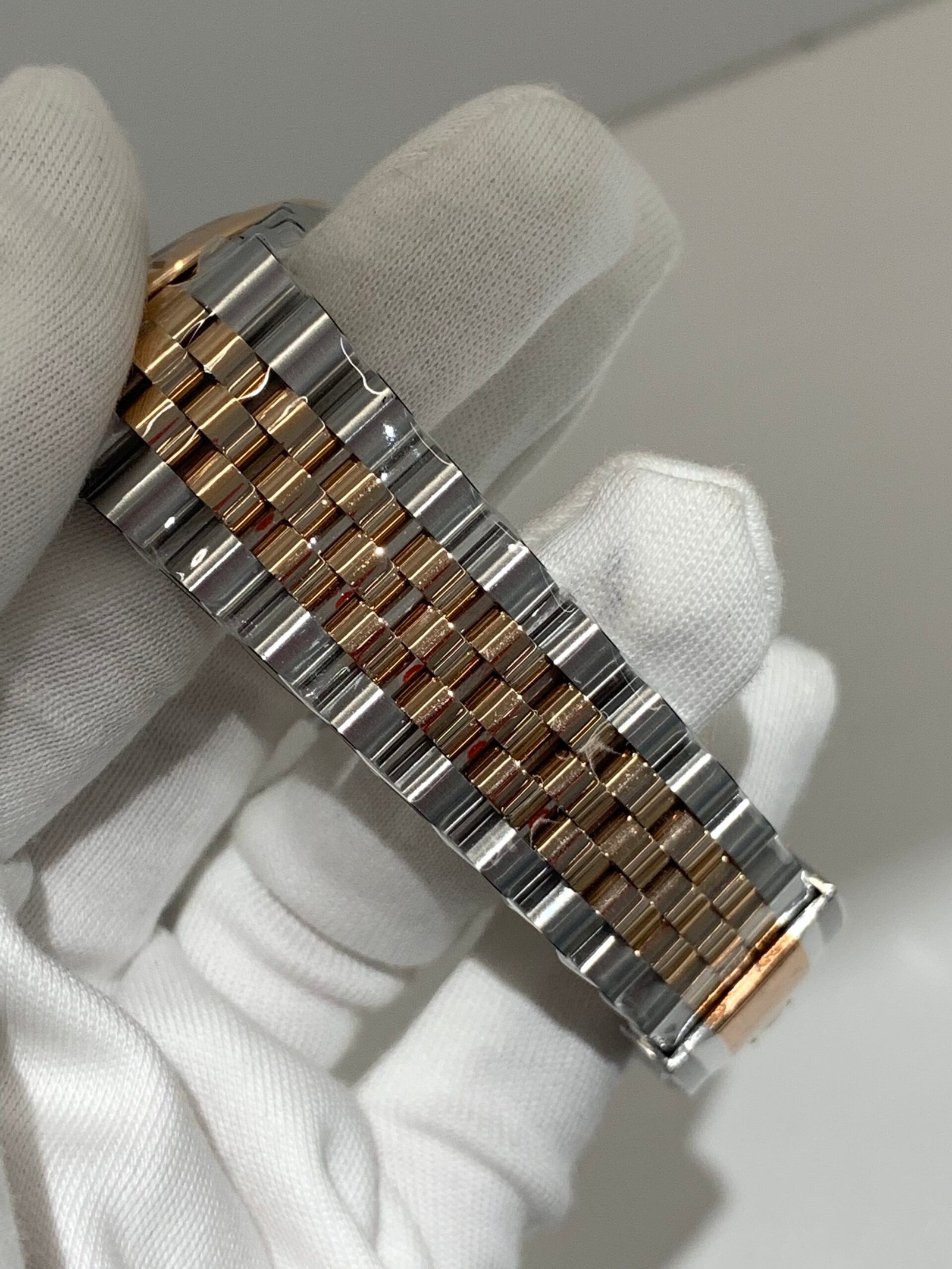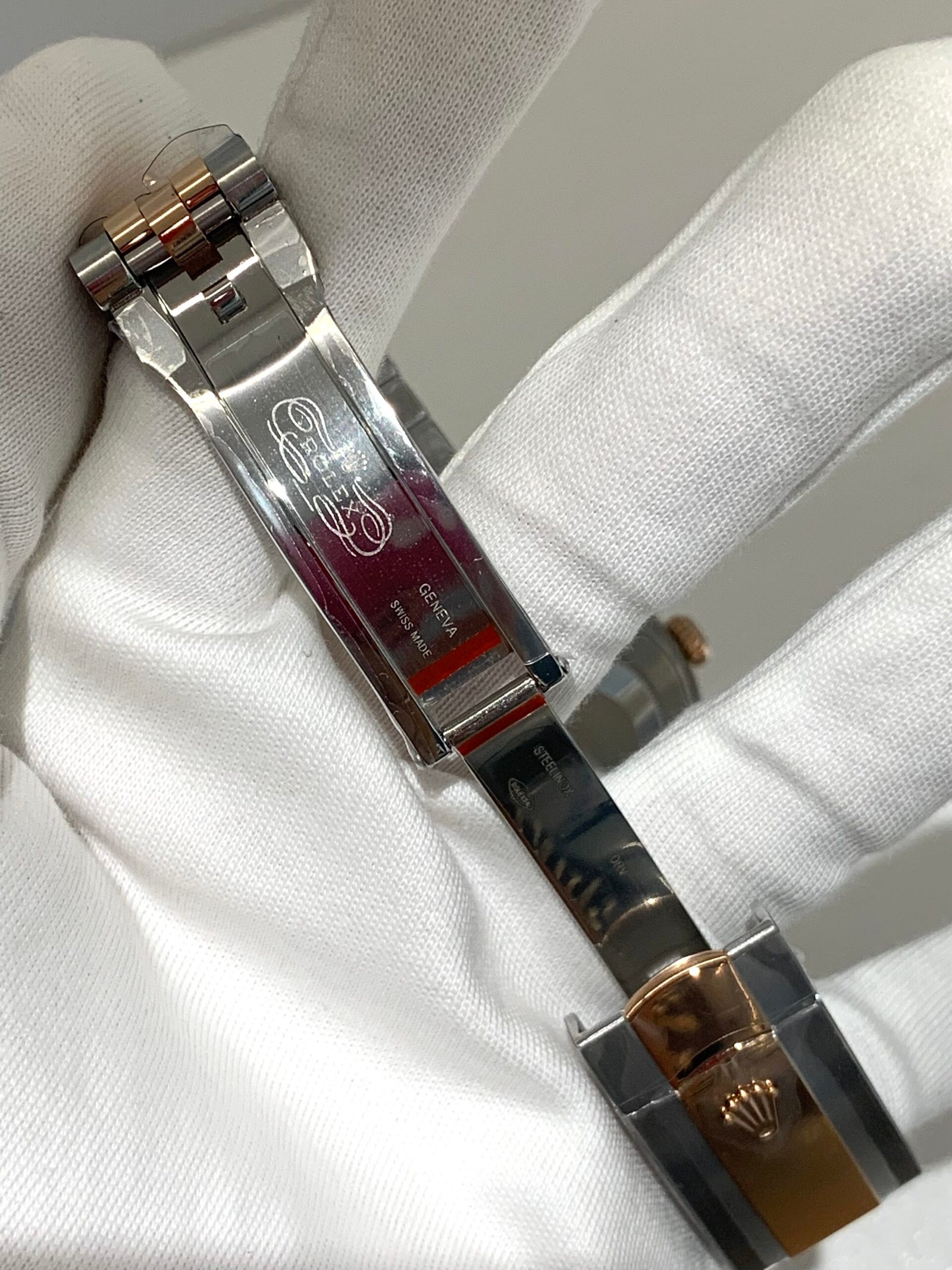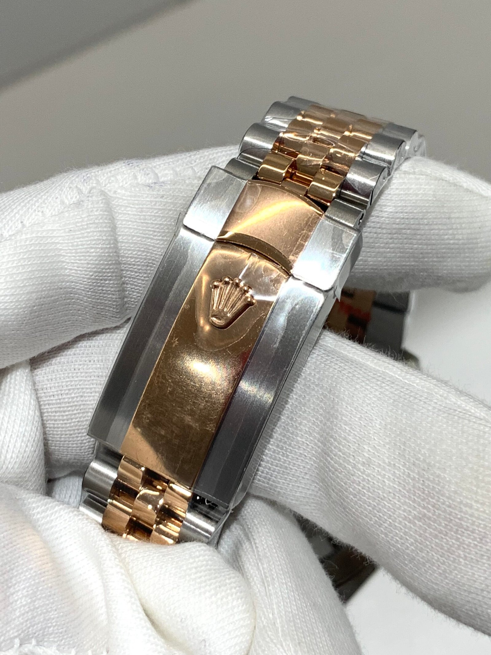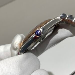 18K Everose Gold & 904L Oystersteel Finish VSF continues its dominance in case machining. The combination of 18K Everose gold (warm rose tone, true to genuine) and 904L stainless steel features industry-leading brushing on the steel lugs and polished rose gold accents, with a buttery smooth bracelet taper that feels identical to the genuine article on the wrist. The bracelet clasp is perfectly finished, with seamless engagement and correct branding, blending luxury warmth and durability seamlessly.