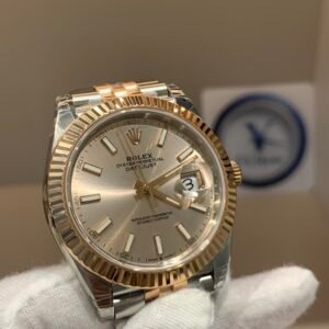 The warm, sunburst-finished Sundust dial shimmers with golden tones in light, while the 18ct Everose gold index hour markers are precisely applied. The 18ct Everose gold hands and hour markers are filled with long-lasting Chromalight blue lume, ensuring perfect readability in low light. The date window at 3 o’clock features the iconic Cyclops magnification lens (2.5x) for easy reading.