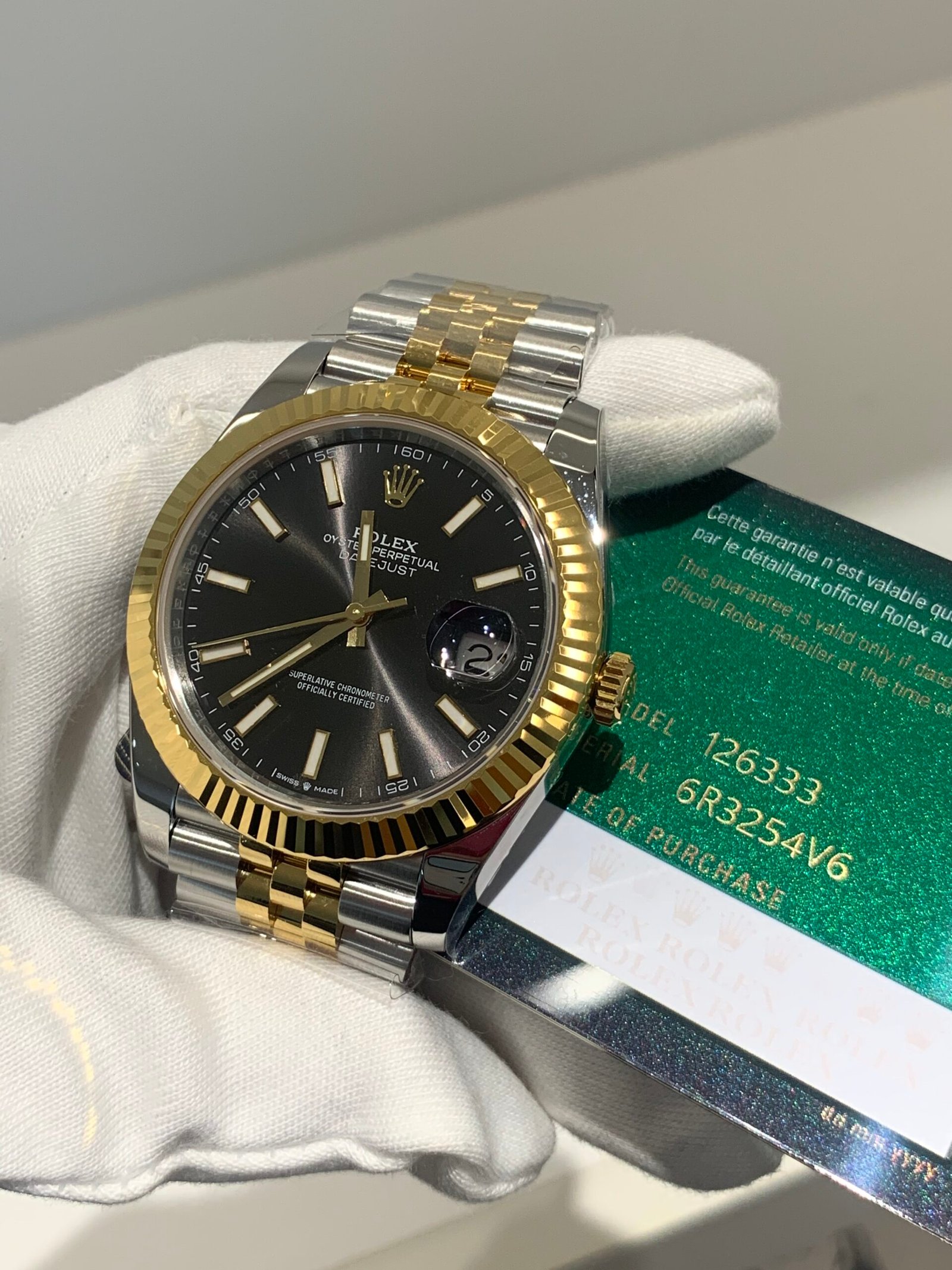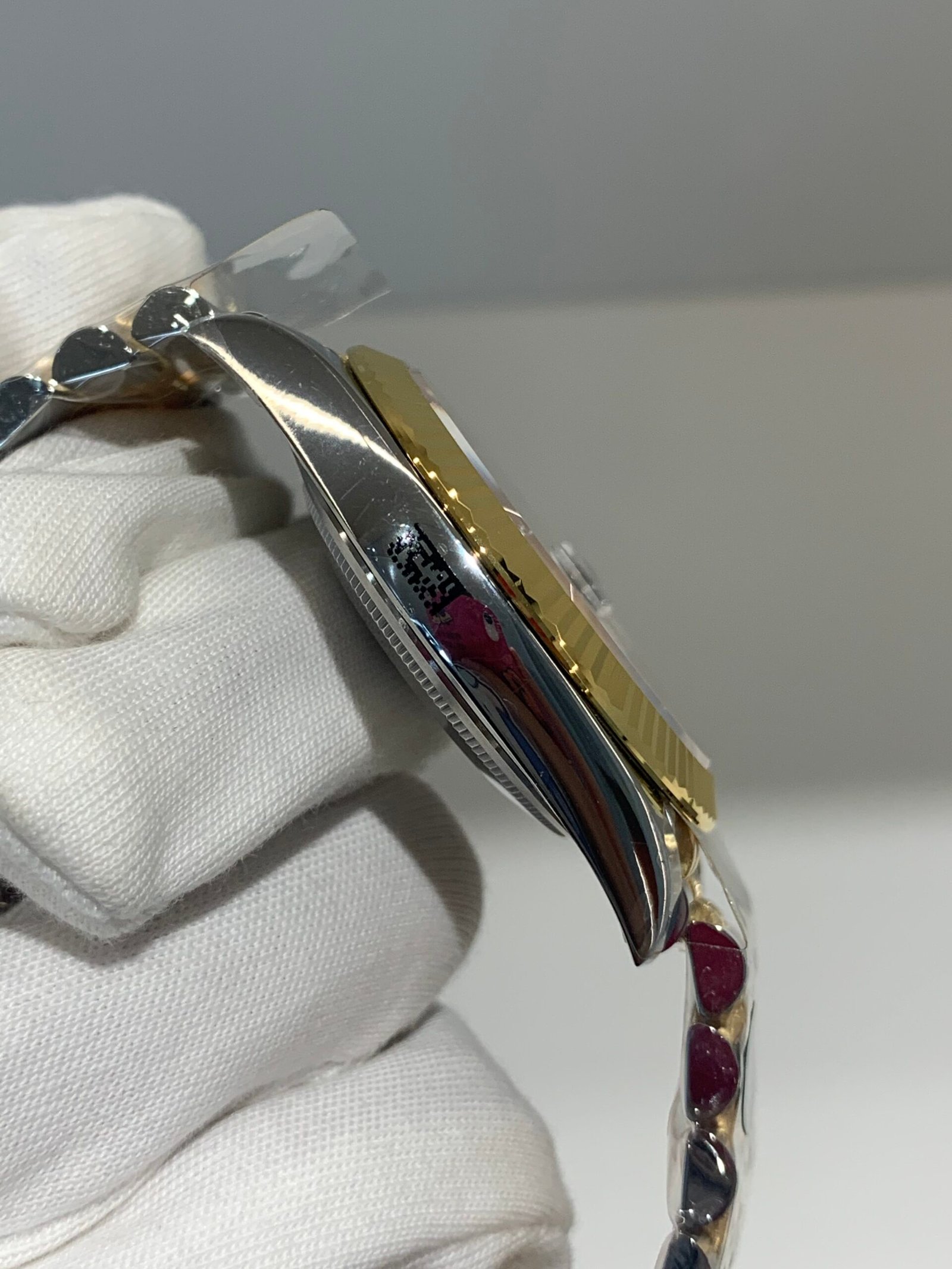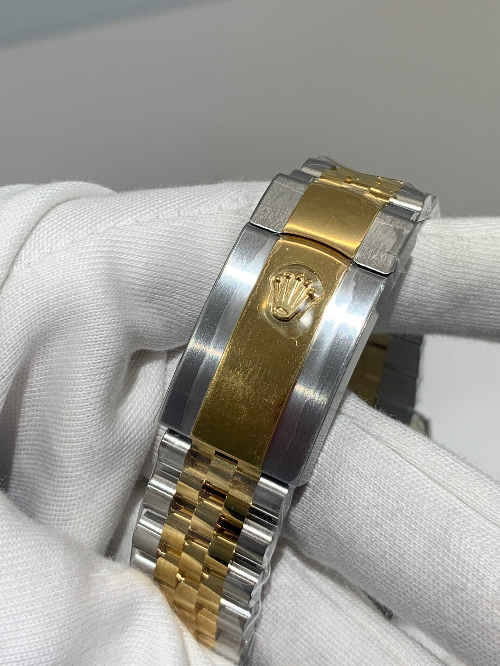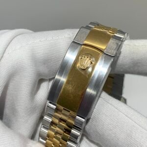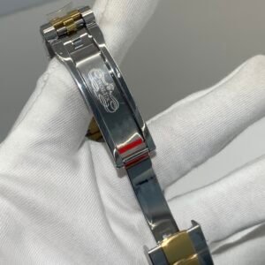 18K Yellow Gold & 904L Oystersteel Finish VSF continues its dominance in case machining. The combination of 18K yellow gold (warm, radiant tone, true to genuine) and 904L stainless steel—known as Yellow Rolesor, a iconic Rolex blend of luxury and strength—features industry-leading brushing on the steel lugs and polished yellow gold accents. The 904L Oystersteel, a high-performance alloy widely used in high technology, aerospace and chemical industries for its maximum corrosion resistance, is extremely durable and maintains its beauty even in harsh environments. The buttery smooth Jubilee bracelet taper feels identical to the genuine article on the wrist, with a perfectly finished clasp that ensures seamless engagement and correct branding, blending warm luxury and rugged durability seamlessly.