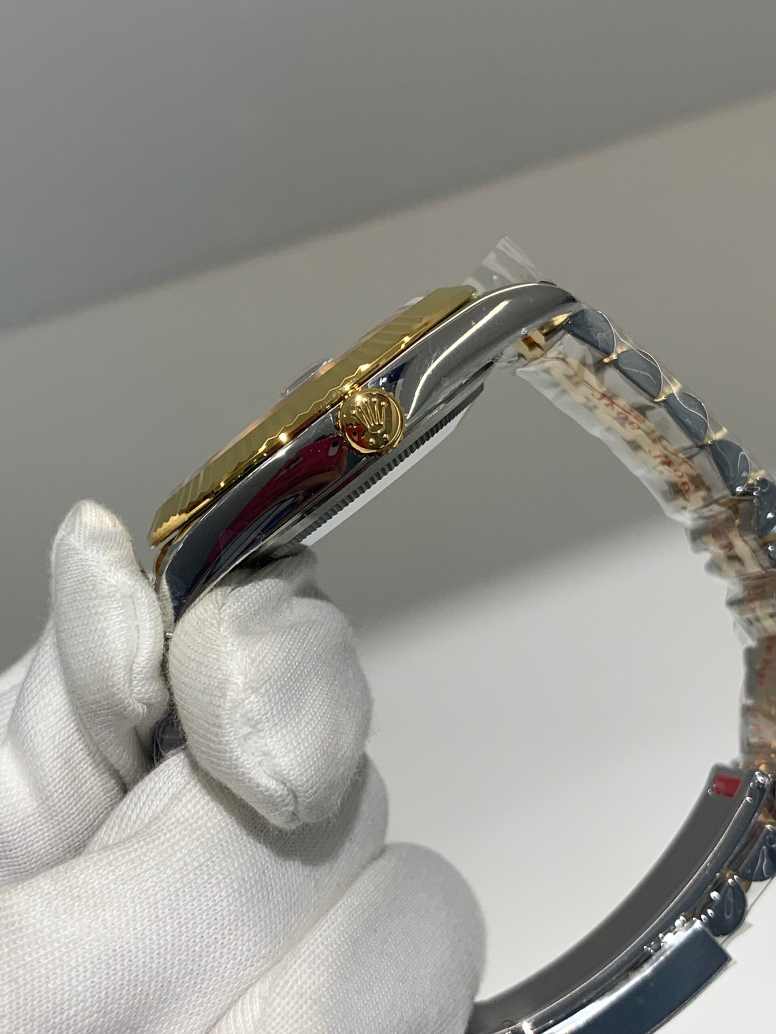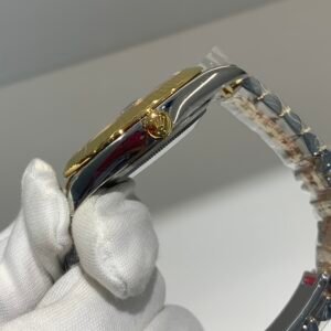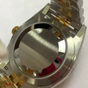 Polished 18K Yellow Gold Fluted Bezel A classic fluted bezel crafted from 18K yellow gold, perfectly polished to a mirror shine—an iconic Rolex signature. Originally designed for functional waterproofing (to screw the bezel onto the case securely), the fluting now serves as a distinguished aesthetic element, framing the silver sunburst dial elegantly without distraction and maintaining the correct curvature relative to the mid-case, matching the genuine’s proportions exactly. The polished yellow gold bezel complements the bright, elegant tone of the silver dial, highlighting the model’s luxurious and refined temperament and harmonizing with the Yellow Rolesor material blend.