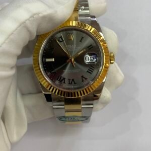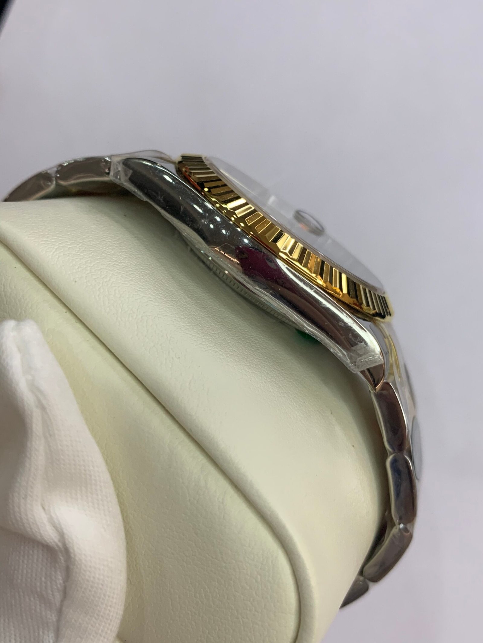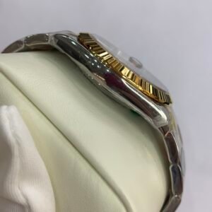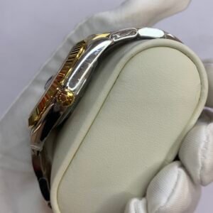 Polished 18K Yellow Gold Fluted Bezel A classic fluted bezel crafted from 18K yellow gold, perfectly polished to a mirror shine—an iconic Rolex signature. Originally designed for functional waterproofing (to screw the bezel onto the case securely), the fluting now serves as a distinguished aesthetic element, framing the champagne sunburst dial elegantly without distraction and maintaining the correct curvature relative to the mid-case, matching the genuine’s proportions exactly. The polished yellow gold bezel complements the warm, radiant tone of the champagne dial, highlighting the model’s luxurious temperament and harmonizing with the Yellow Rolesor material blend.