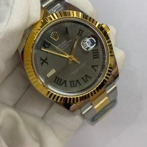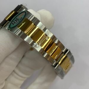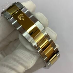 18K Yellow Gold & 904L Oystersteel Finish VSF continues its dominance in case machining. The combination of 18K yellow gold (warm, radiant tone, true to genuine) and 904L stainless steel—known as Yellow Rolesor, a iconic Rolex blend of luxury and strength—features industry-leading brushing on the steel lugs and polished yellow gold accents. The 904L Oystersteel, a high-performance alloy widely used in high technology, aerospace and chemical industries for its maximum corrosion resistance, is extremely durable and maintains its beauty even in harsh environments. The buttery smooth Jubilee bracelet taper feels identical to the genuine article on the wrist, with a perfectly finished clasp that ensures seamless engagement and correct branding, blending warm luxury and rugged durability seamlessly.