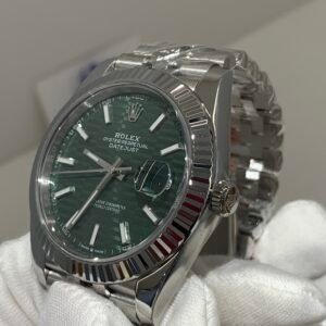 Slate Grey Dial Motif The slate grey base boasts a subtle sunburst finish, catching light to reveal soft gradient details that elevate its sophistication. VSF has achieved crisp, precise printing on the hour markers (matching the genuine Everose gold tone) and logo, with no blurring or misalignment—matching the genuine’s elegant, understated aesthetic perfectly. The date window is perfectly aligned, with a clear magnifier for easy readability.