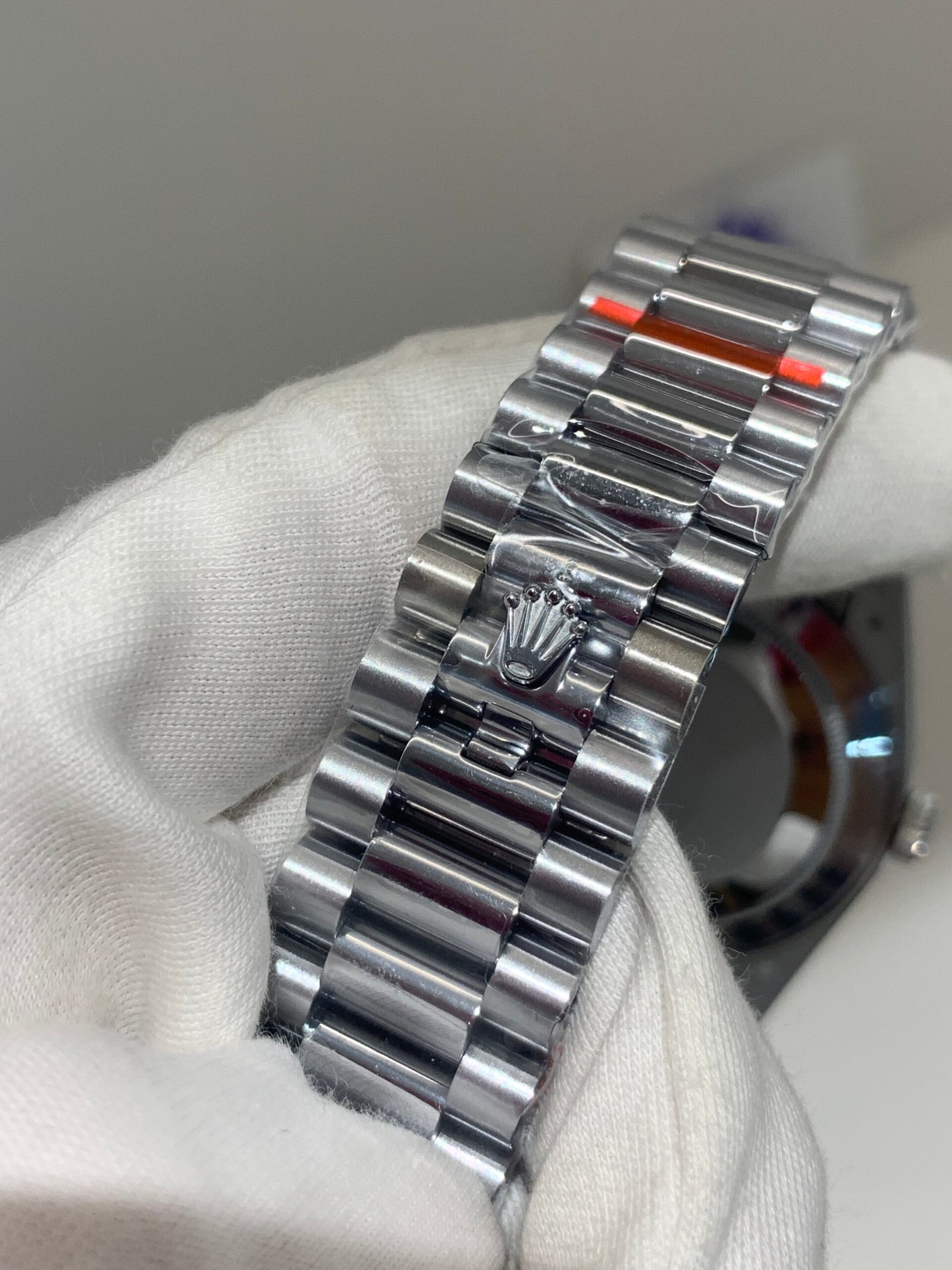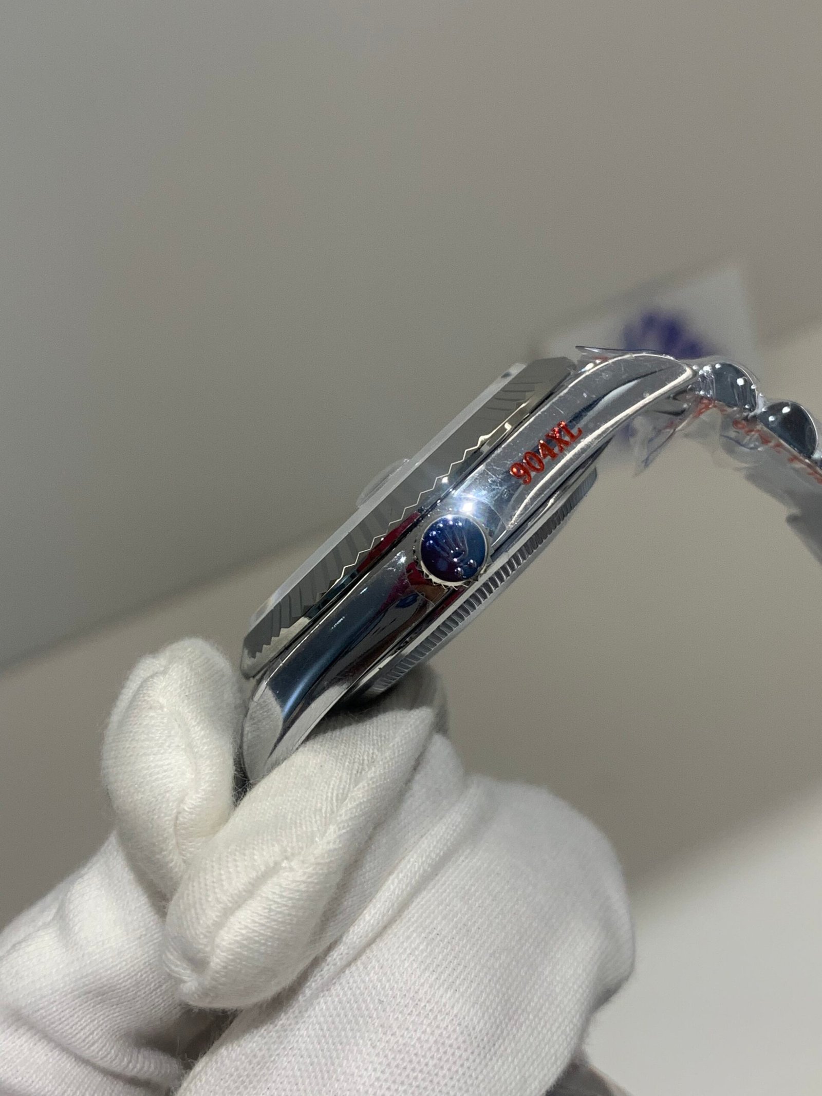 18K White Gold & 904L Oystersteel Finish VSF continues its dominance in case machining. The combination of 18K white gold (cool metallic tone, true to genuine) and 904L stainless steel features industry-leading brushing on the lugs and a buttery smooth bracelet taper that feels identical to the genuine article on the wrist. The bracelet clasp is perfectly polished, with seamless engagement and correct branding.
