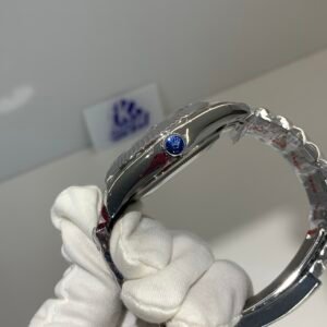 VSF sapphire crystal is incredibly clear, with no milky ring effect and correct internal AR coating, making the smoke-gray dial and diamond markers pop in any lighting.
