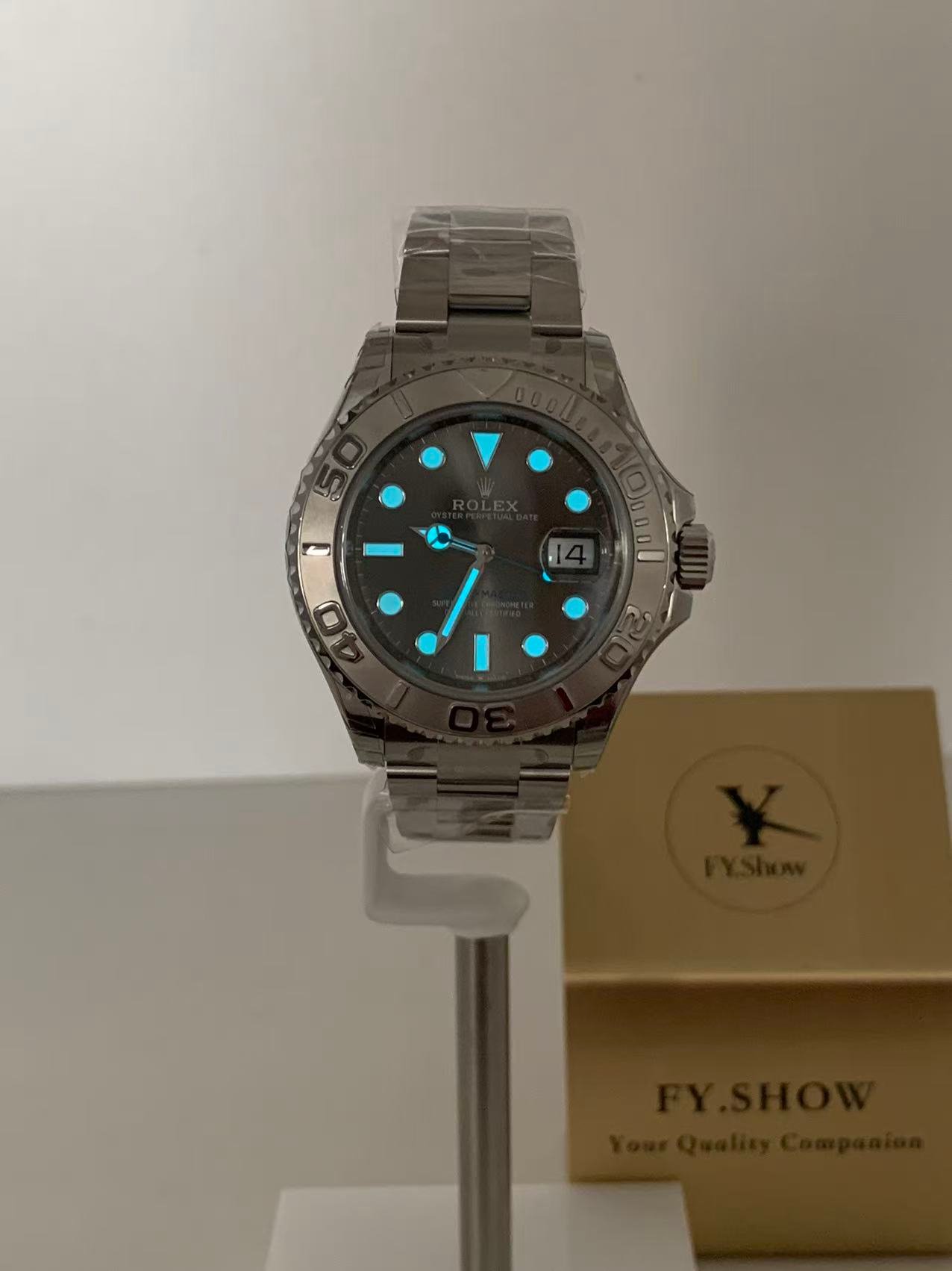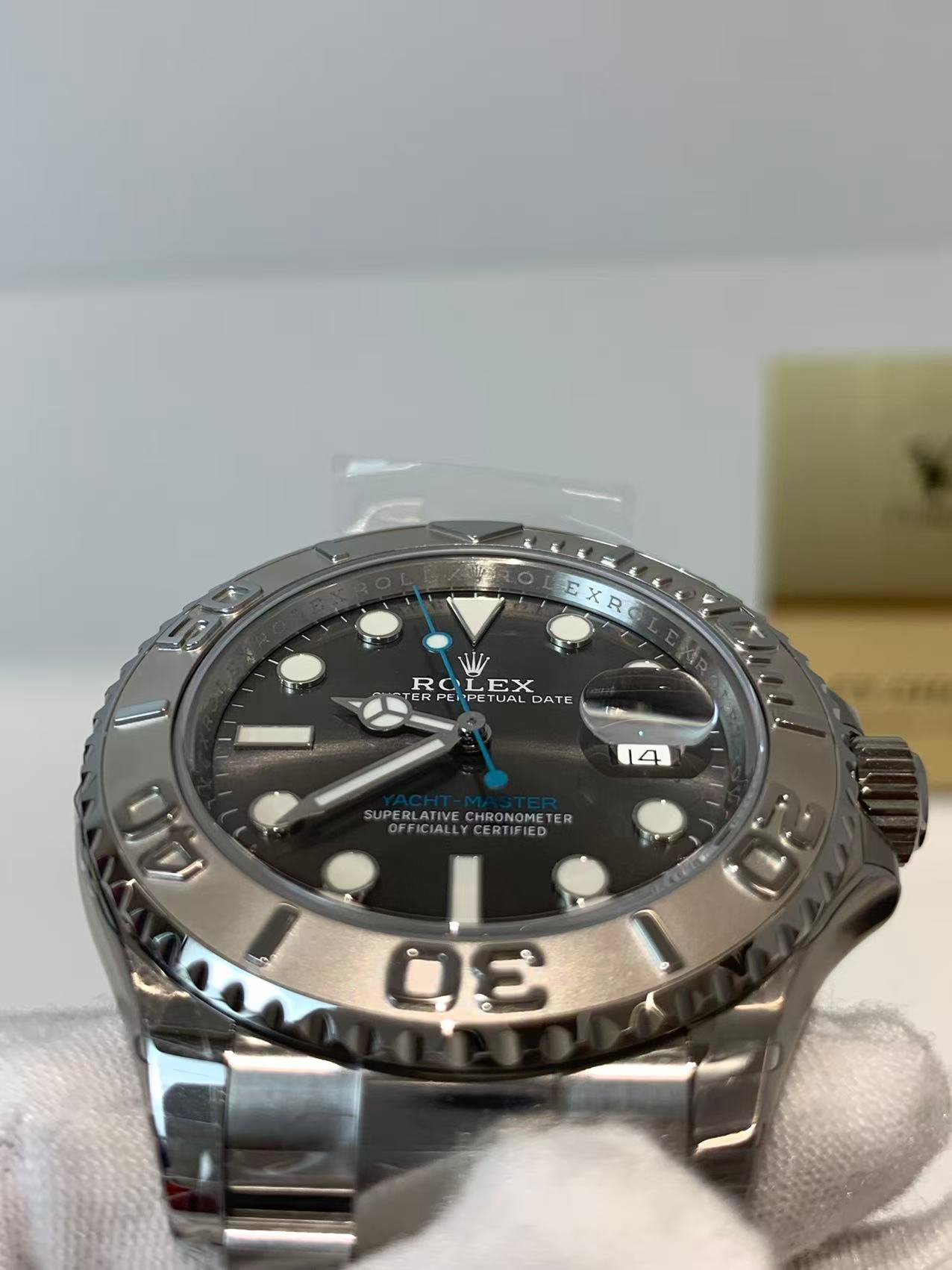 All indices and hands are coated with high-luminosity Chromalight blue lume, matching the genuine’s long-lasting glow intensity and duration. The dial printing is crisp and sharp, with correct “YACHT-MASTER” and Rolex branding font, no fuzzy edges or misaligned text — a level of refinement only top-tier factories achieve.
